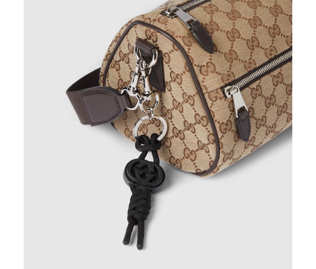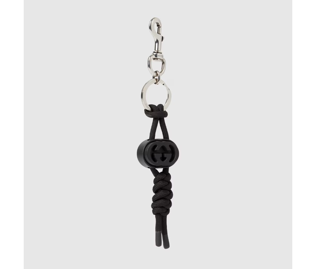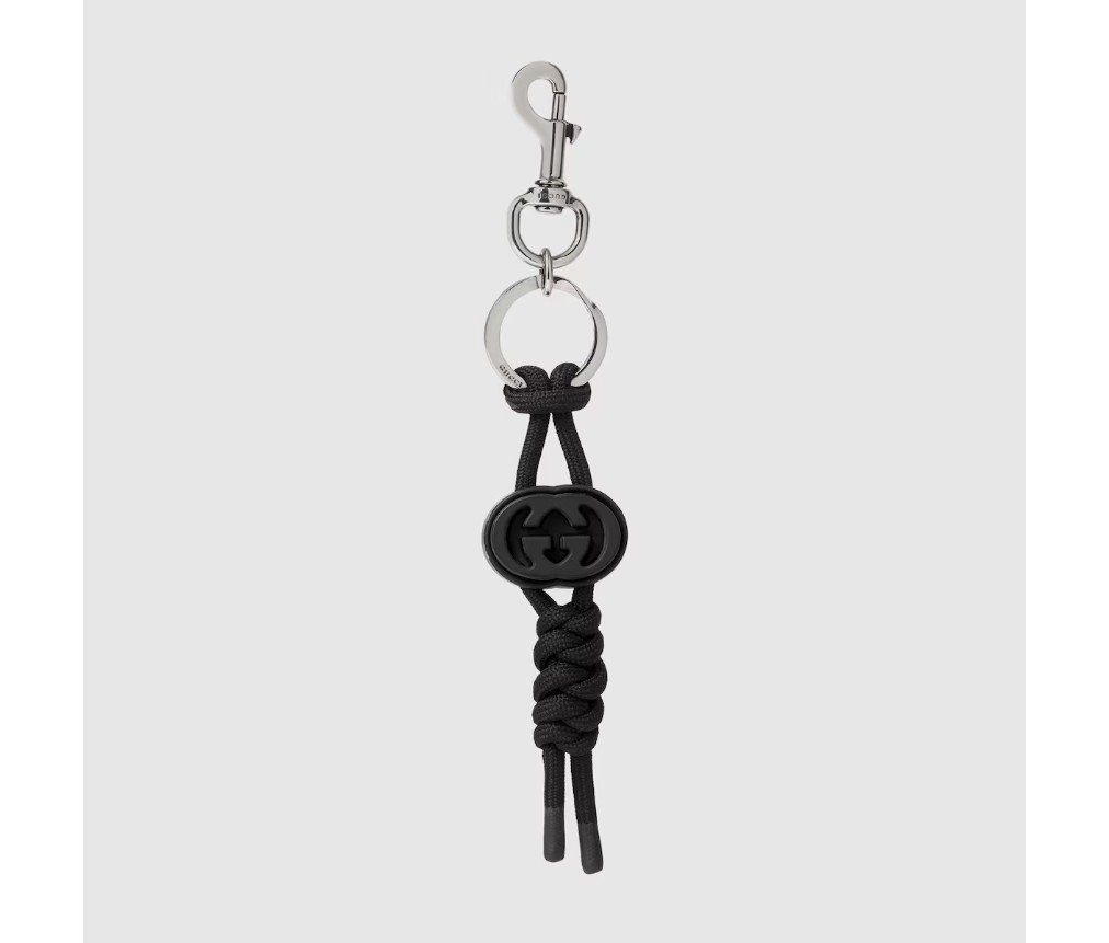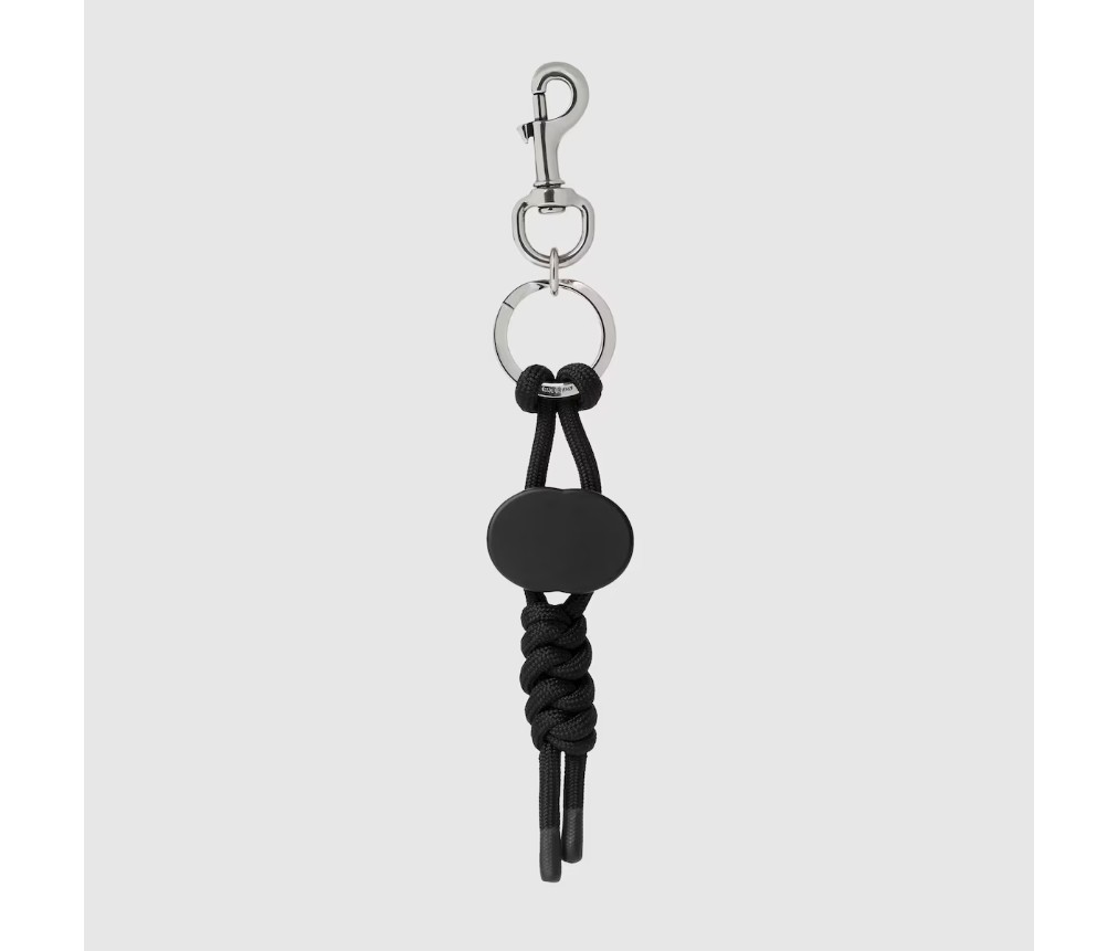 스타일 834480 자잇 88442025 프리폴 컬렉션에서는 하우스의 시그니처 테마를 담은 액세서리를 선보입니다. 이 키링은 매듭으로 묶은 로프 베이스 위에 서로 맞물리는 G 모티프가 특징입니다.