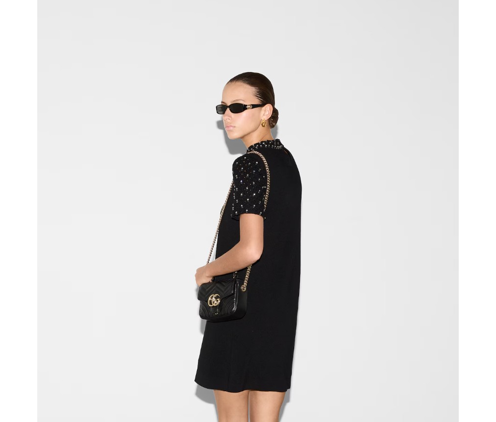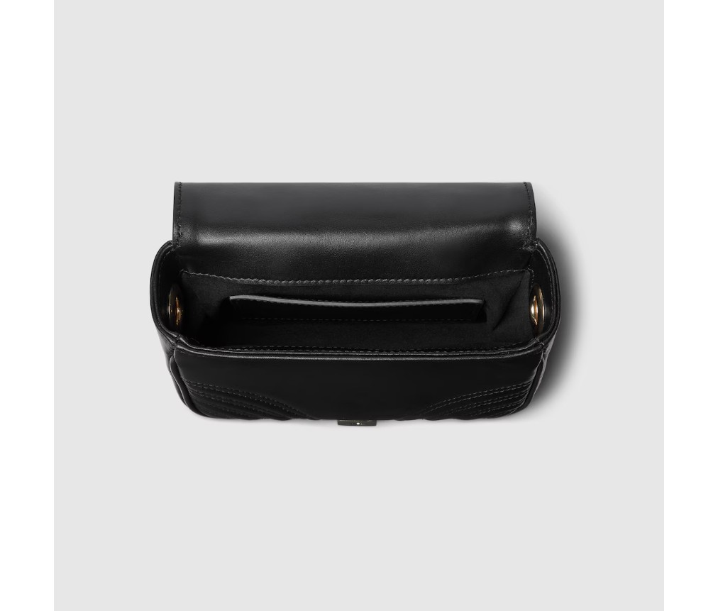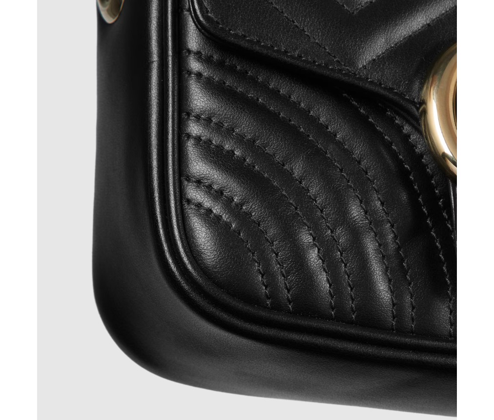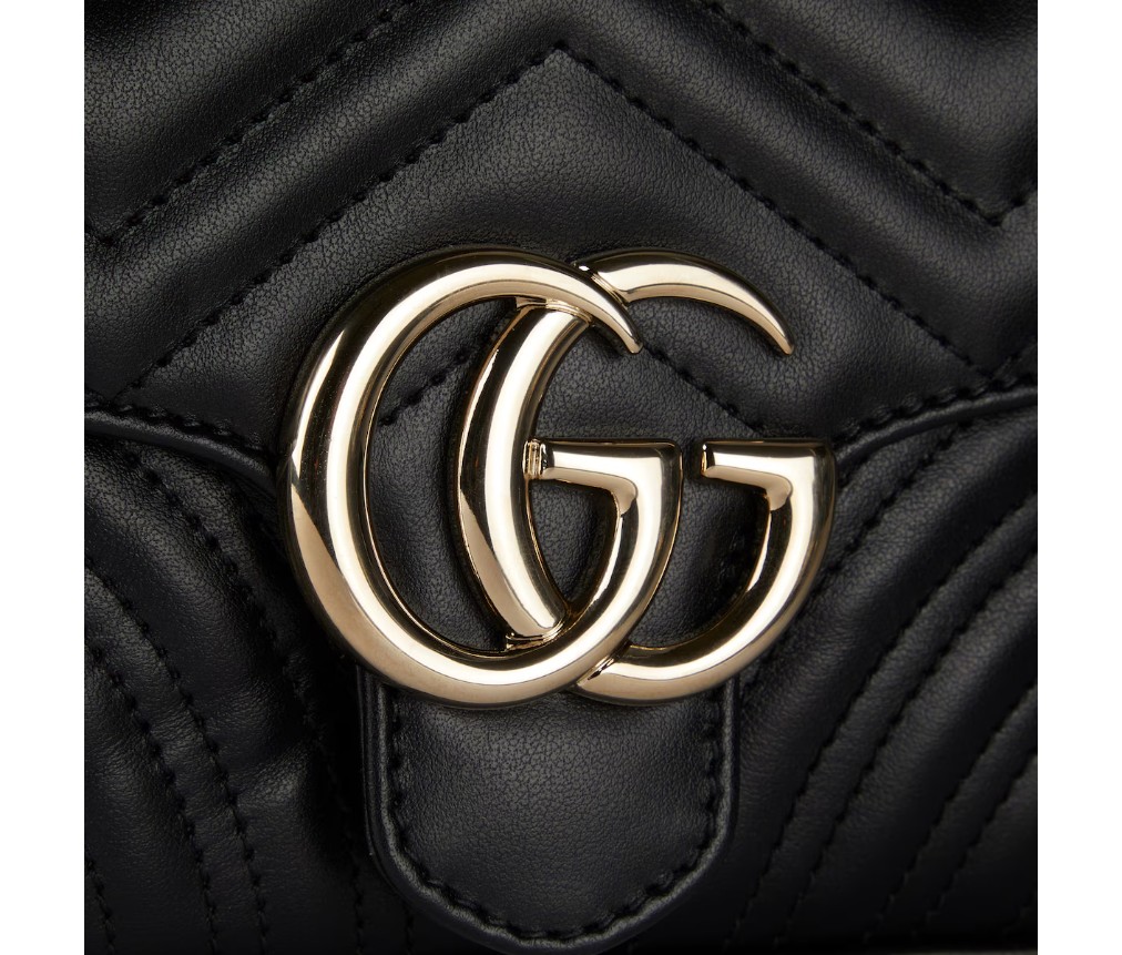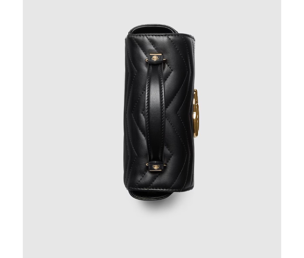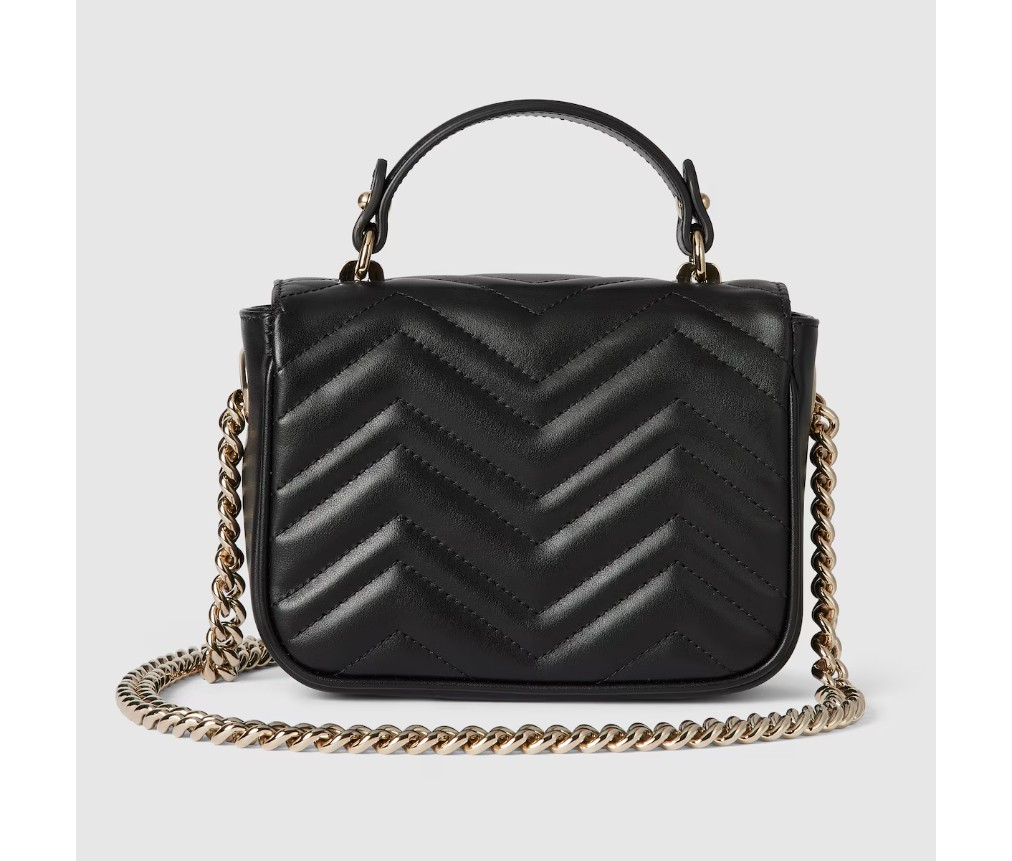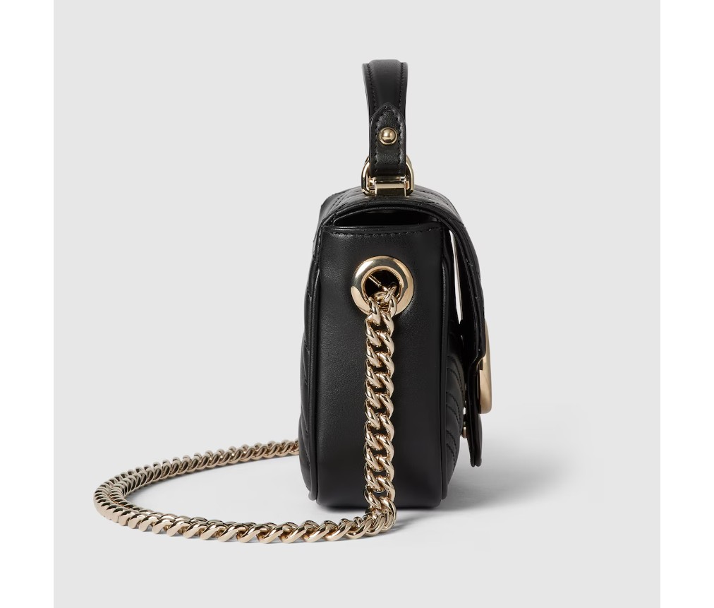 스타일 811238 AAECK 1000GG 마몬트 컬렉션은 프리폴을 맞아 시그니처 톤의 새로운 실루엣을 선보입니다. 블랙 퀼팅 셰브론 가죽 소재로 제작된 이 탑 핸들 백은 탈부착 가능한 토글 버튼이 달린 라이트 골드 톤 체인 스트랩과 함께 제공됩니다. 더블 G 로고가 장식된 마그네틱 플랩 잠금장치가 스타일을 완성합니다.