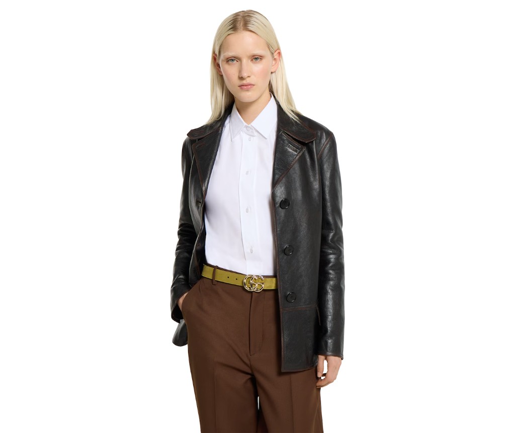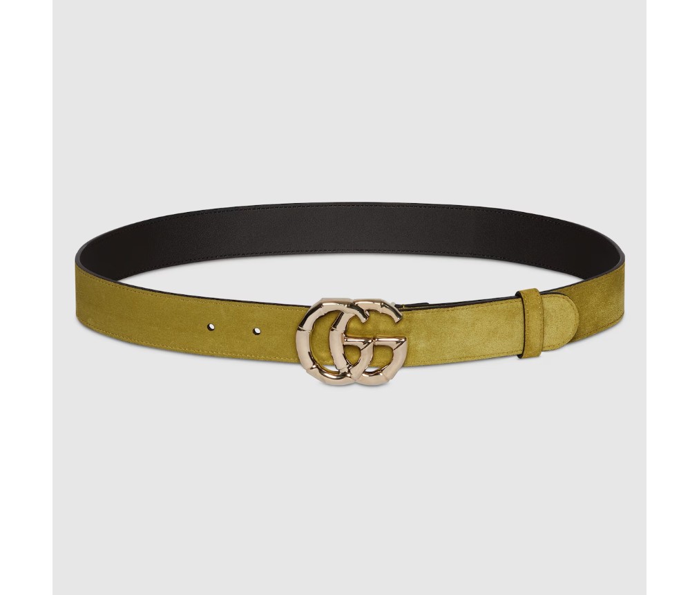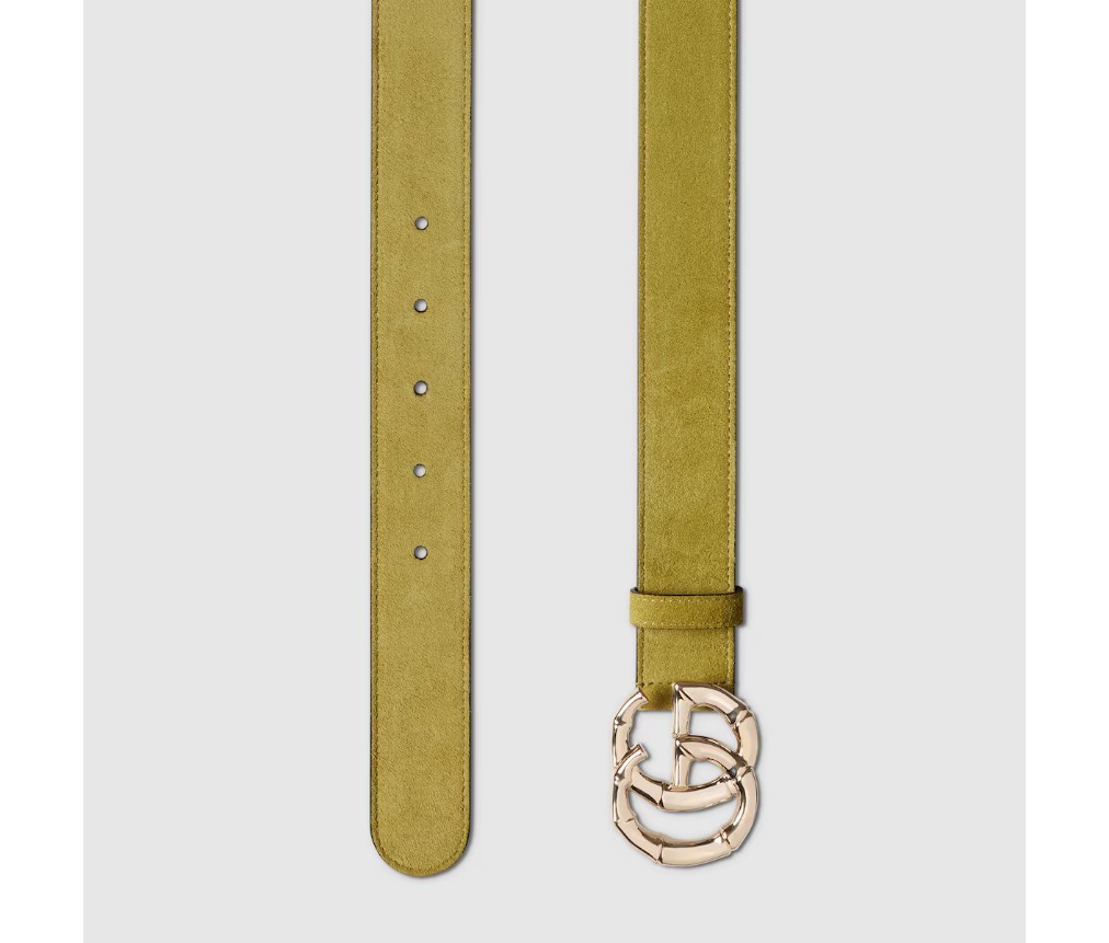 2025 가을/겨울 컬렉션에서 한눈에 알아볼 수 있는 GG 마몽은 새로운 해석을 선보입니다. 이 스웨이드 벨트는 대나무 모양의 더블 G 버클로 포인트를 주었습니다.