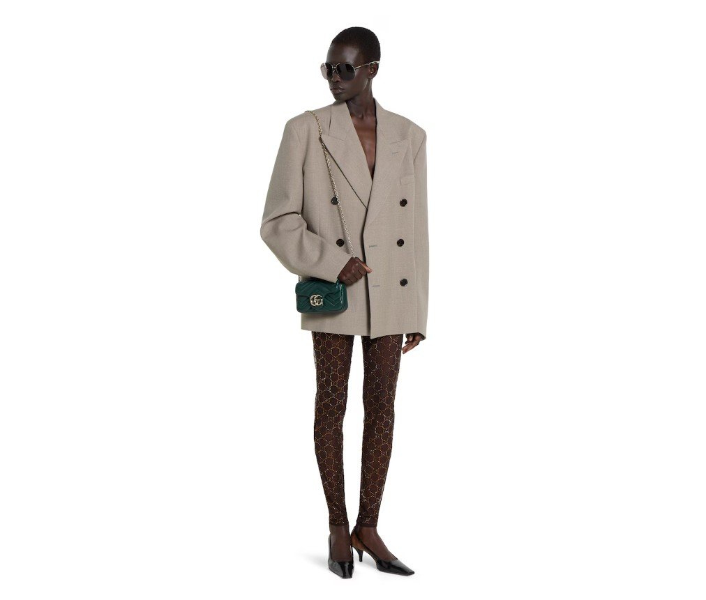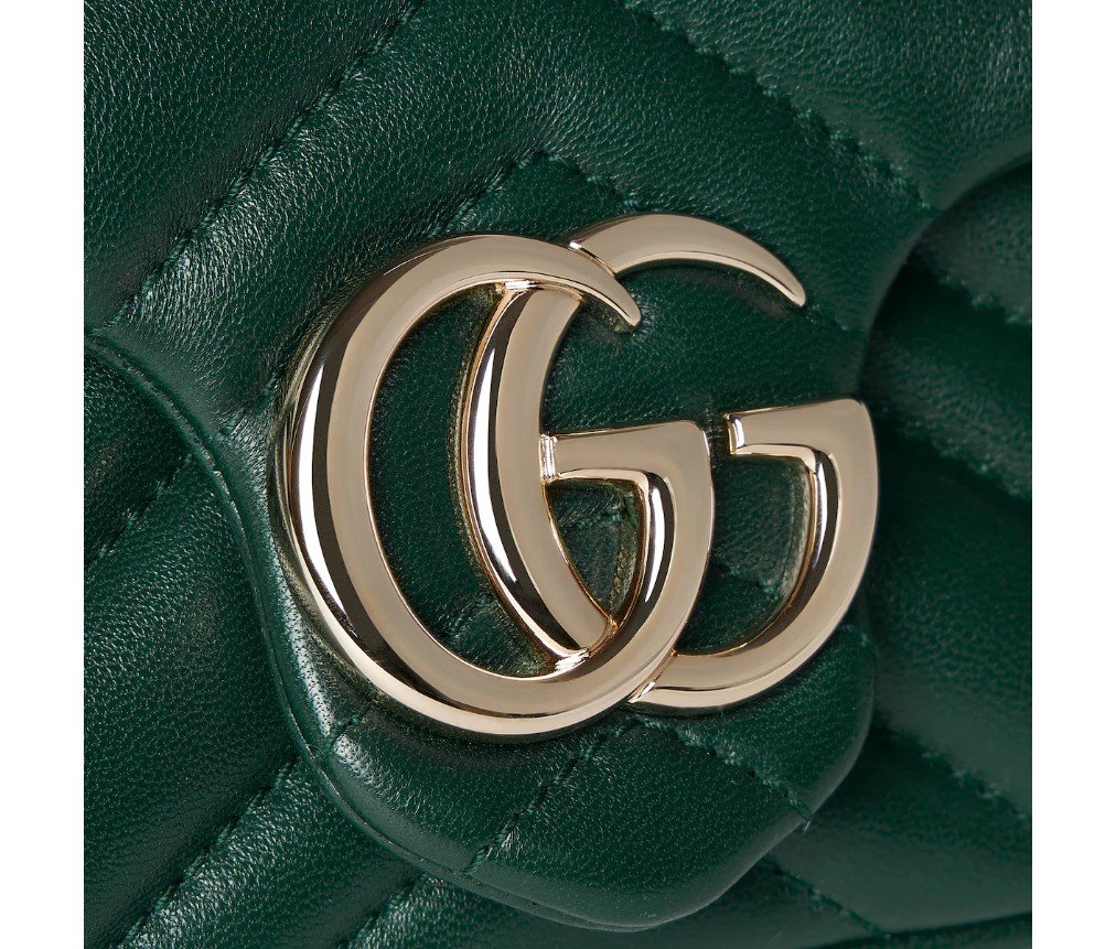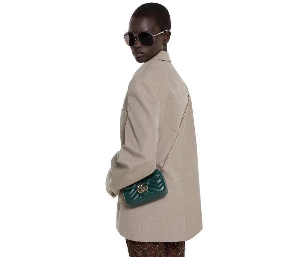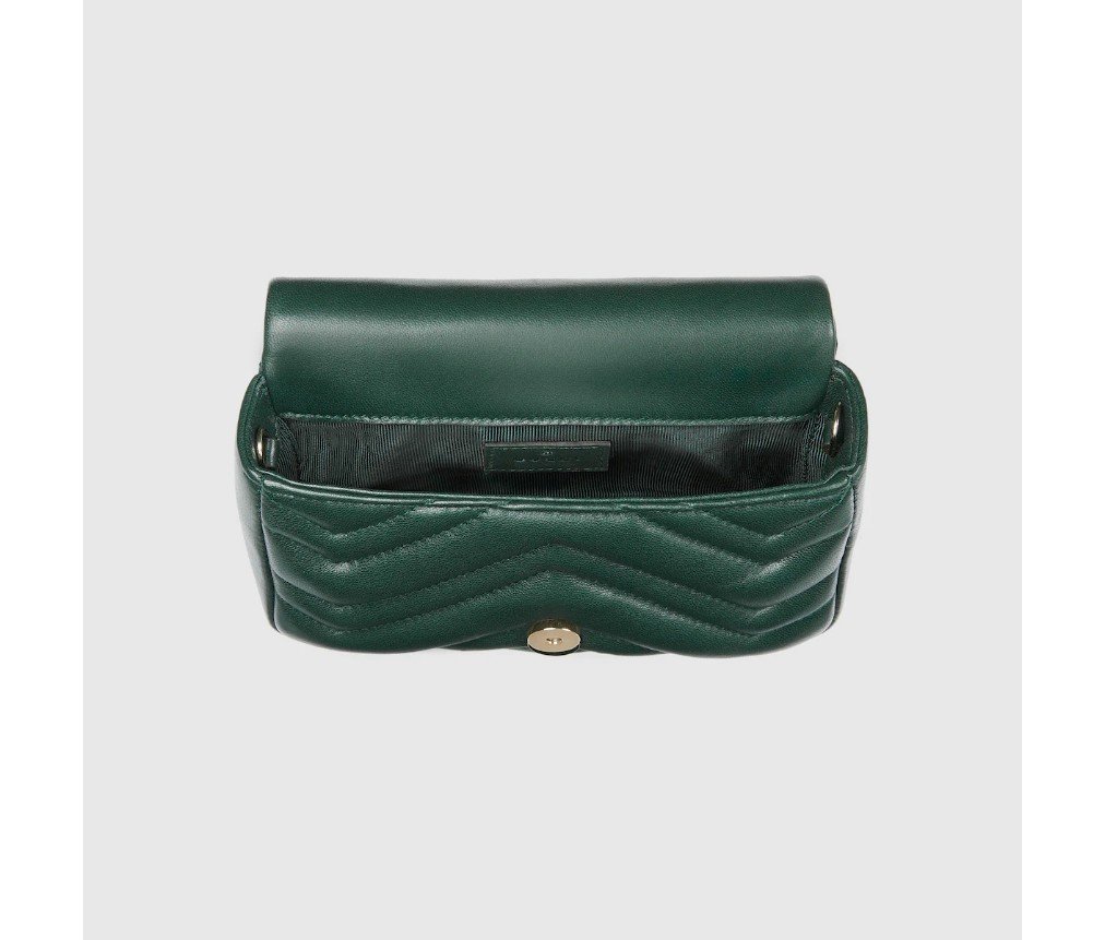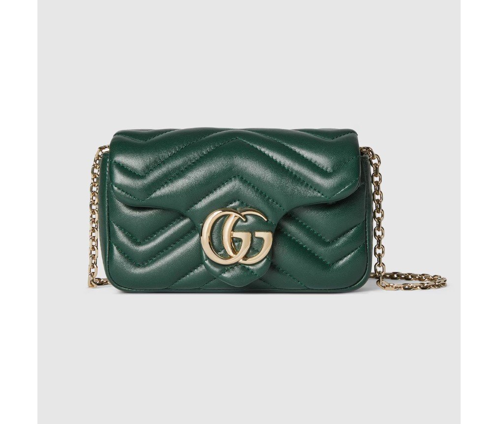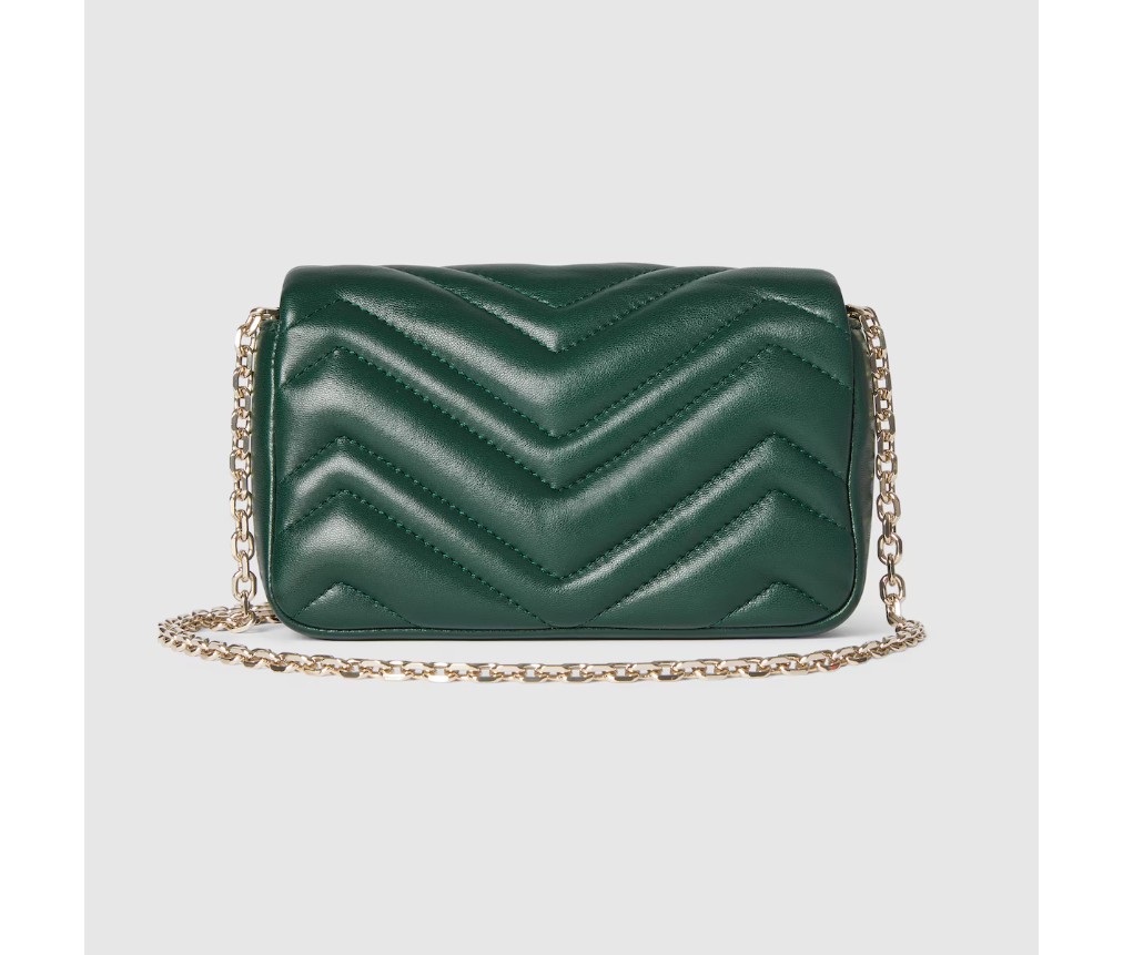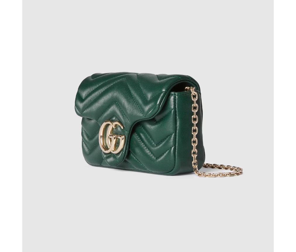 GG 마몽은 신선한 팔레트의 미니 실루엣을 선보입니다. 예를 들어, 녹색 마틀라세 셰브론 가죽으로 제작된 이 미니 숄더백은 밝은 골드 톤의 더블 G 하드웨어로 완성되었습니다.