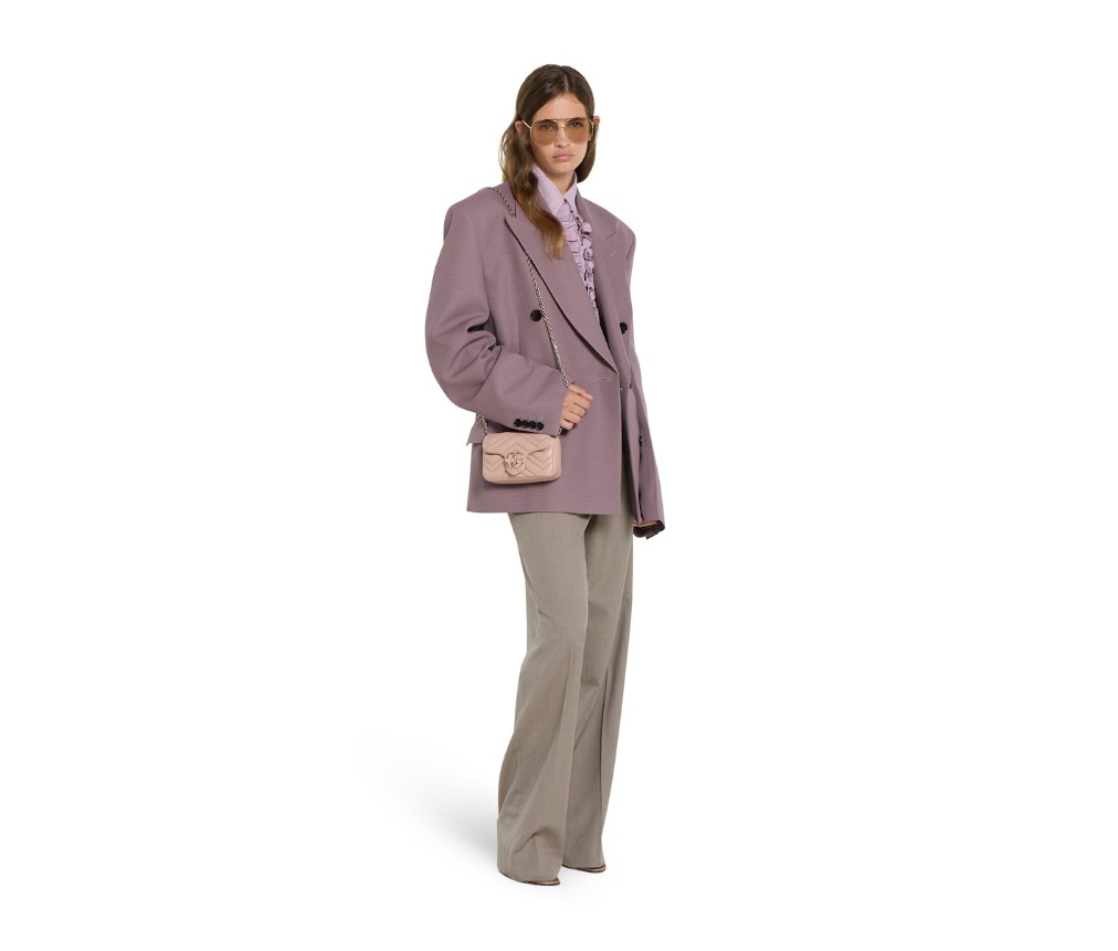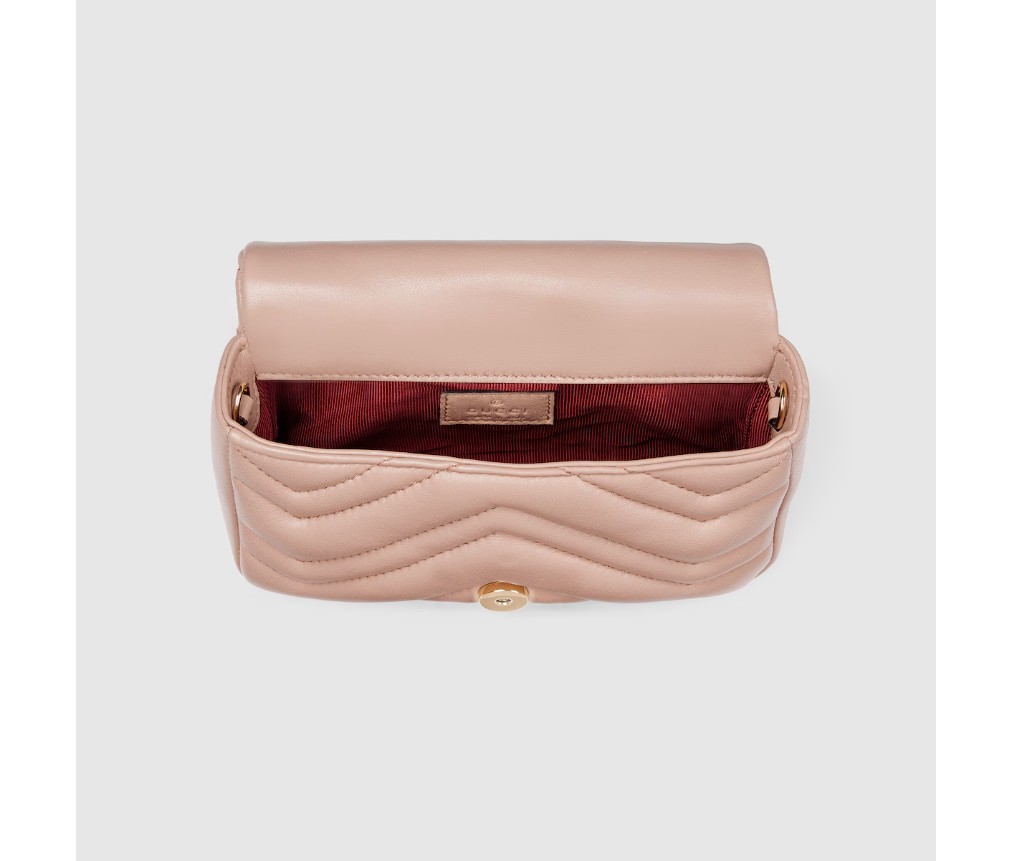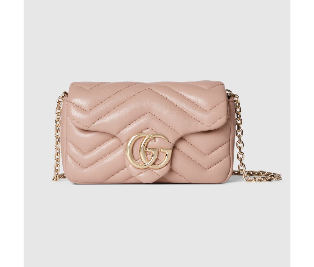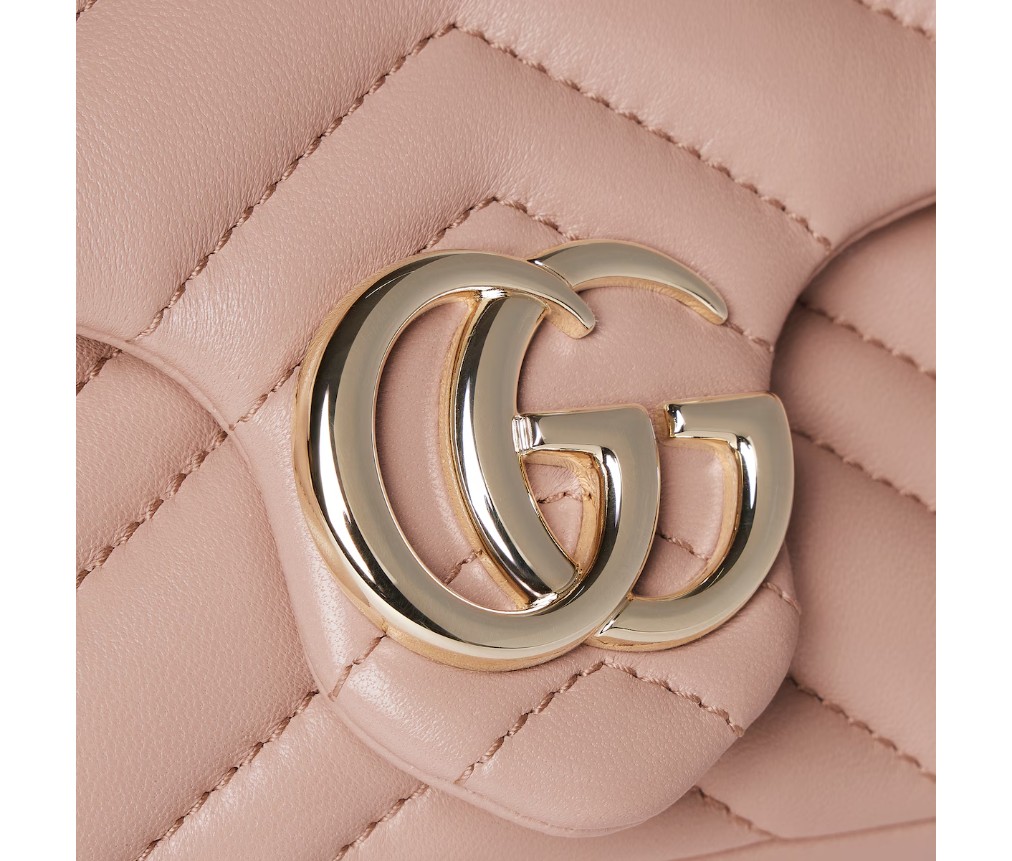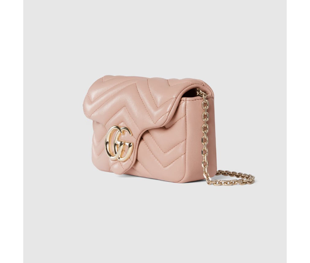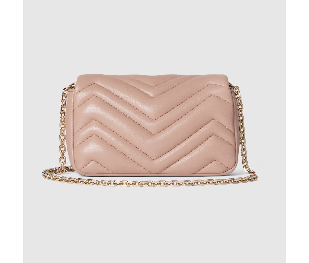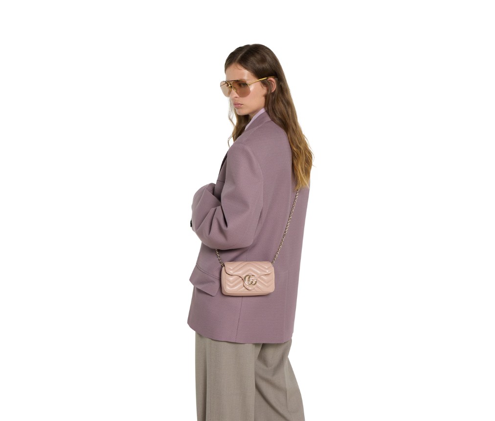 GG 마몽은 신선한 팔레트의 미니 실루엣을 선보입니다. 예를 들어, 핑크 베이지색 마틀라세 셰브론 가죽으로 제작된 이 미니 숄더백은 밝은 골드 톤의 더블 G 하드웨어로 완성되었습니다.