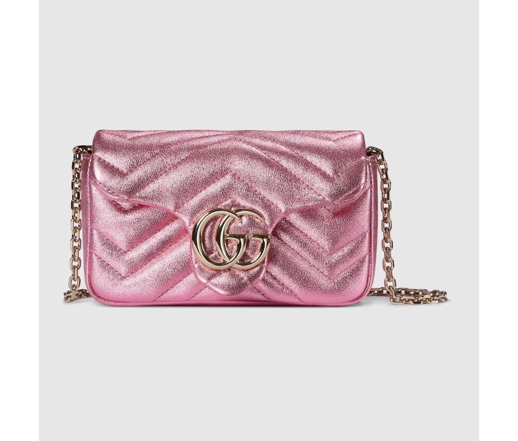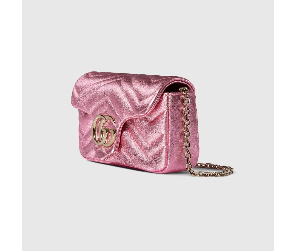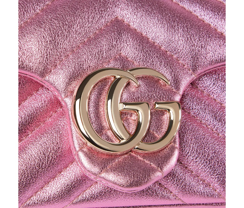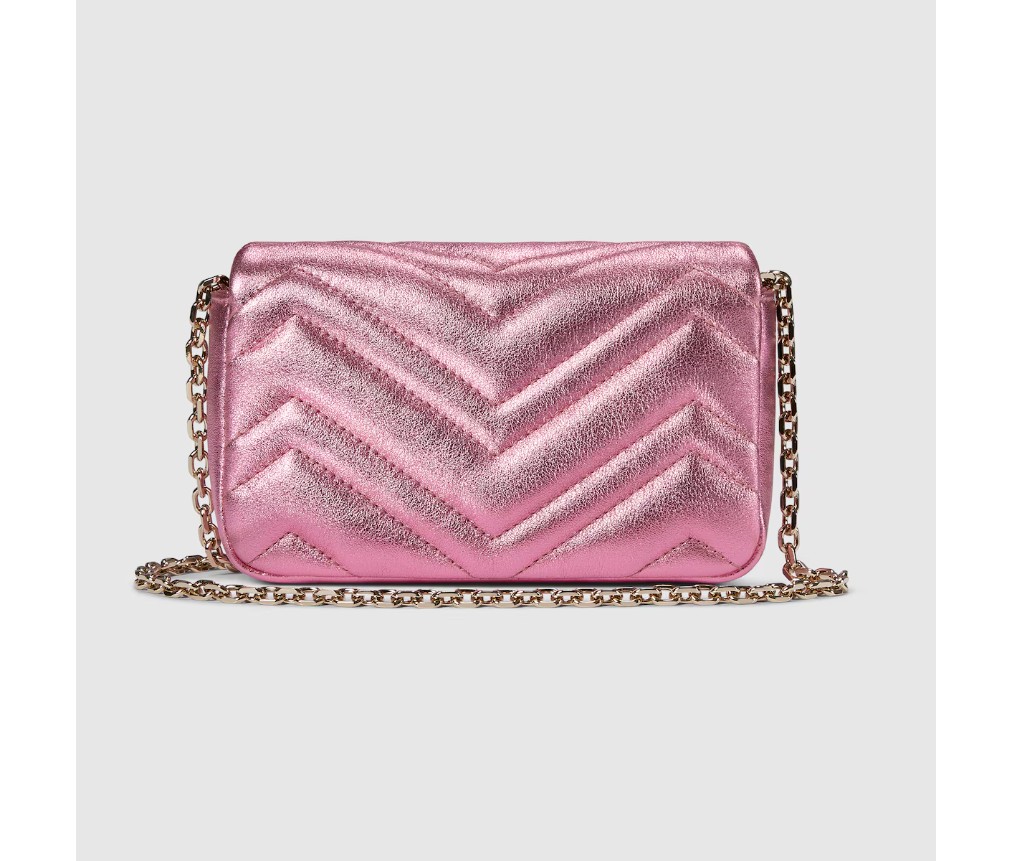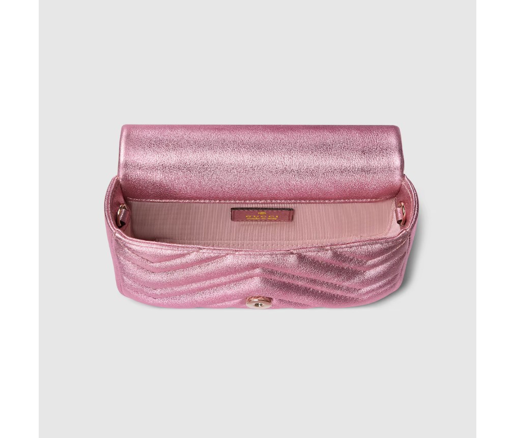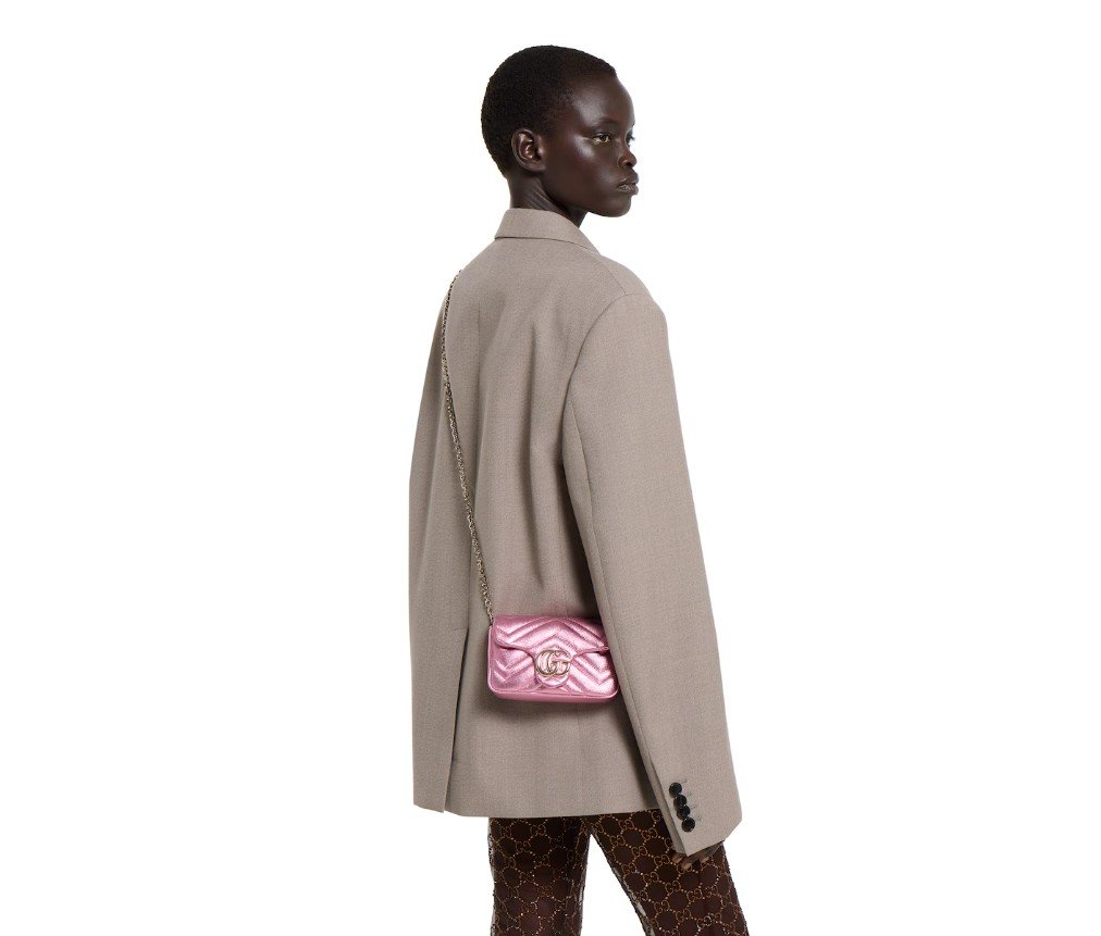 하우스의 시그니처 컬렉션인 GG 마몽은 더블 G 하드웨어, 면 처리된 체인 스트랩, 부드러운 구조가 특징이며, 이 숄더백 실루엣에 라메 가죽을 도입했습니다.