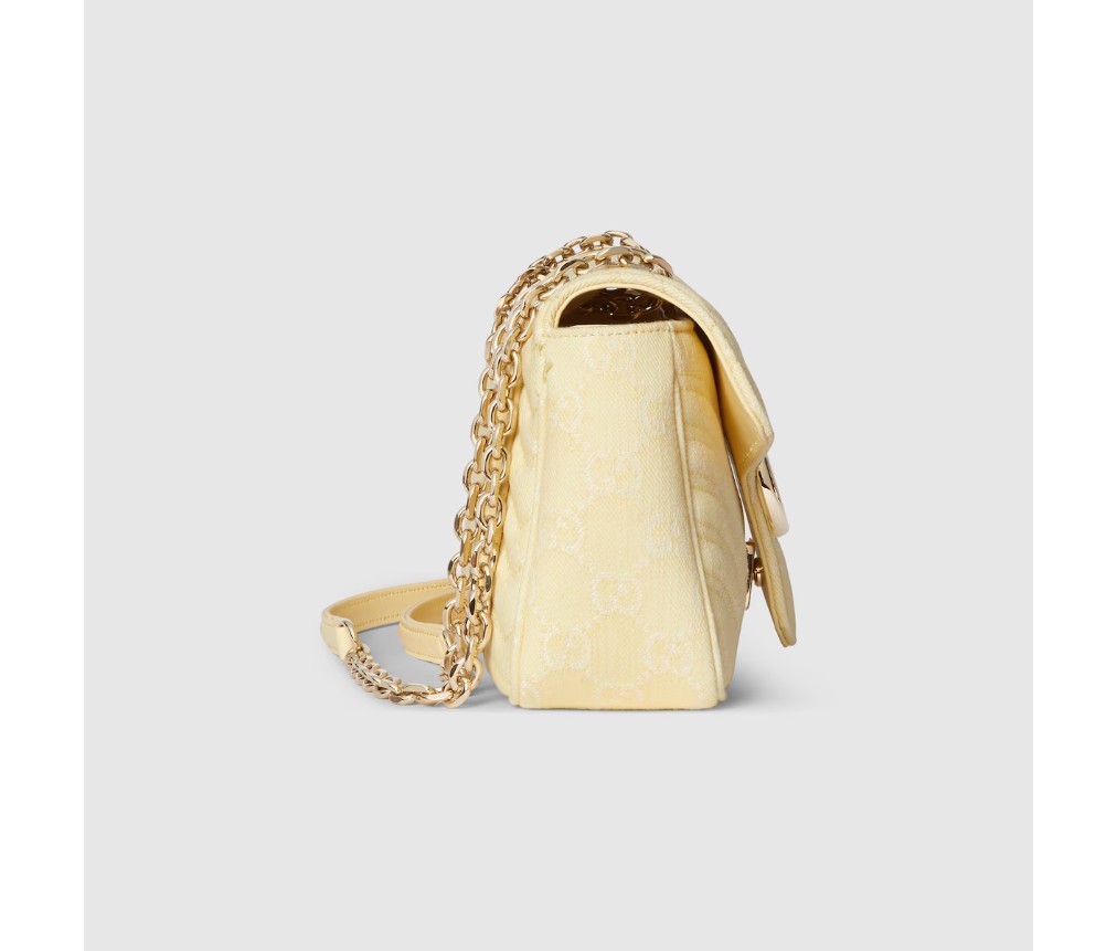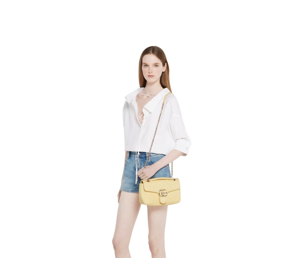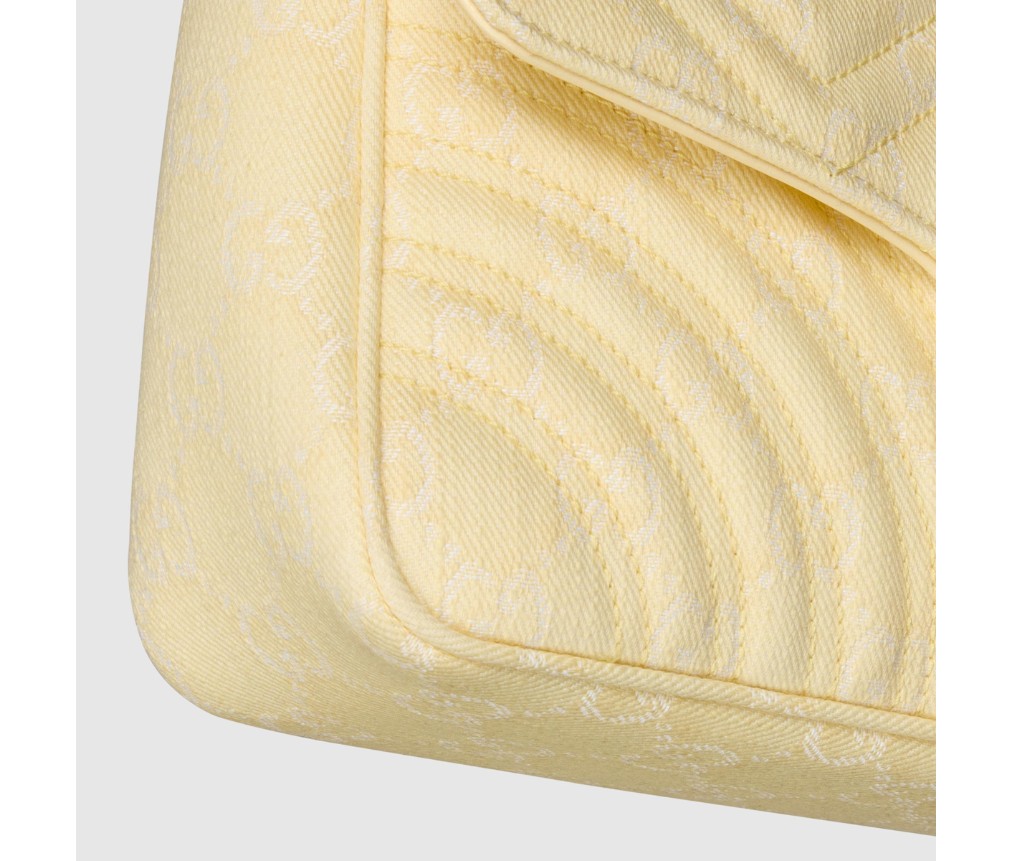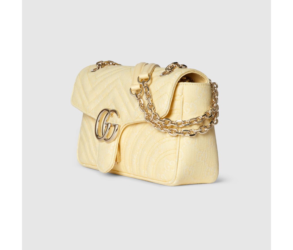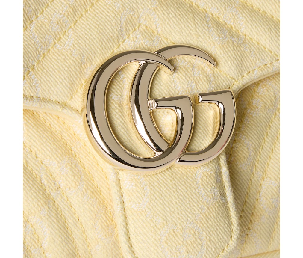 하우스의 시그니처 컬렉션인 GG 마몽은 더블 G 하드웨어, 면 처리된 체인 스트랩, 그리고 세련된 소재의 유연한 구조가 특징입니다. 이번 시즌을 맞아 새롭게 선보이는 마틀라세 셰브론 데님 소재로 제작되었습니다.