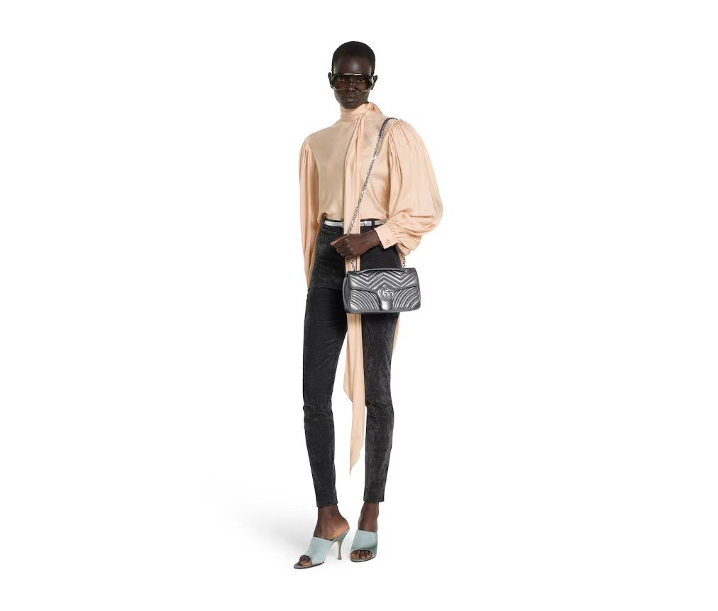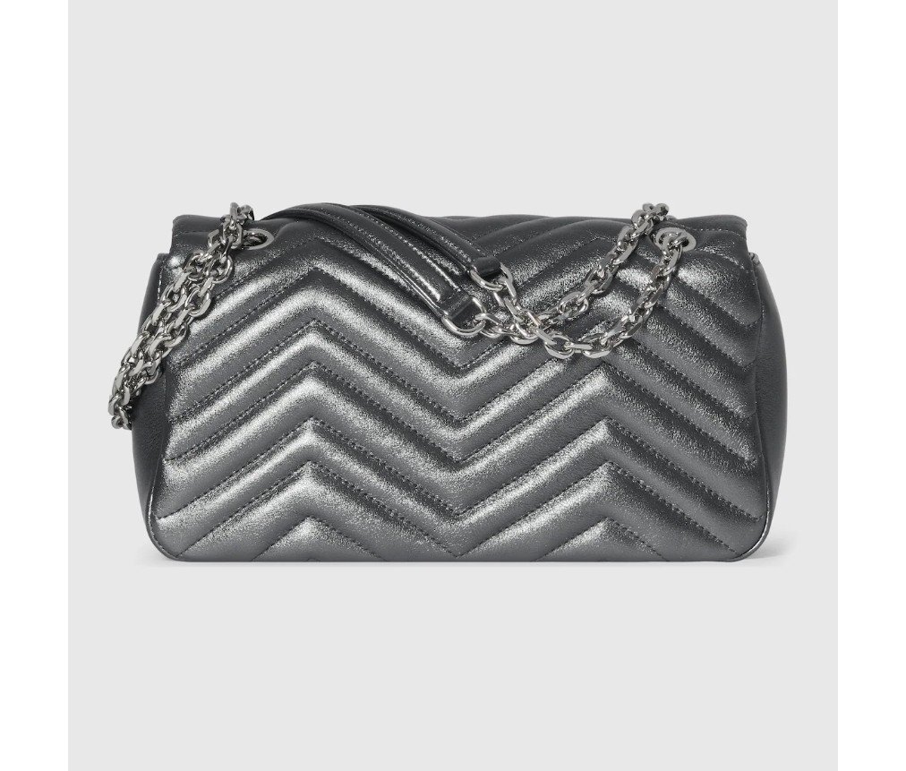스타일 854863 AAFV0 1107하우스의 시그니처 컬렉션인 GG 마몬트는 상징적인 더블 G 로고와 각진 체인 스트랩이 특징이며, 실버 톤 마감으로 선보입니다. 이 숄더백 스타일은 라메 가죽 소재로 제작되었으며, 시대를 초월하는 그레이 톤을 선보입니다.