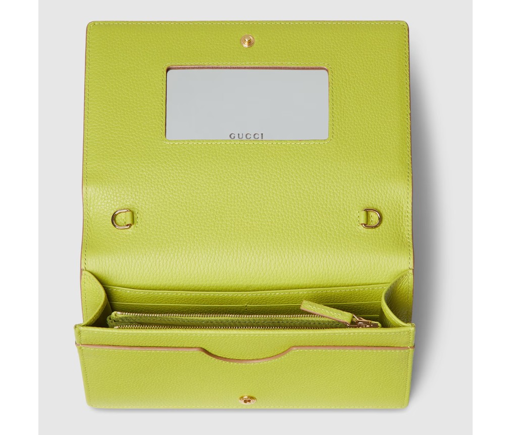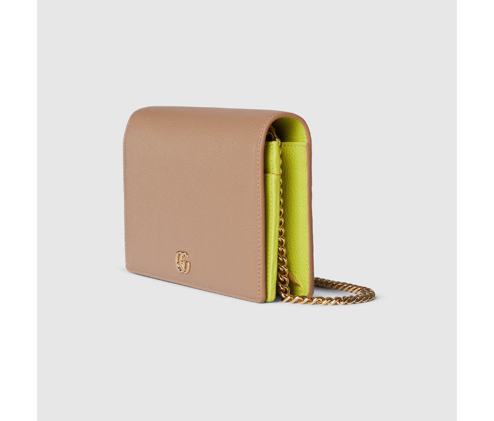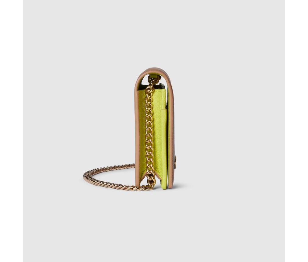 베이지색과 밝은 그린 색상의 가죽이 조화를 이루는 GG 마몽 체인 지갑입니다. 구조적인 실루엣에 시그니처 더블 G 하드웨어가 장식되어 있습니다. 탈부착 가능한 체인 스트랩으로 데일리룩과 나이트룩을 손쉽게 연출할 수 있습니다. 컴팩트하면서도 실용적인 내부는 카드와 필수품을 깔끔하게 보관할 수 있는 공간을 제공합니다.