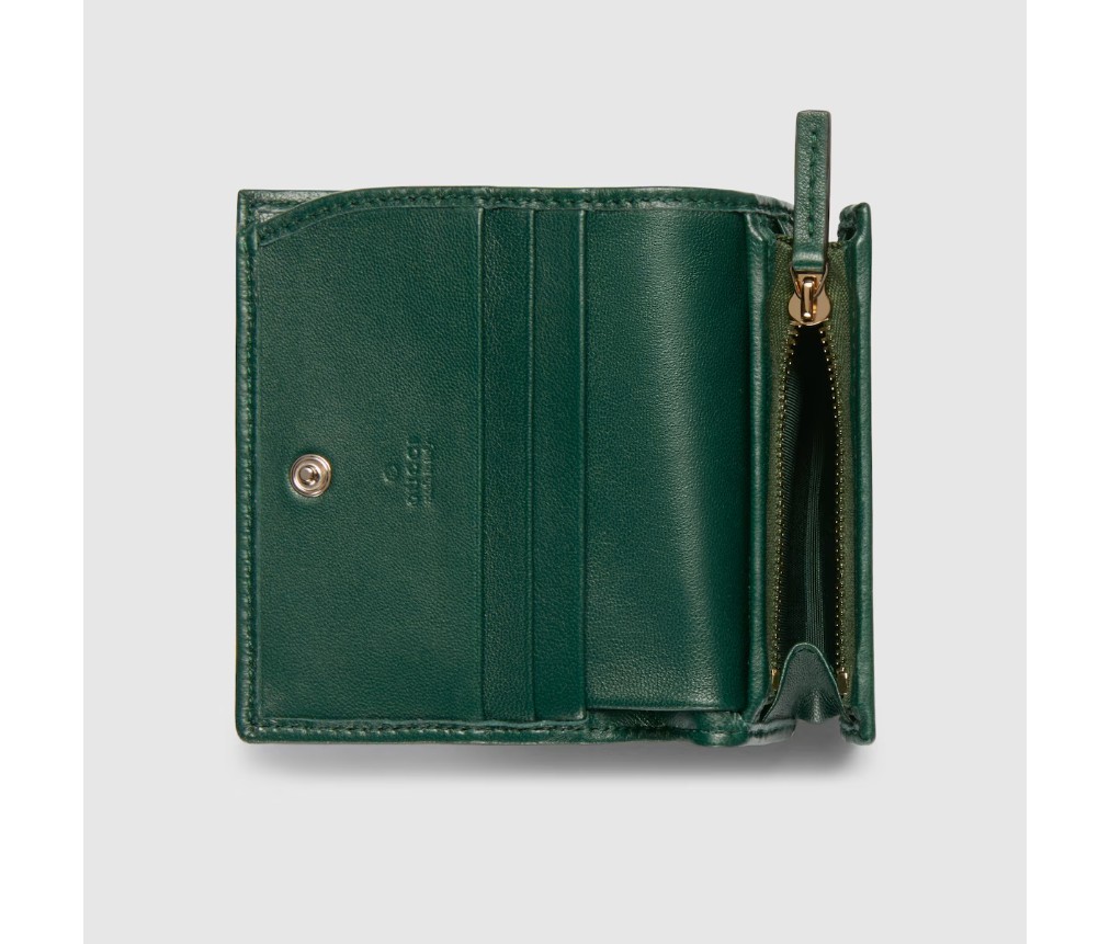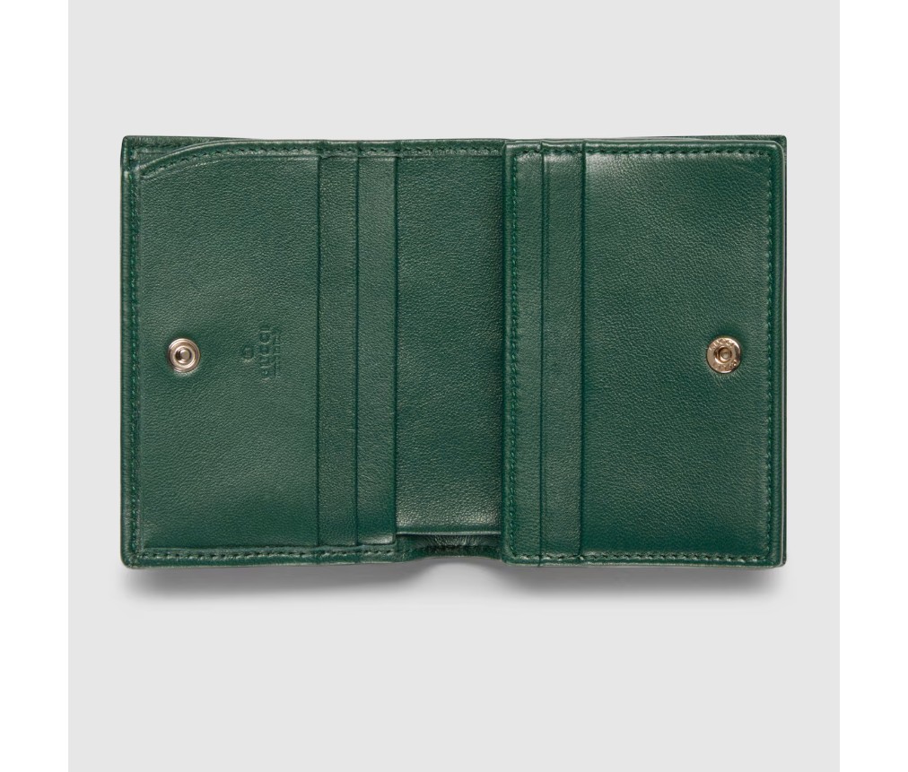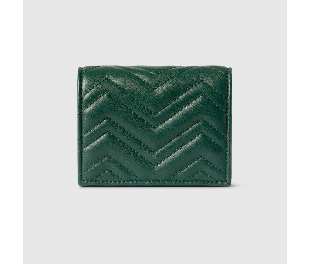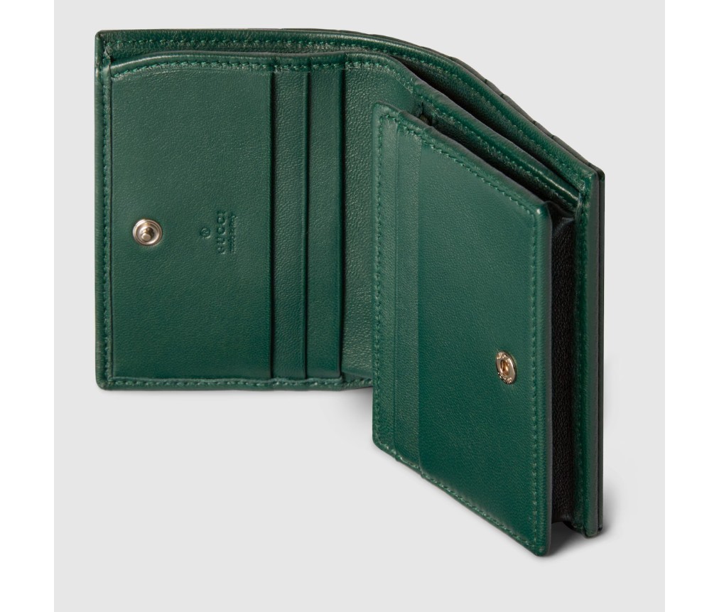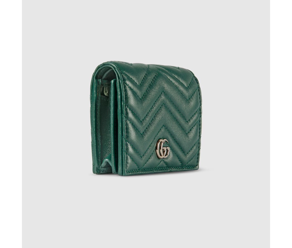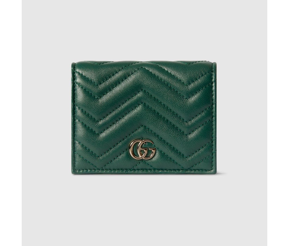 GG 마몽은 신선한 색상으로 미니 실루엣을 선보입니다. 예를 들어, 마틀라세 셰브론 가죽으로 만든 카드 케이스 지갑은 밝은 골드 톤으로 마감된 더블 G 하드웨어로 완성되었습니다.