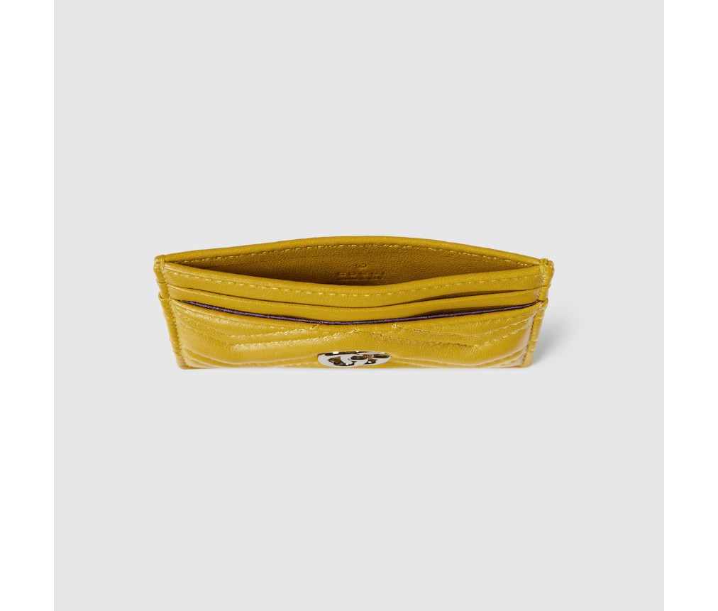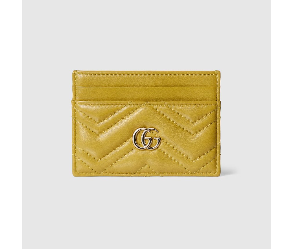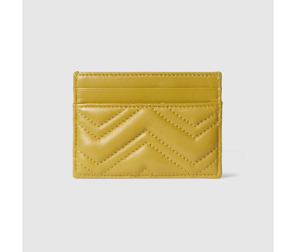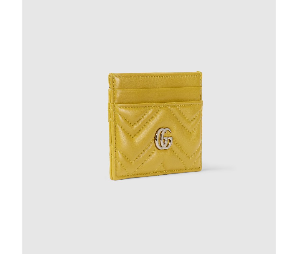 GG 마몽은 신선한 색상으로 다양한 실루엣을 선보입니다. 예를 들어, 머스타드 옐로 색상의 마틀라세 셰브론 가죽으로 만든 카드 케이스에는 밝은 골드 톤의 더블 G 하드웨어가 장식되어 있습니다.