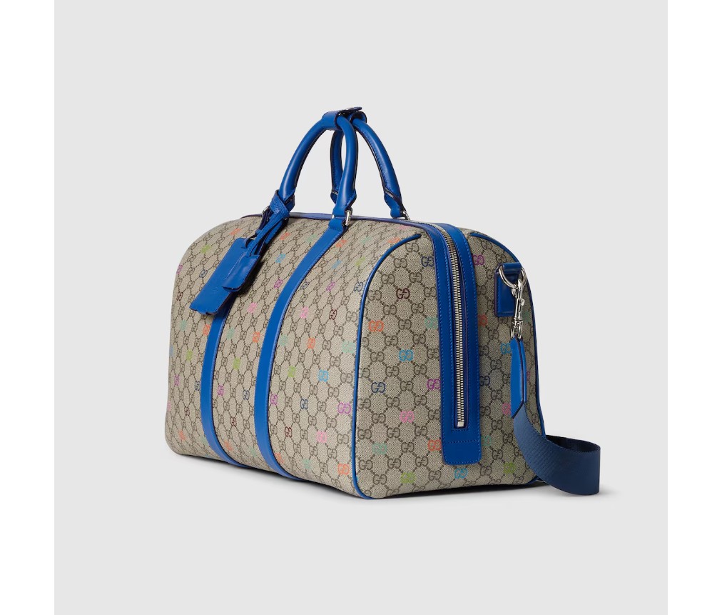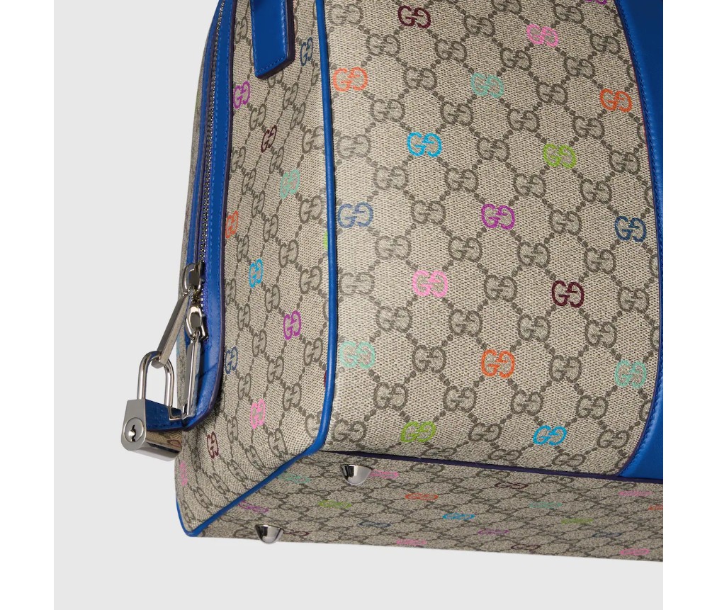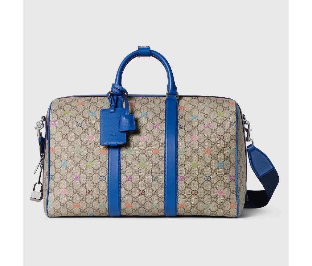 스타일 792074 FAE1Q 8478이 더플백은 2025년 프리폴 컬렉션의 일부로 출시되었습니다. GG 모노그램 코팅 원단으로 제작되었으며, 전면 멀티컬러 프린트와 톤온톤 트림이 특징입니다.