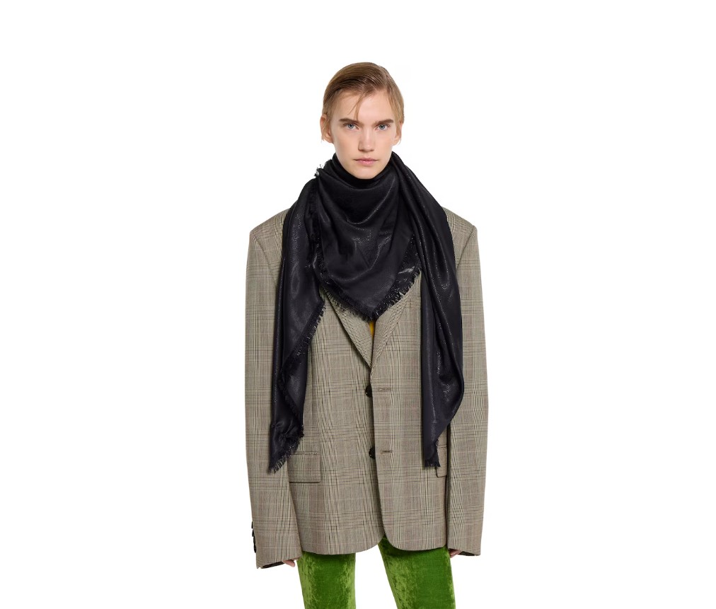 스타일 844561 3GA18 1000하우스의 실크 액세서리 컬렉션은 GG, 웹, 플로라, 대나무, 말, 승마에서 영감을 받은 상징적인 모티프를 고급스러운 소재, 정교한 장인 정신, 그리고 산뜻한 색감으로 재해석해 왔습니다. 이 숄은 GG 실크 울 라메 소재로 제작되었으며, 프린지 장식이 돋보입니다.