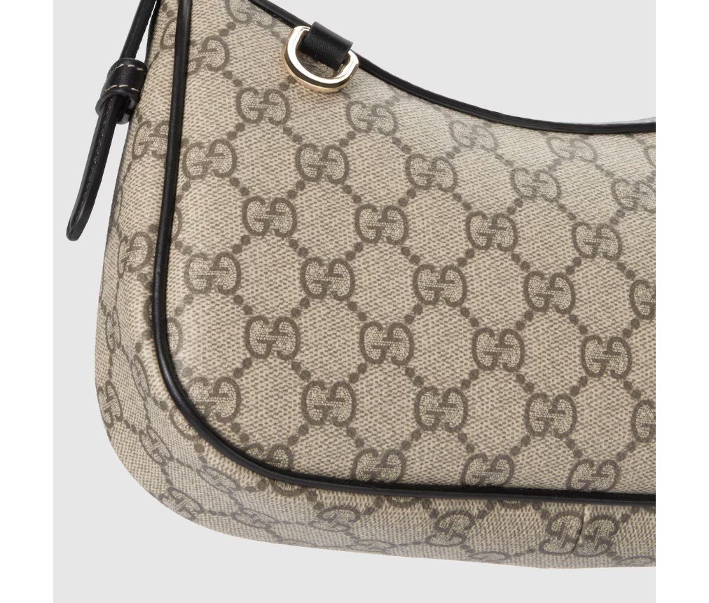 – 베이지 및 다크 브라운 신규 GG 모노그램 코팅 원단– 블랙 가죽 트리밍
