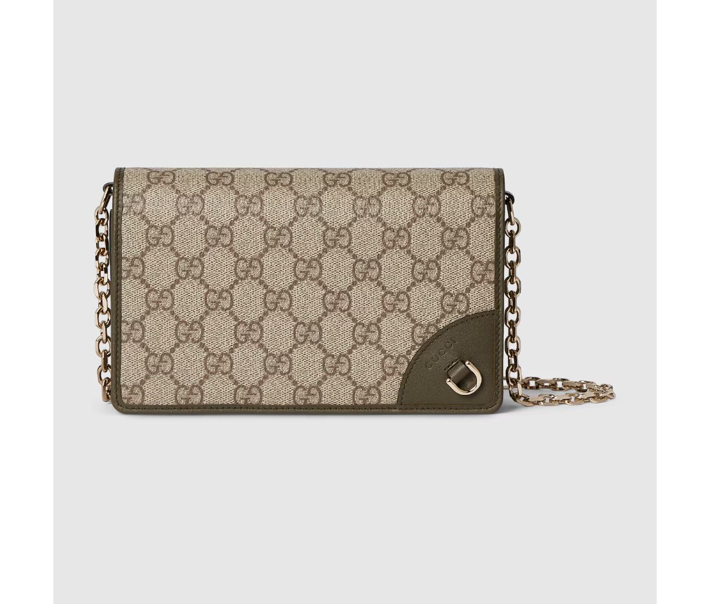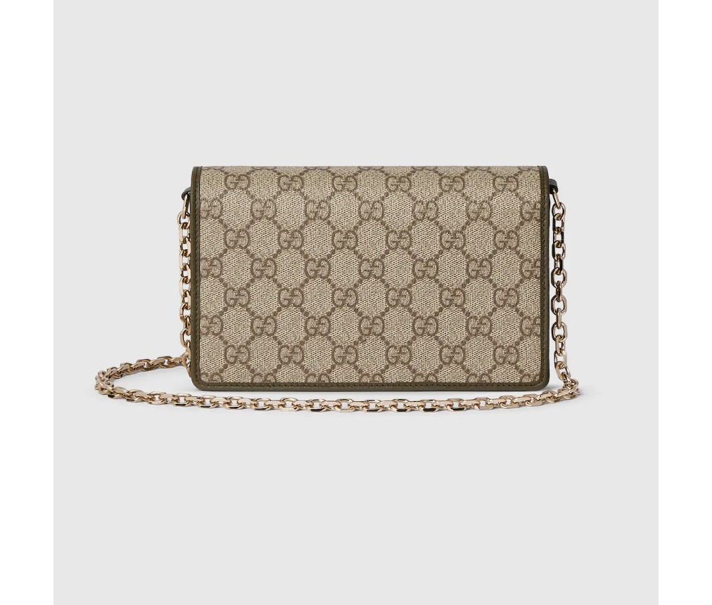 스타일 853716 FAFS6 9778GG 엠블럼 컬렉션은 여성 스몰 레더굿즈에 현대적인 실루엣을 더해 데일리 필수품을 휴대하기에 안성맞춤입니다. 베이지와 다크 브라운 색상의 체인 지갑은 GG 모노그램 코팅 원단으로 제작되었습니다. 포레스트 그린 가죽 트림이 특징이며, 길이 조절이 가능한 체인 숄더 스트랩이 함께 제공됩니다.