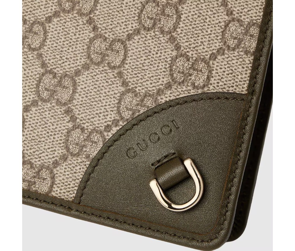 – 베이지 및 다크 브라운 라미네이트 효과 GG 모노그램 코팅 원단– 포레스트 그린 가죽 트림