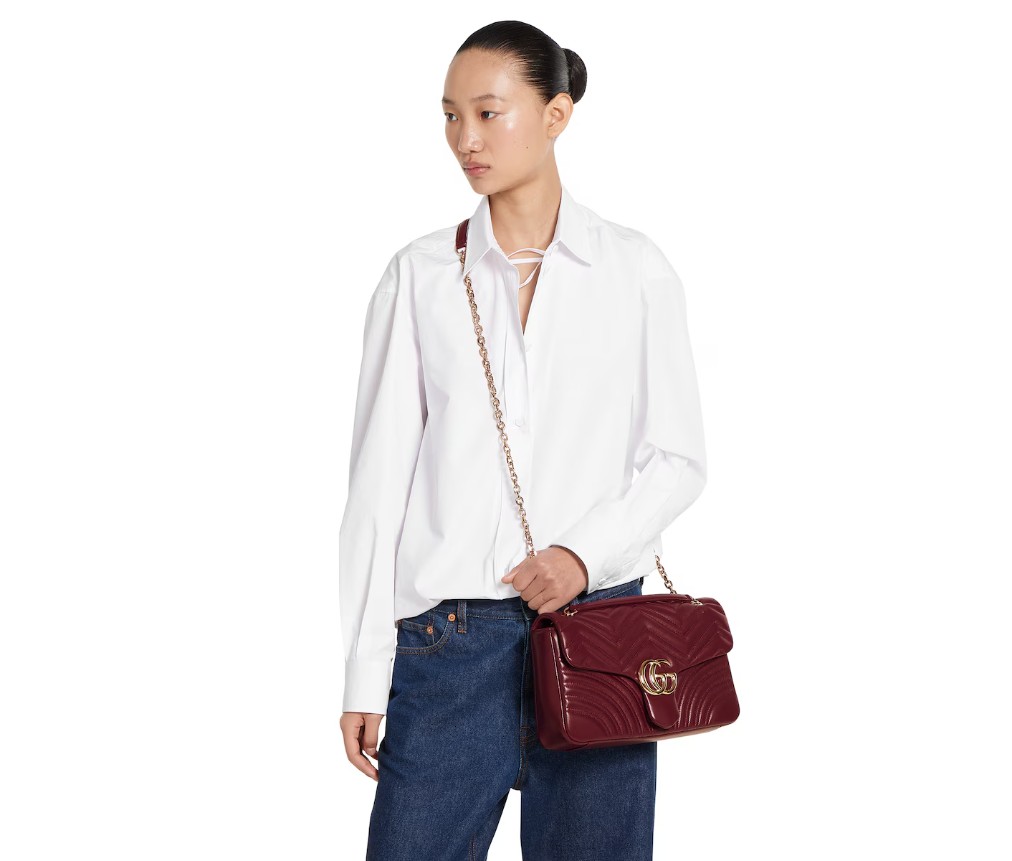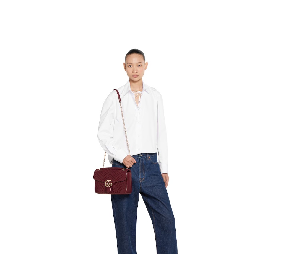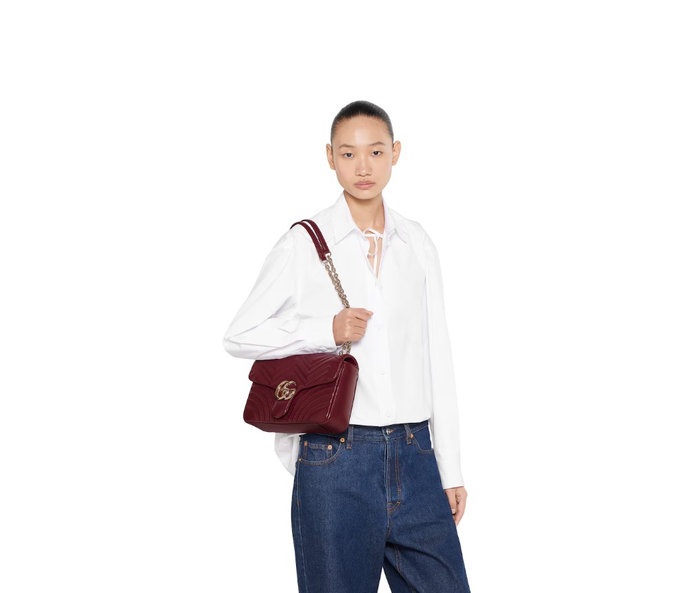 스타일 838985 AAE38 6207하우스의 시그니처 컬렉션인 GG 마몬트는 더블 G 하드웨어, 면 처리된 체인 스트랩, 그리고 매우 부드러운 가죽 소재의 부드러운 구조가 특징입니다. 미디엄과 라지 사이즈에는 세련된 뒷면 포켓이 기능적인 감각을 더합니다.