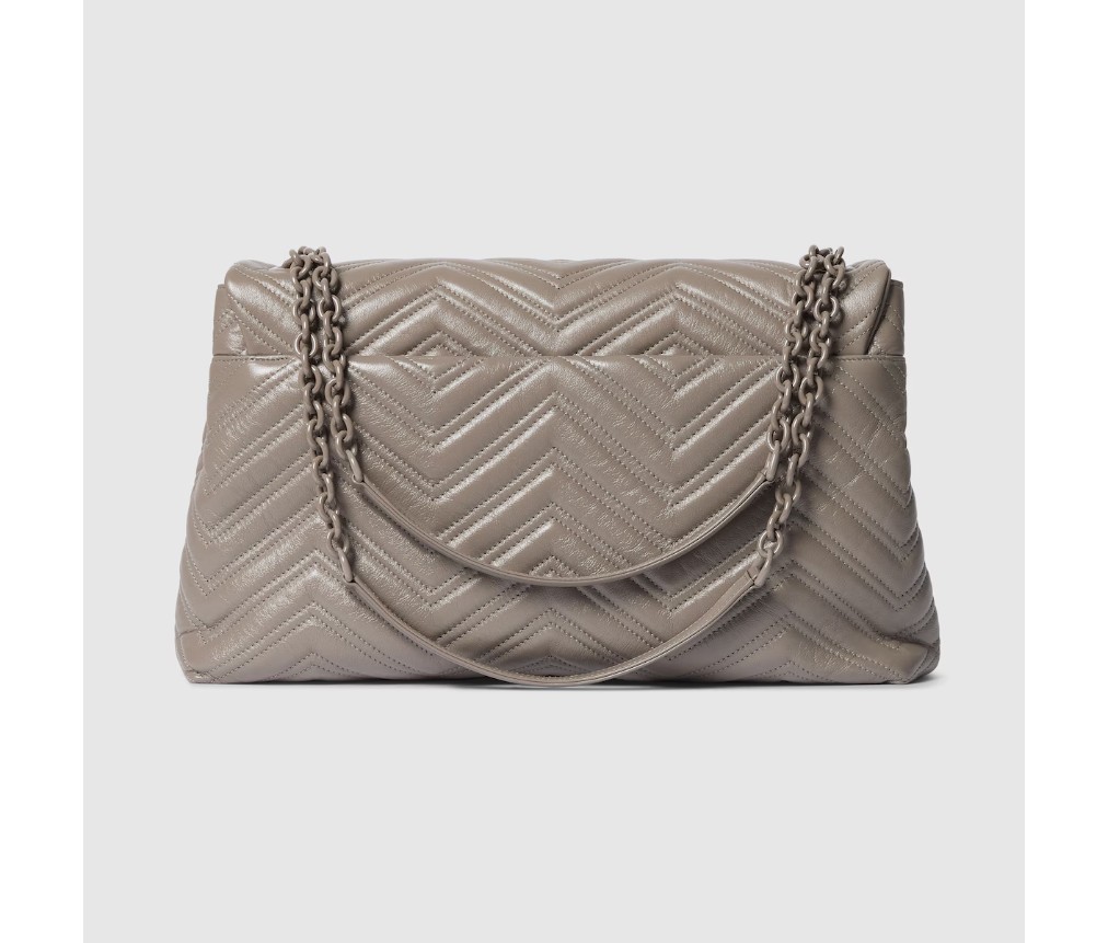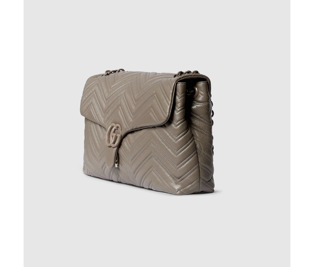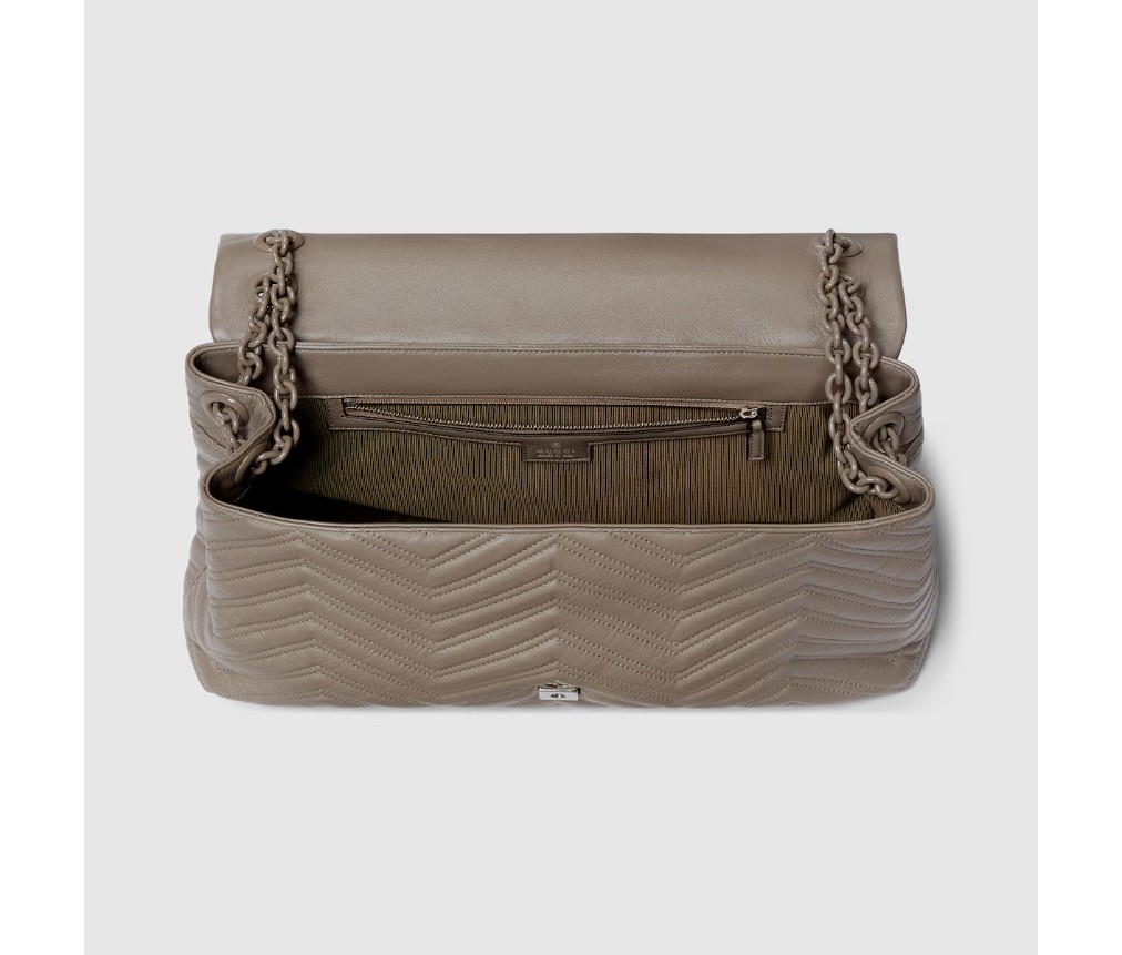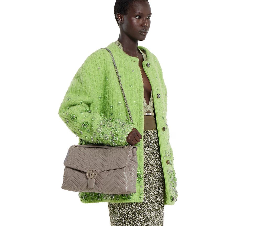 2025 가을/겨울 컬렉션에서 하우스의 시그니처 컬렉션인 GG 마몽은 상징적인 더블 G, 각진 체인 스트랩, 그리고 부드럽고 구조적인 실루엣이 특징입니다. 부드럽고 가벼운 마틀라세 쉐브론 가죽으로 제작되었으며, 톤온톤 에나멜 하드웨어와 체인이 특징입니다.
