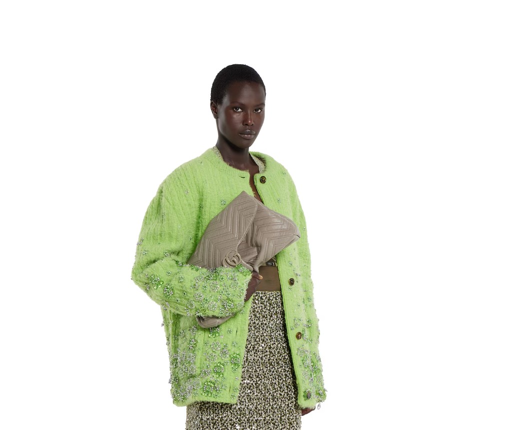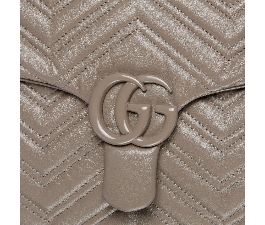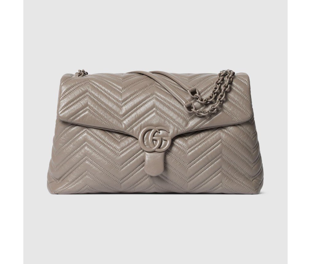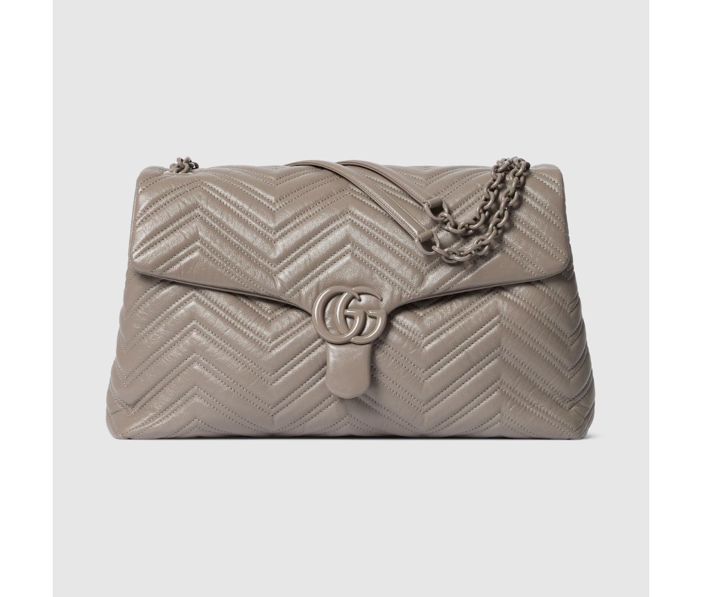 2025 가을/겨울 컬렉션에서 하우스의 시그니처 컬렉션인 GG 마몽은 상징적인 더블 G, 각진 체인 스트랩, 그리고 부드럽고 구조적인 실루엣이 특징입니다. 부드럽고 가벼운 마틀라세 쉐브론 가죽으로 제작되었으며, 톤온톤 에나멜 하드웨어와 체인이 특징입니다.
