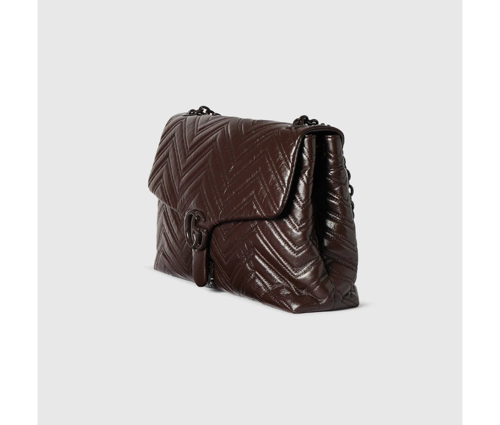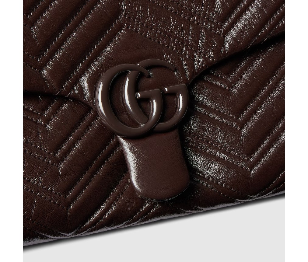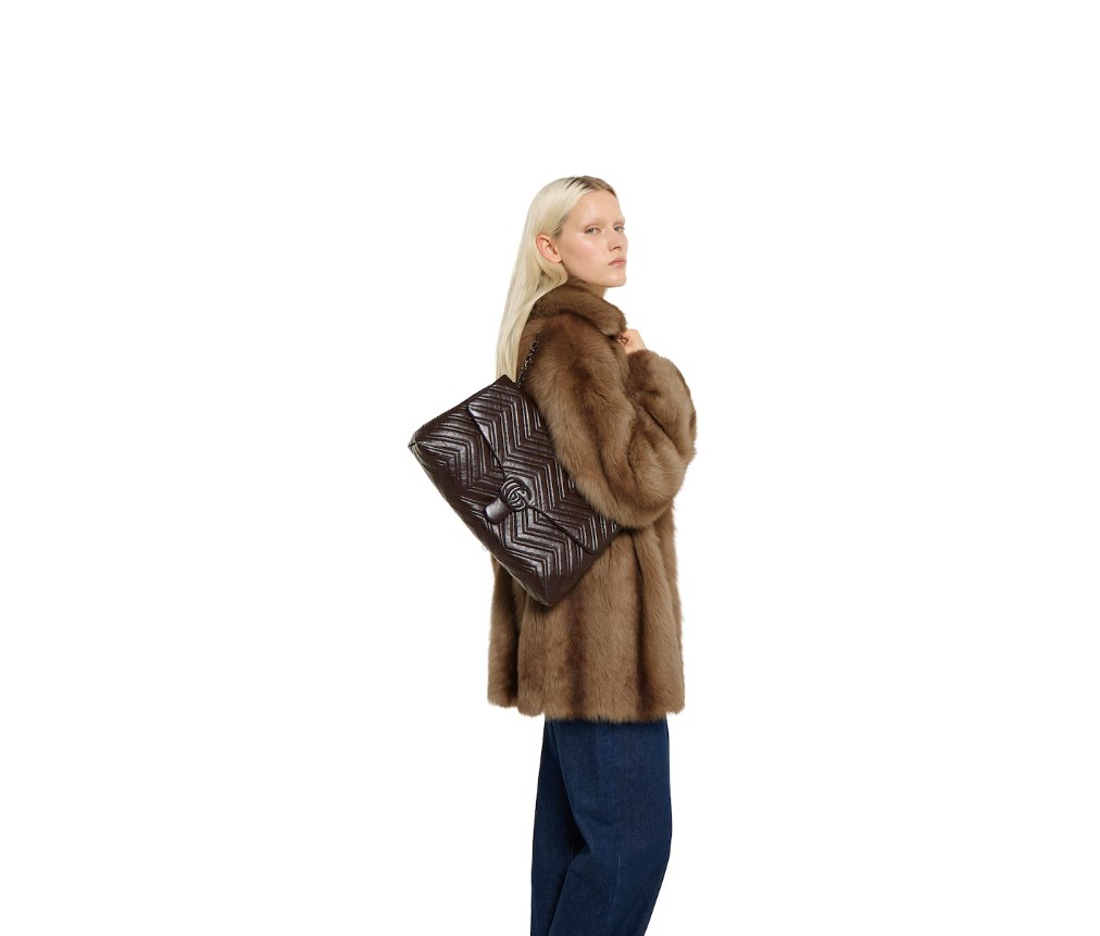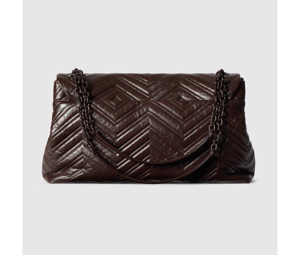 2025 가을/겨울 컬렉션에서 하우스의 시그니처 컬렉션인 GG 마몽은 상징적인 더블 G, 각진 체인 스트랩, 그리고 부드럽고 구조적인 실루엣이 특징입니다. 부드럽고 가벼운 마틀라세 쉐브론 가죽으로 제작되었으며, 톤온톤 에나멜 하드웨어와 체인이 특징입니다.