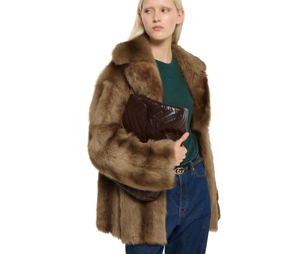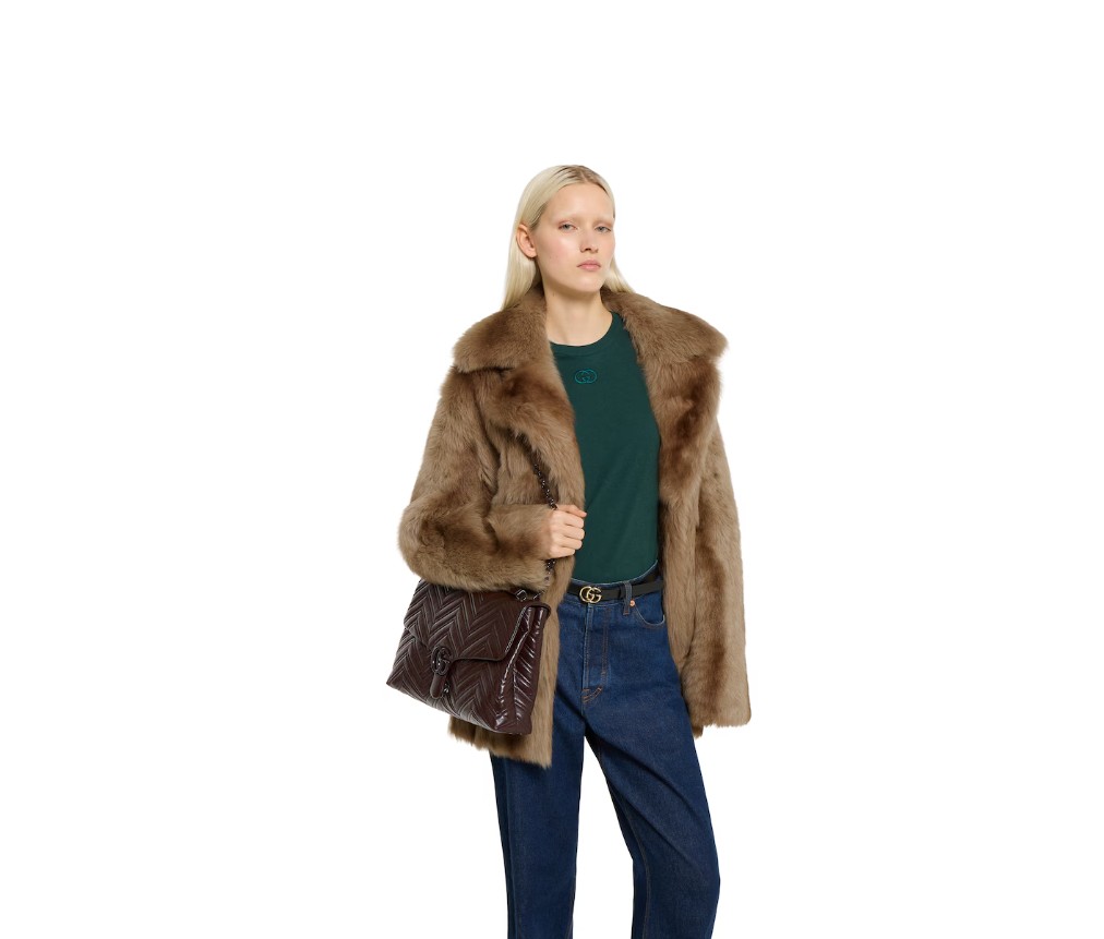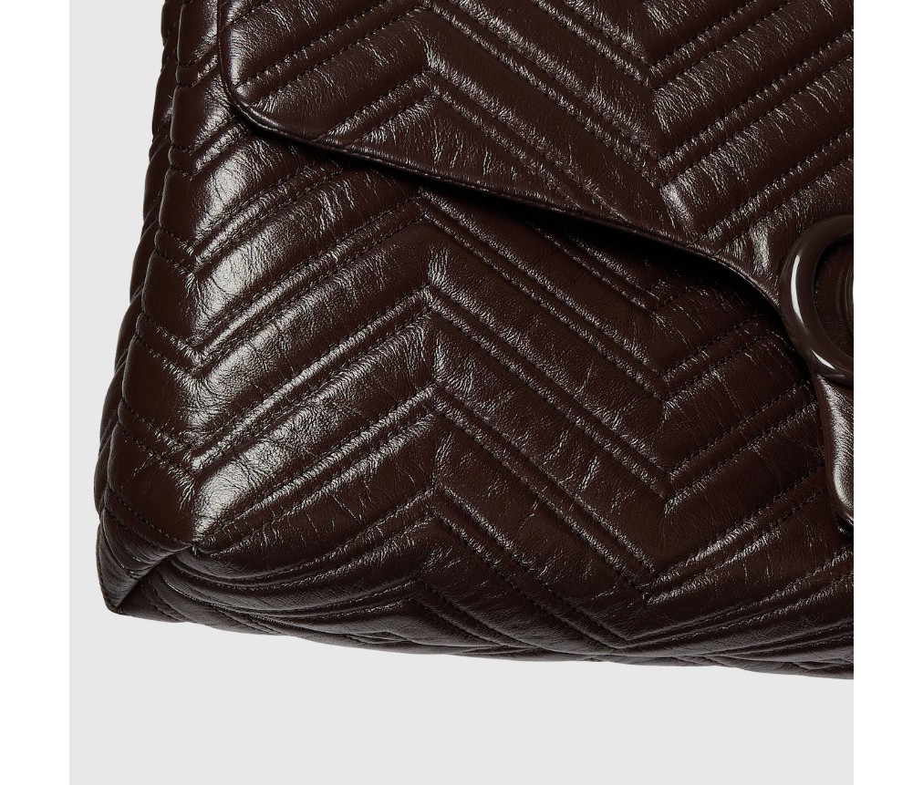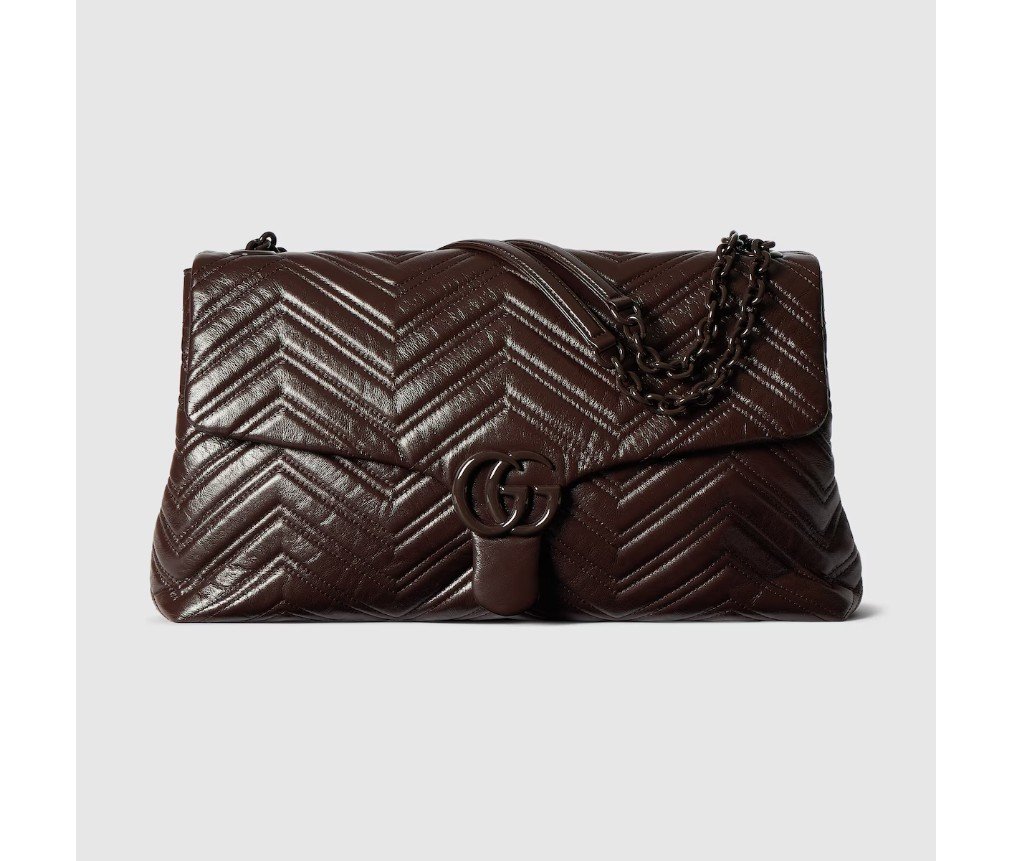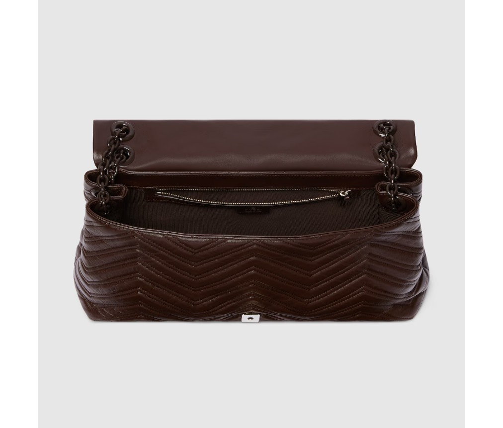 2025 가을/겨울 컬렉션에서 하우스의 시그니처 컬렉션인 GG 마몽은 상징적인 더블 G, 각진 체인 스트랩, 그리고 부드럽고 구조적인 실루엣이 특징입니다. 부드럽고 가벼운 마틀라세 쉐브론 가죽으로 제작되었으며, 톤온톤 에나멜 하드웨어와 체인이 특징입니다.