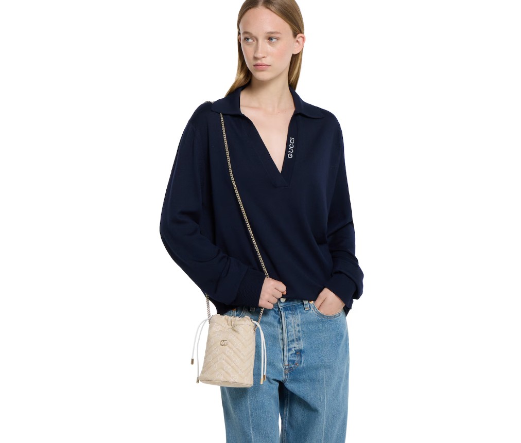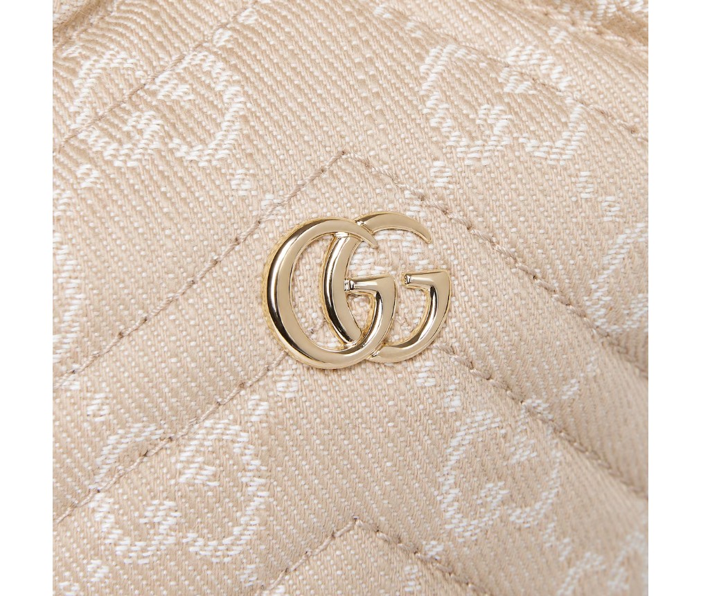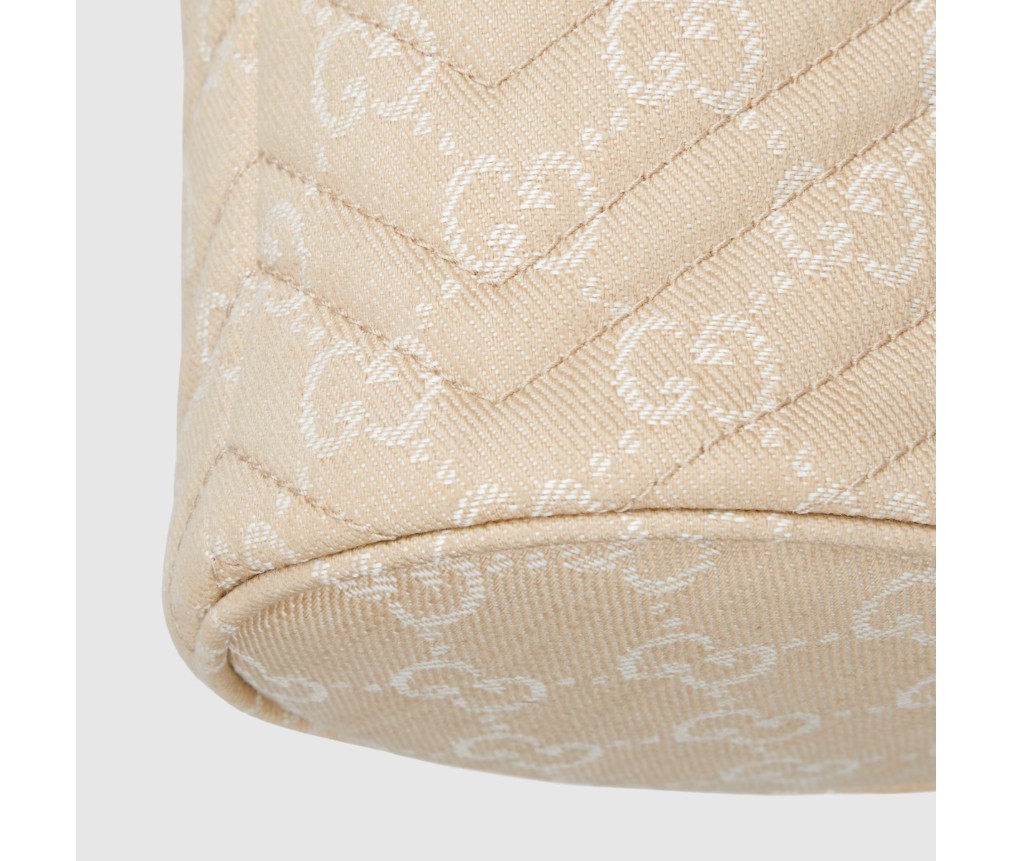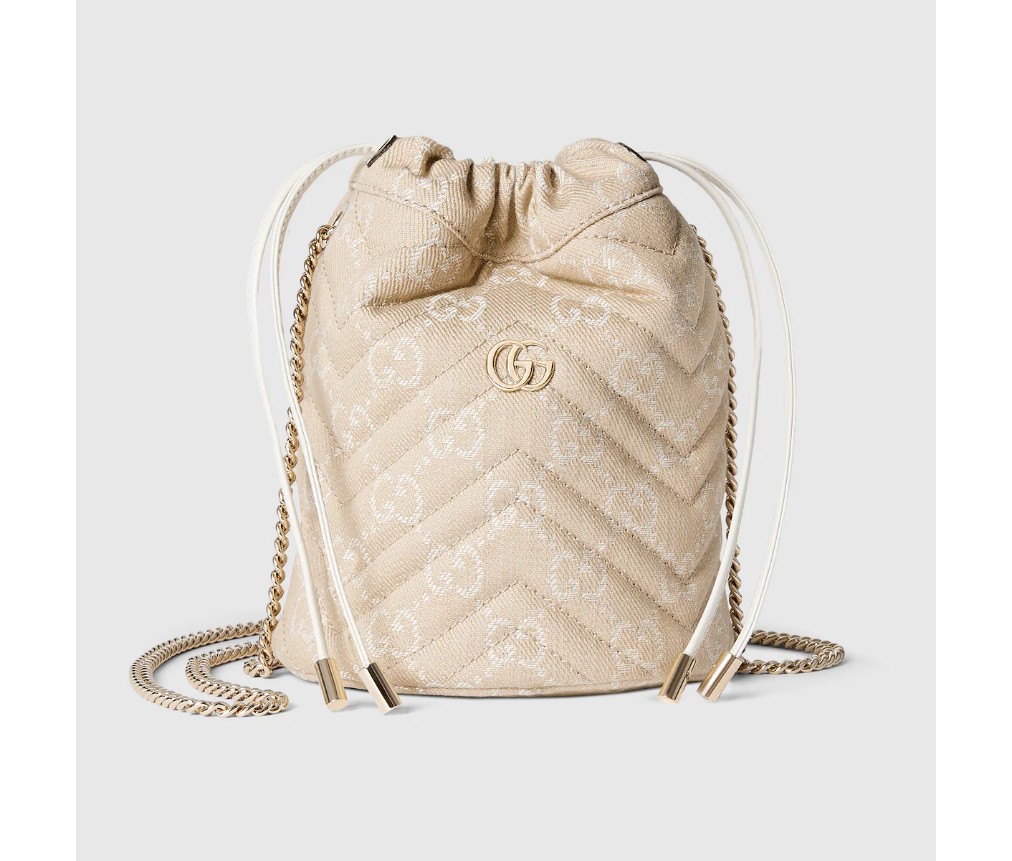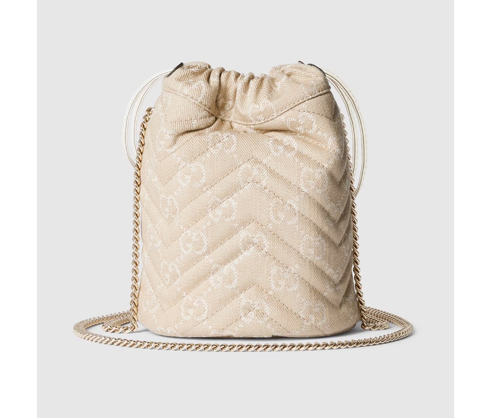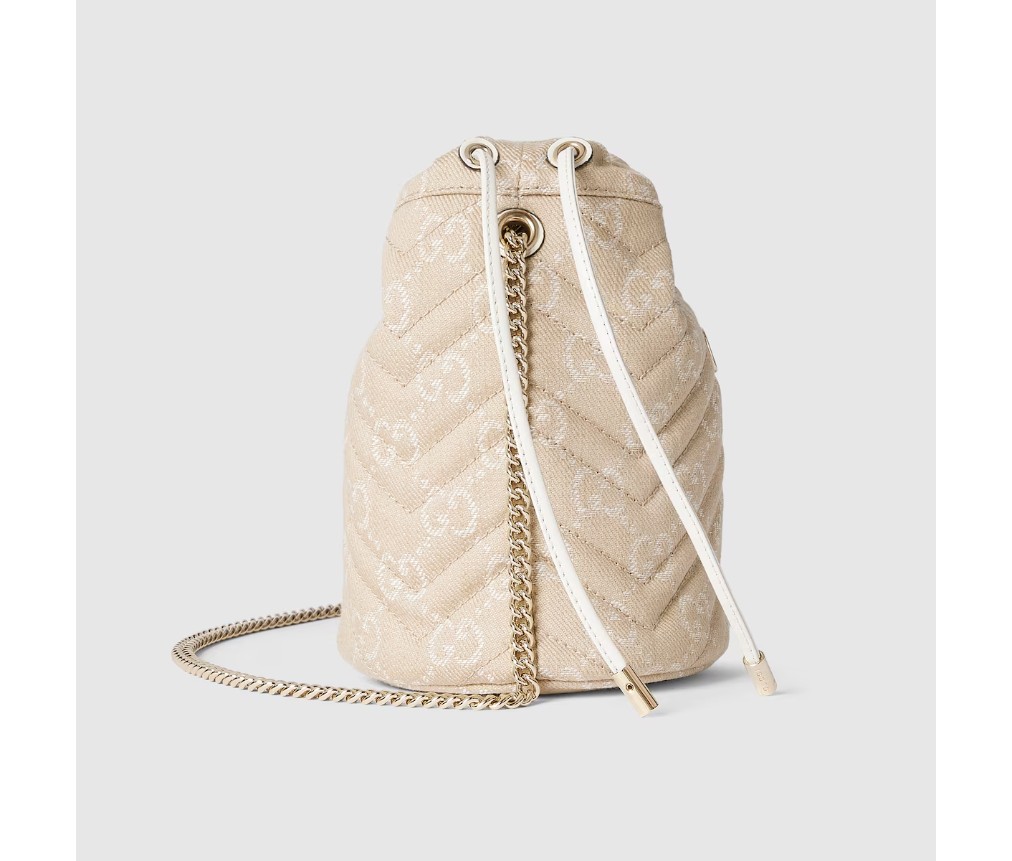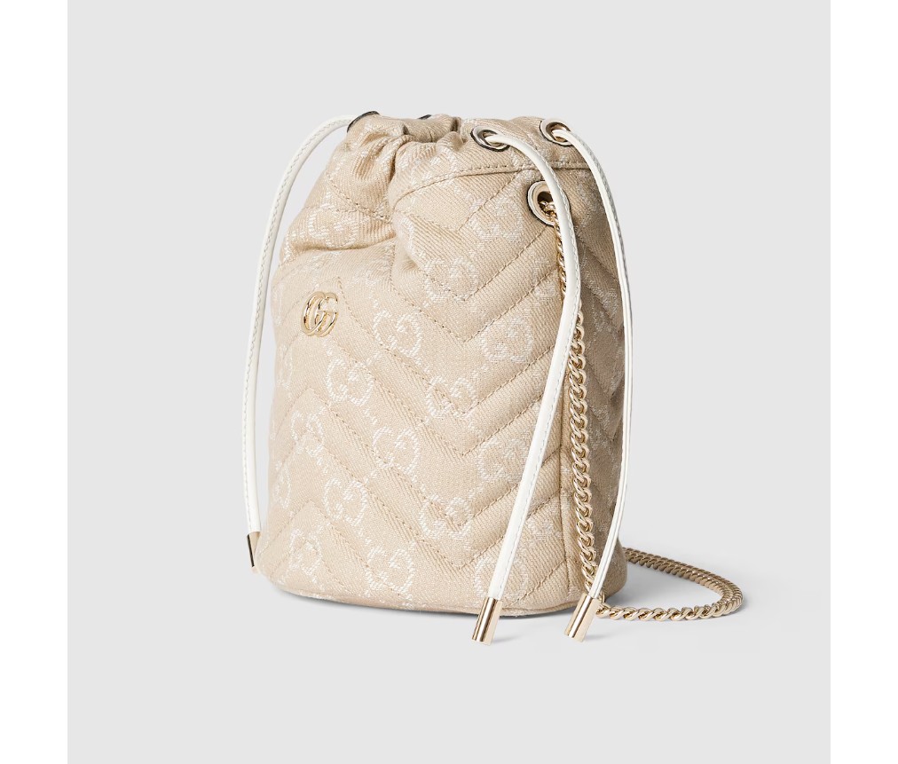 이 GG 마몽 버킷 백은 세련된 마틀라세 셰브론 데님 소재로 제작되었습니다. 1970년대 아카이브에서 영감을 받아 하우스의 시그니처로 자리 잡은 이 라인의 상징적인 더블 G 하드웨어가 백의 형태를 완성합니다.