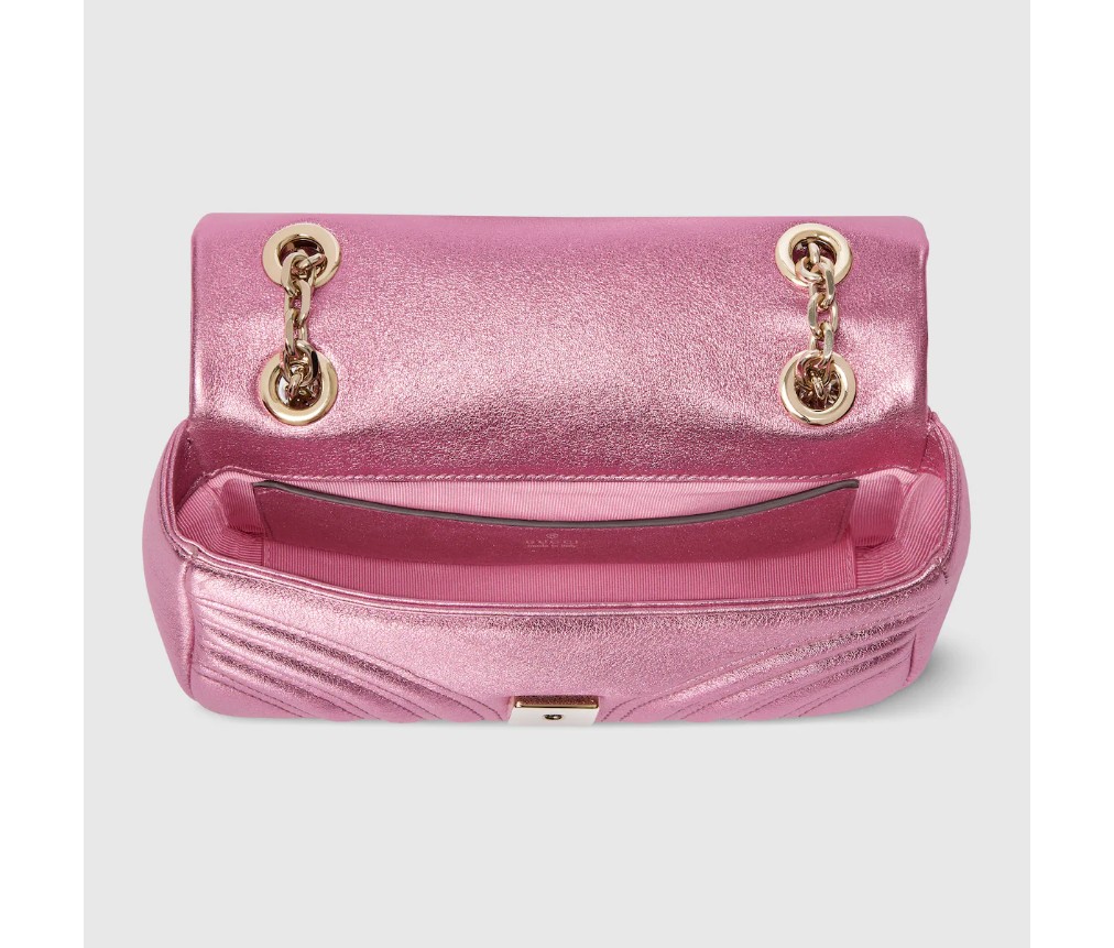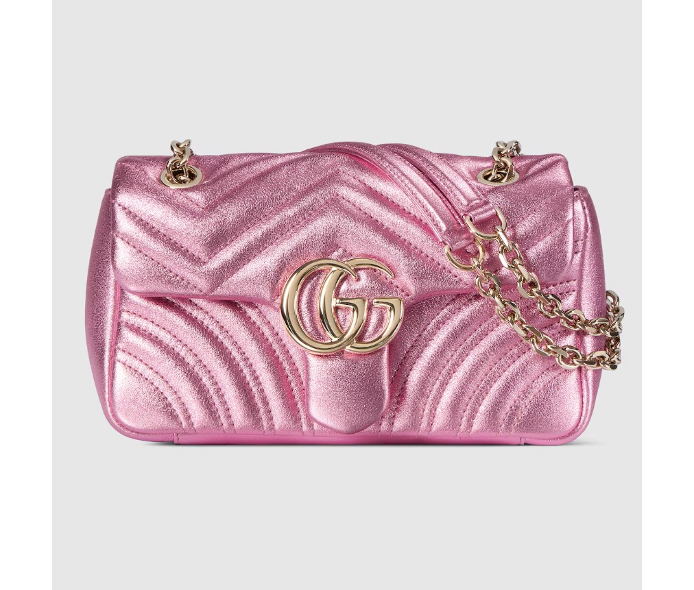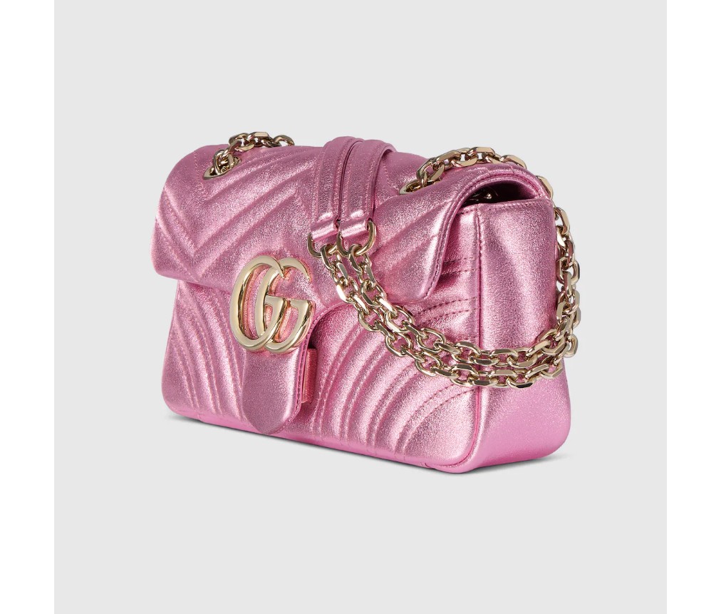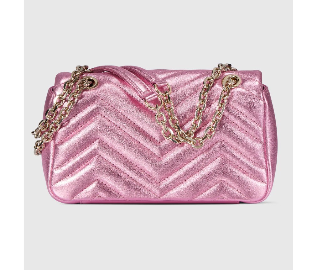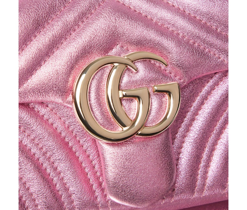 하우스의 시그니처 컬렉션인 GG 마몽은 상징적인 더블 G 로고와 라이트 골드 톤 마감의 각진 체인 스트랩이 특징입니다. 이 숄더백 스타일은 라메 가죽으로 제작되었으며, 아름다운 밝은 핑크 색상으로 선보입니다.