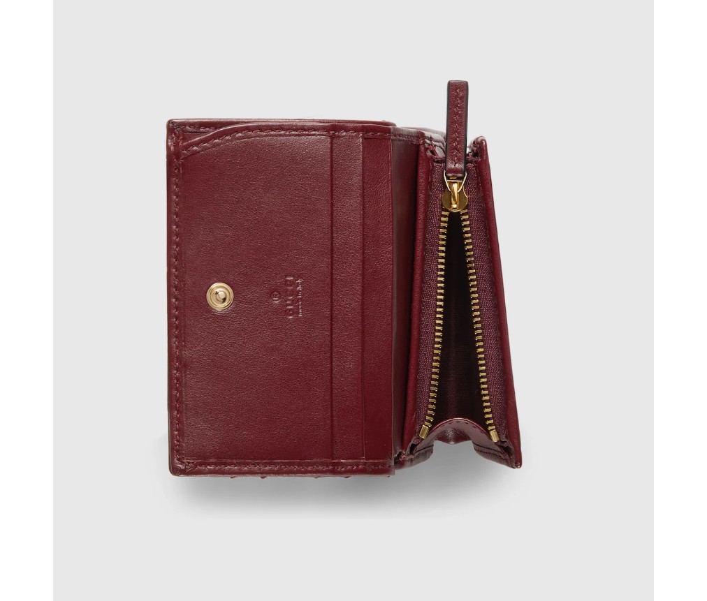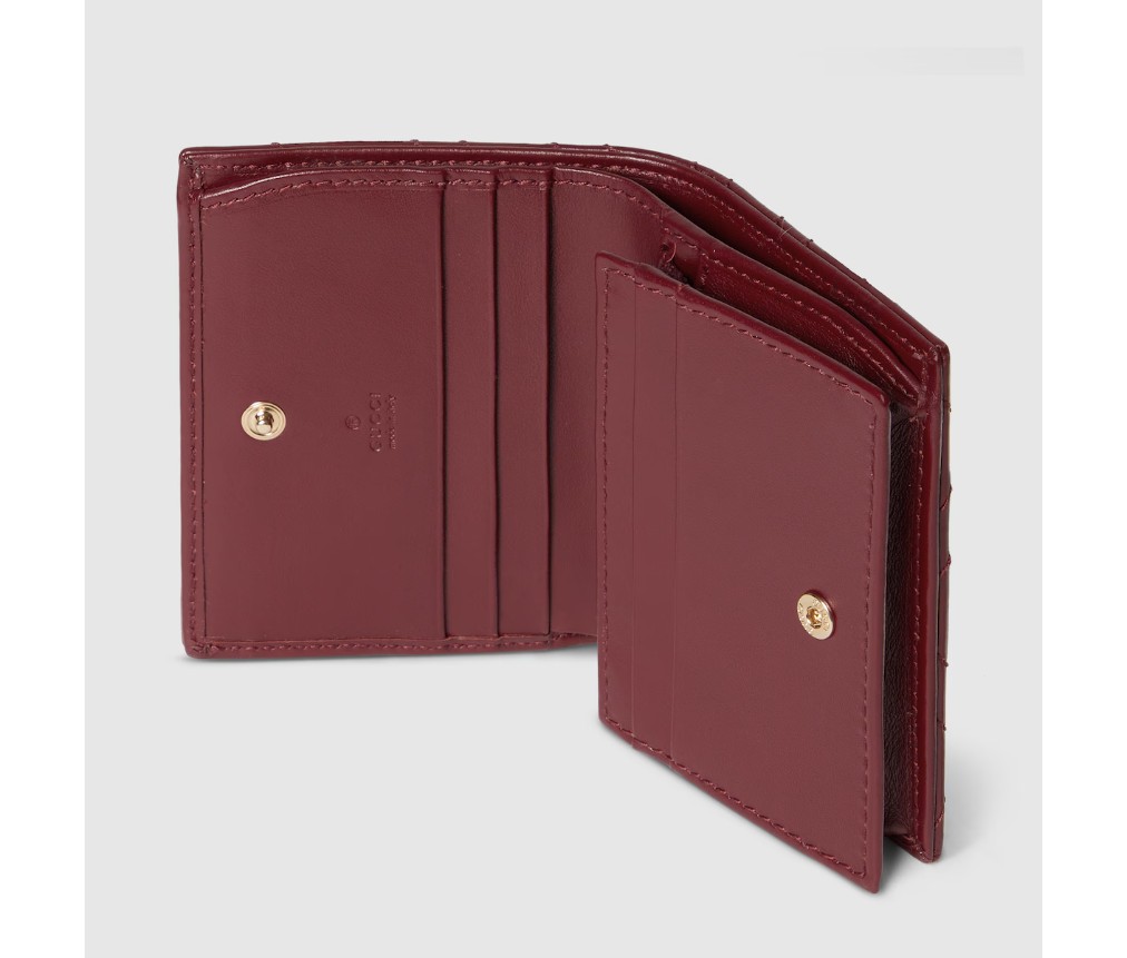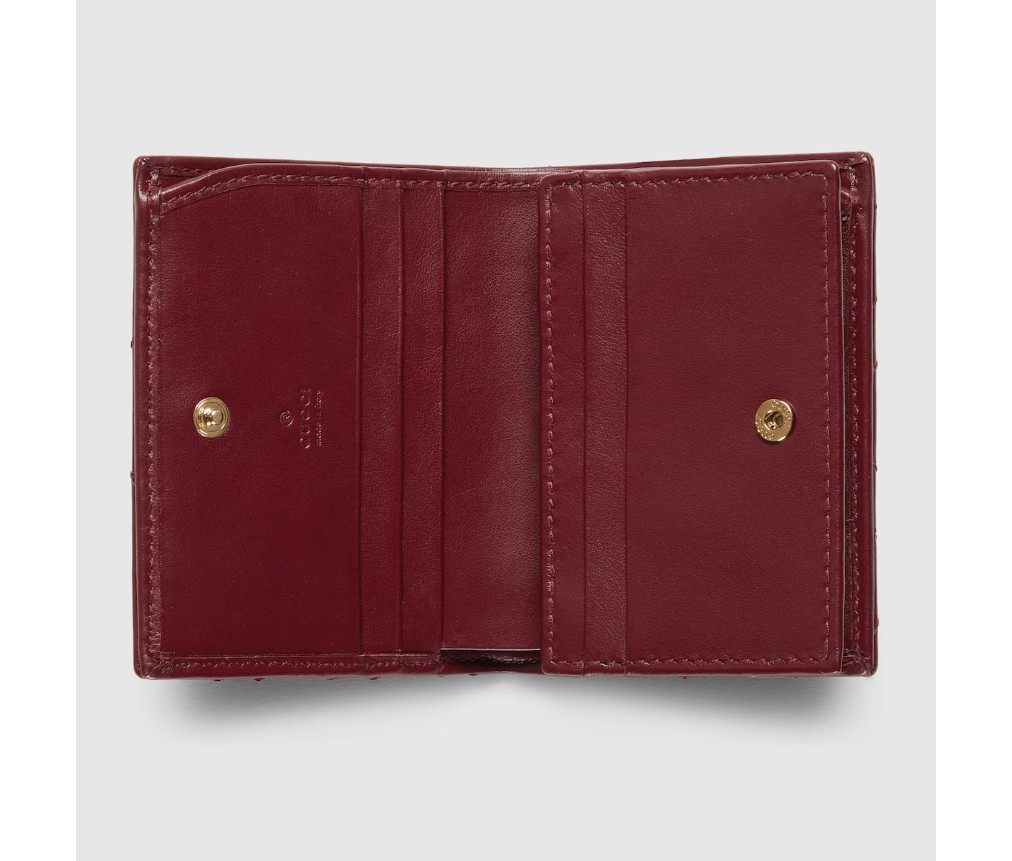 이 GG 마몽 접이식 카드 케이스는 새롭게 선보이는 구찌 로소 앙코라 레드 마틀라세 쉐브론 가죽으로 제작되었습니다. 밝은 골드 톤의 시그니처 더블 G 하드웨어가 이 액세서리의 특징을 더욱 돋보이게 하며, 5개의 카드 슬롯을 갖추고 있습니다.