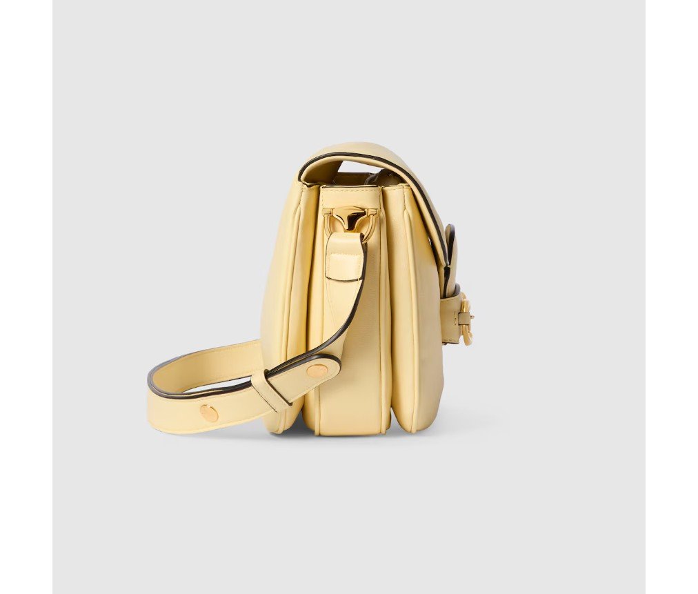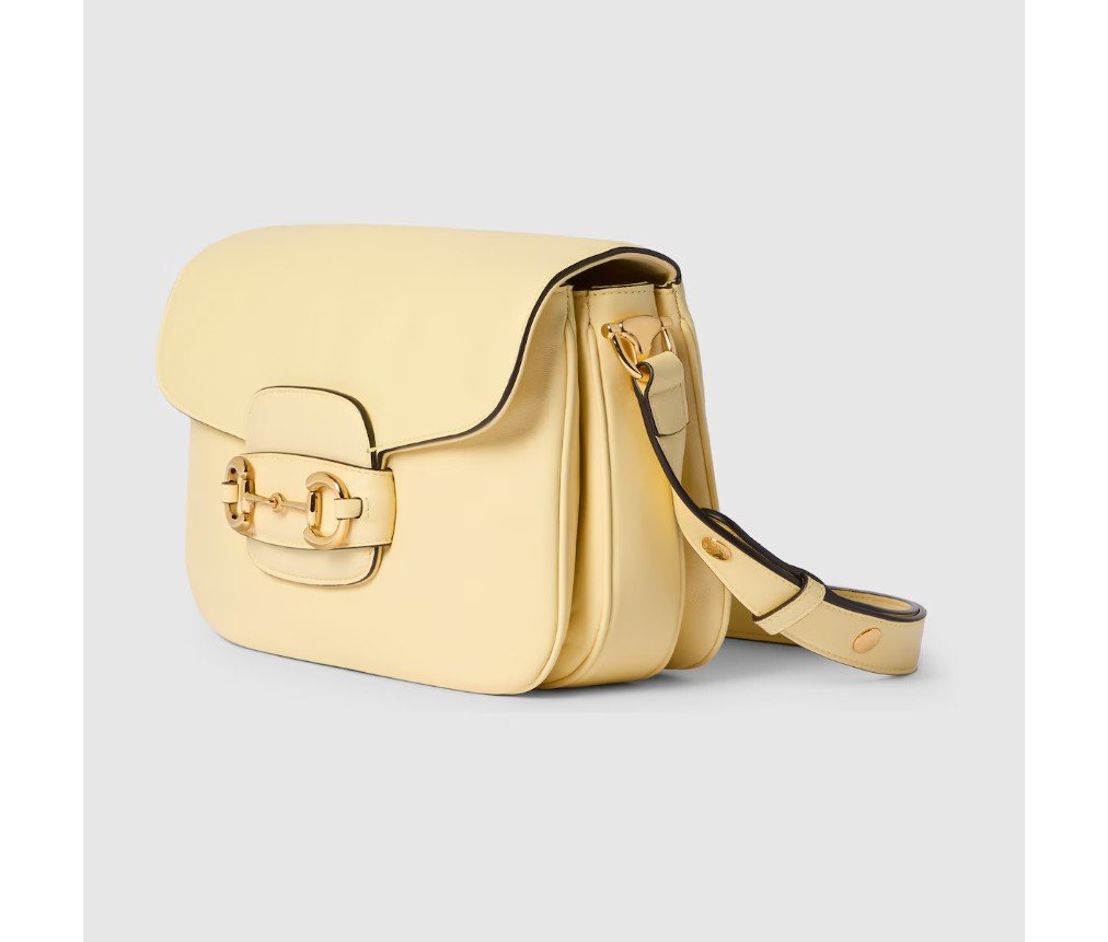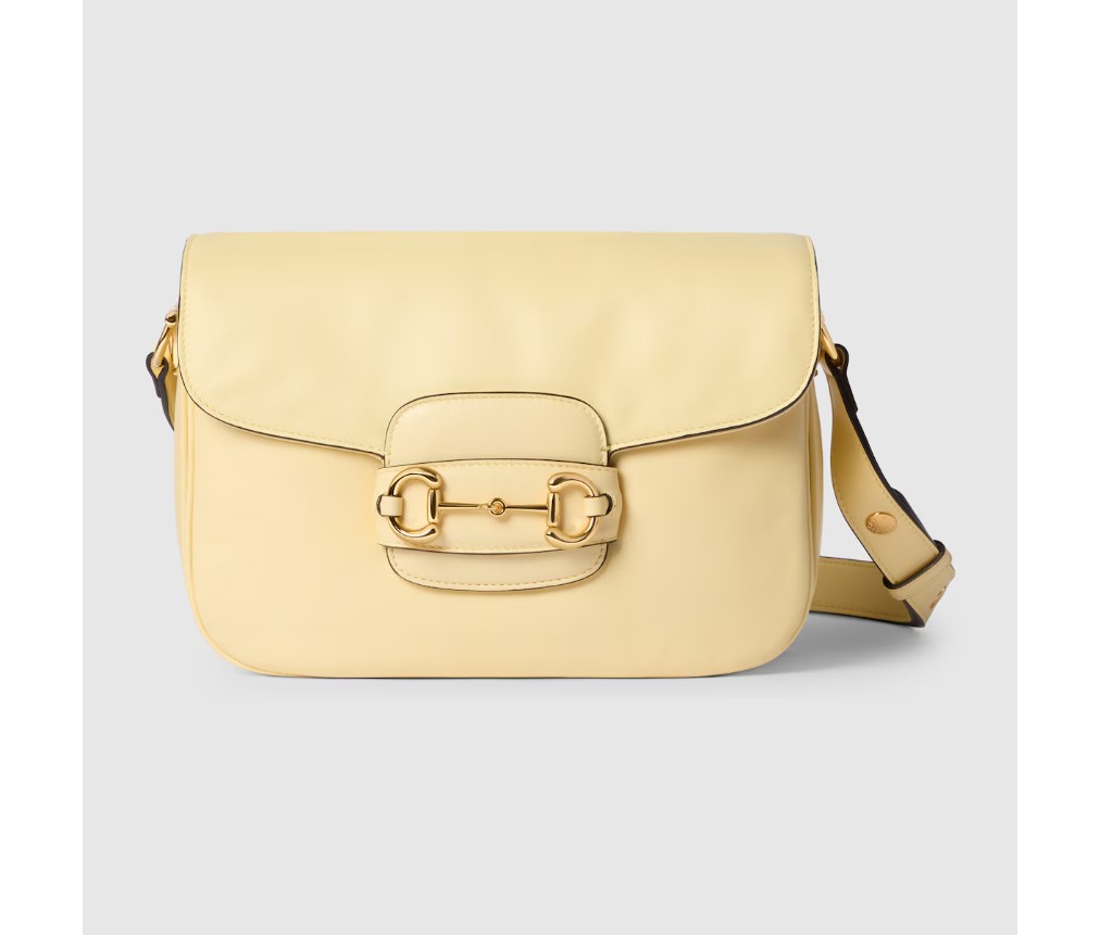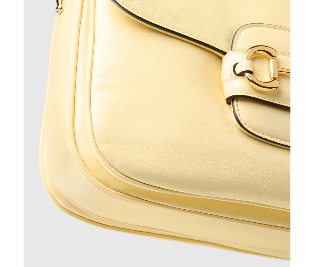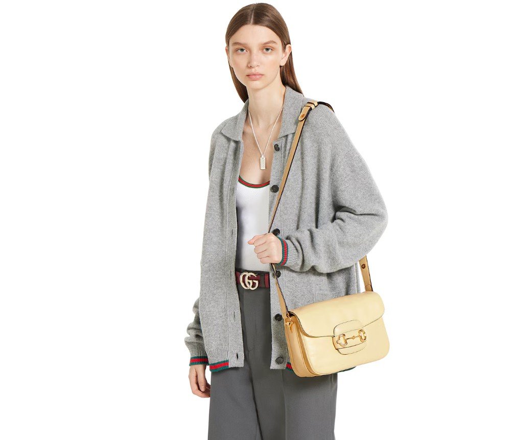 2025년 가을/겨울 컬렉션에서 구찌 호스빗 1955는 승마에서 영감을 받은 디자인을 이어받았으며, 더블 링과 바 하드웨어를 사용하여 밝은 골드 톤 디테일과 부드럽고 매끄러운 가죽을 숄더백에 결합했습니다.