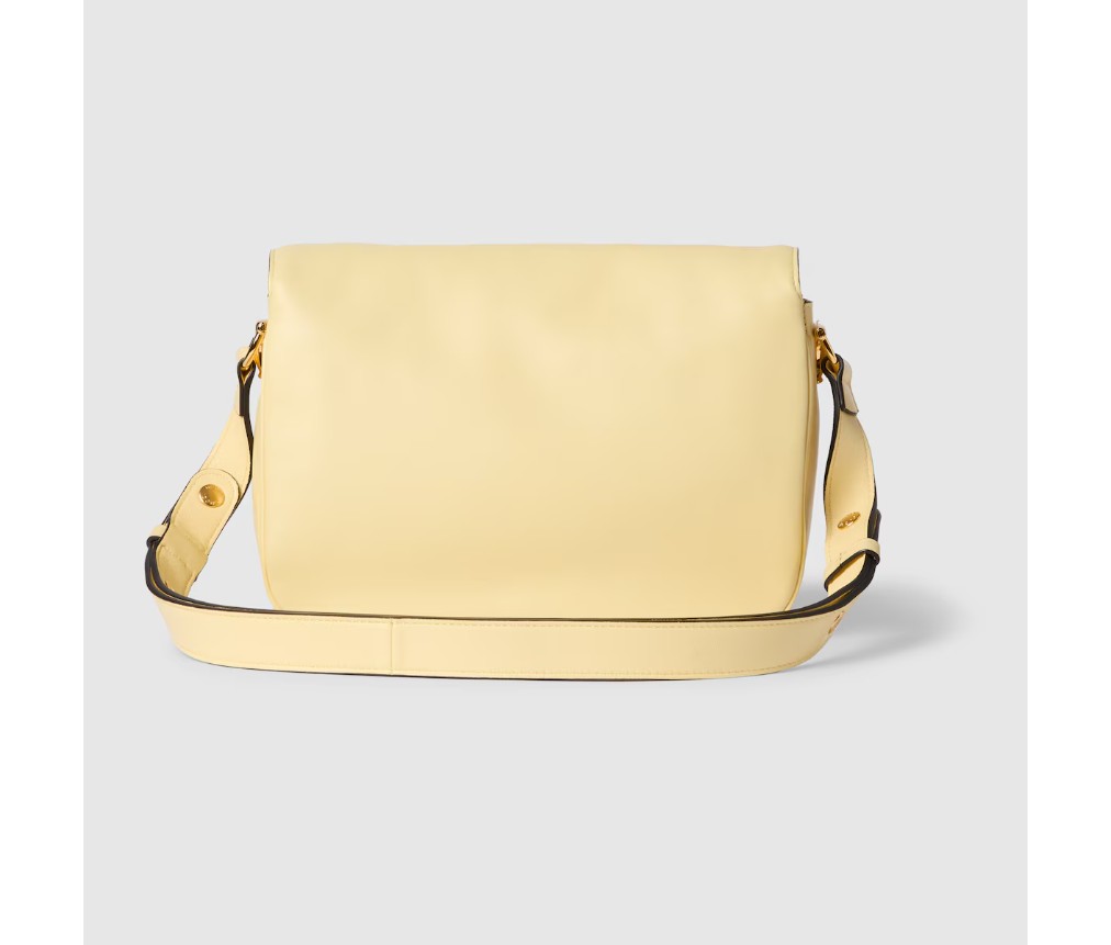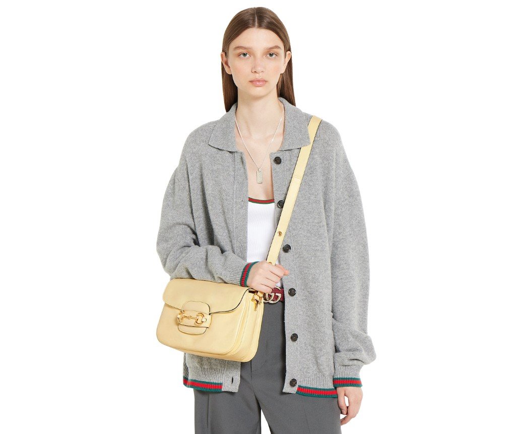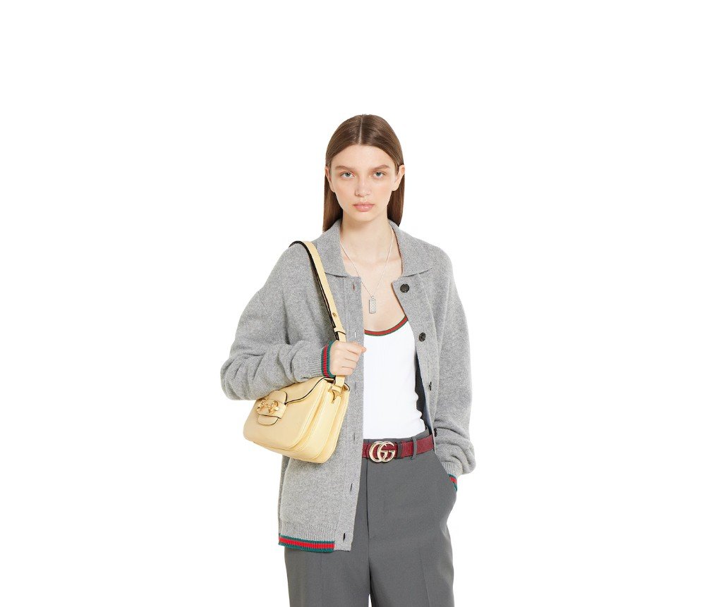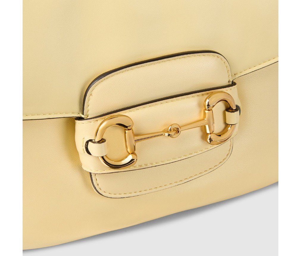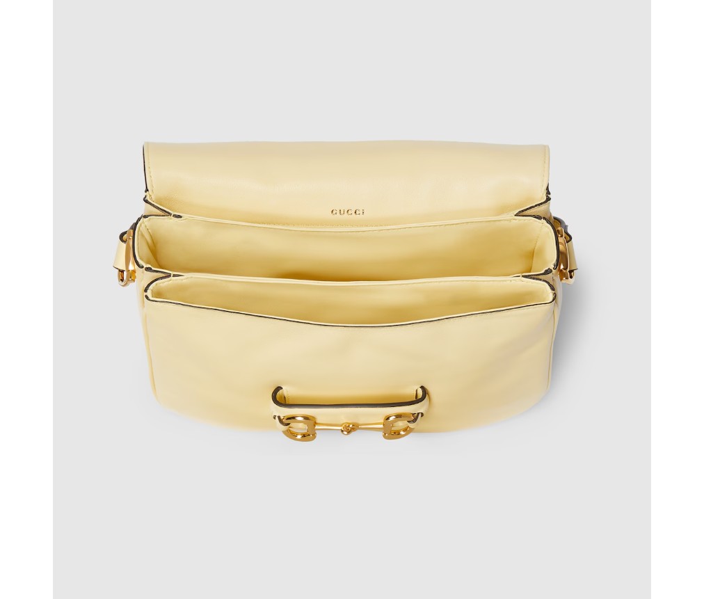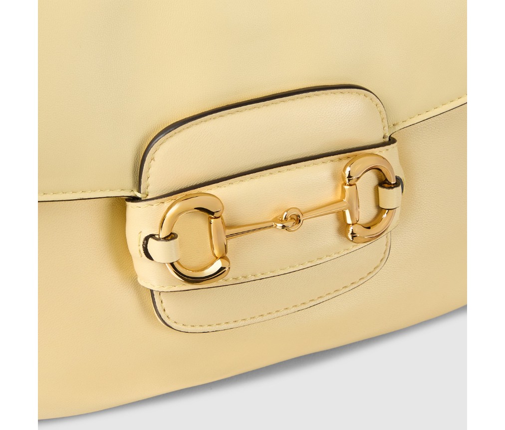2025년 가을/겨울 컬렉션에서 구찌 호스빗 1955는 승마에서 영감을 받은 디자인을 이어받았으며, 더블 링과 바 하드웨어를 사용하여 밝은 골드 톤 디테일과 부드럽고 매끄러운 가죽을 숄더백에 결합했습니다.