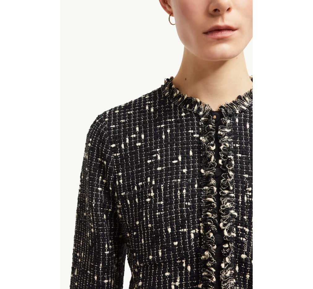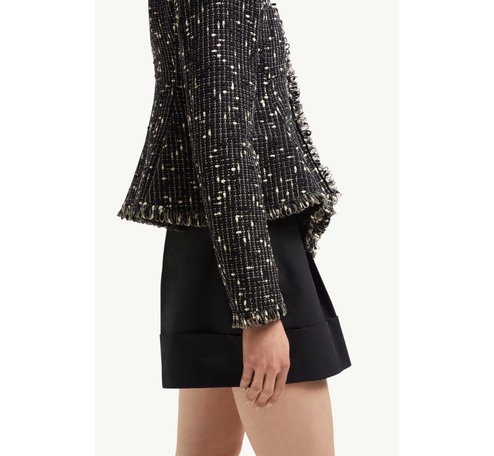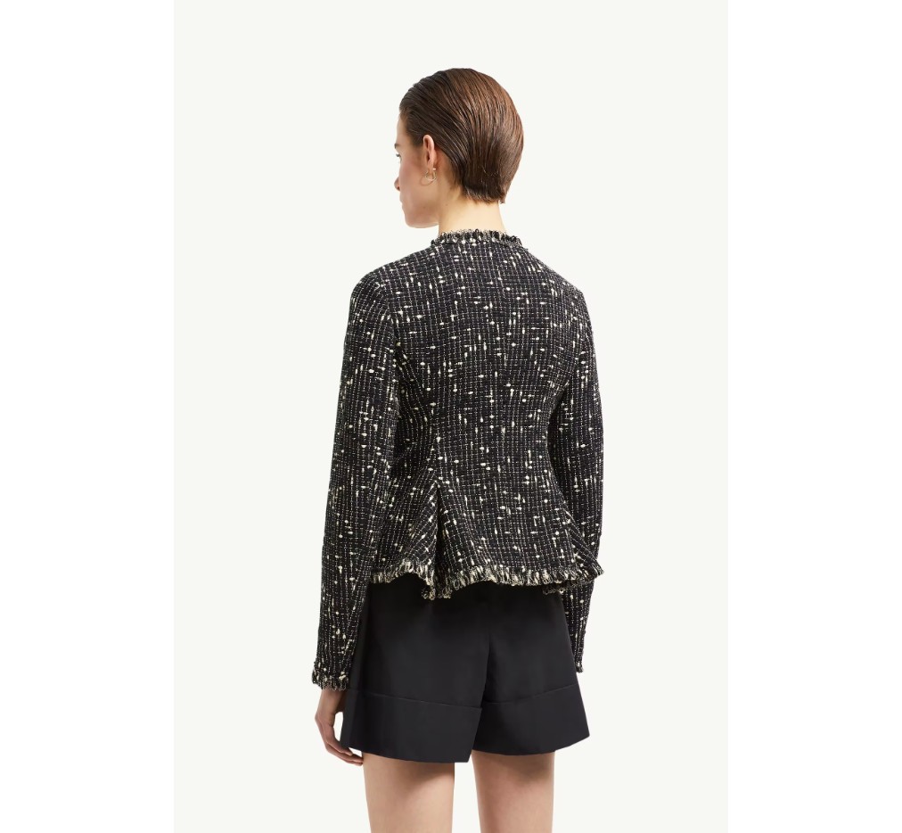 여성복에 대한 새로운 비전을 제시하는 베르누이 재킷은 여성스러운 실루엣과 클래식 트위드 소재의 조화가 돋보입니다. 짧은 디자인은 몸에 꼭 맞는 허리와 플레어 밑단으로 매력적인 모래시계 실루엣을 완성합니다. 칼라리스 디자인은 세련된 느낌을 더하며, 캐주얼한 여름 룩에 레이어드하거나 깔끔한 작업복과도 잘 어울립니다.
