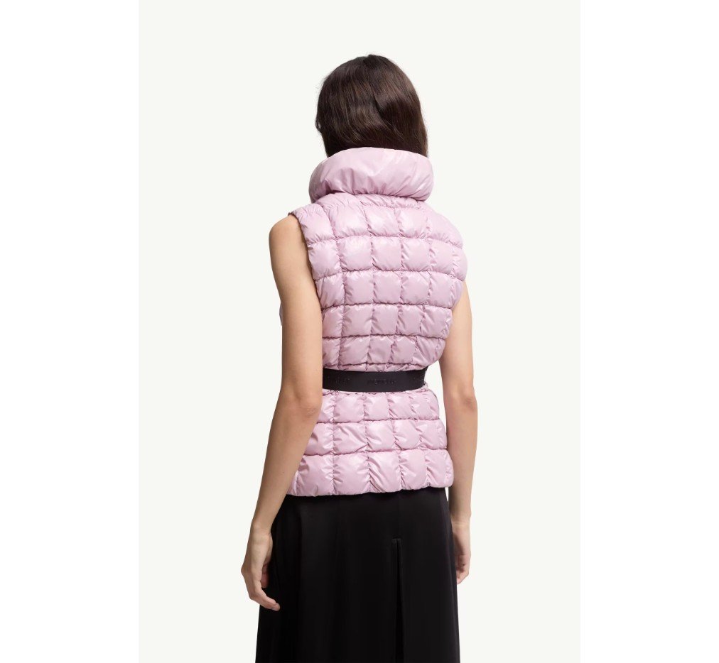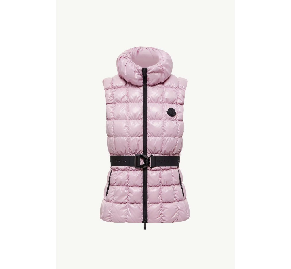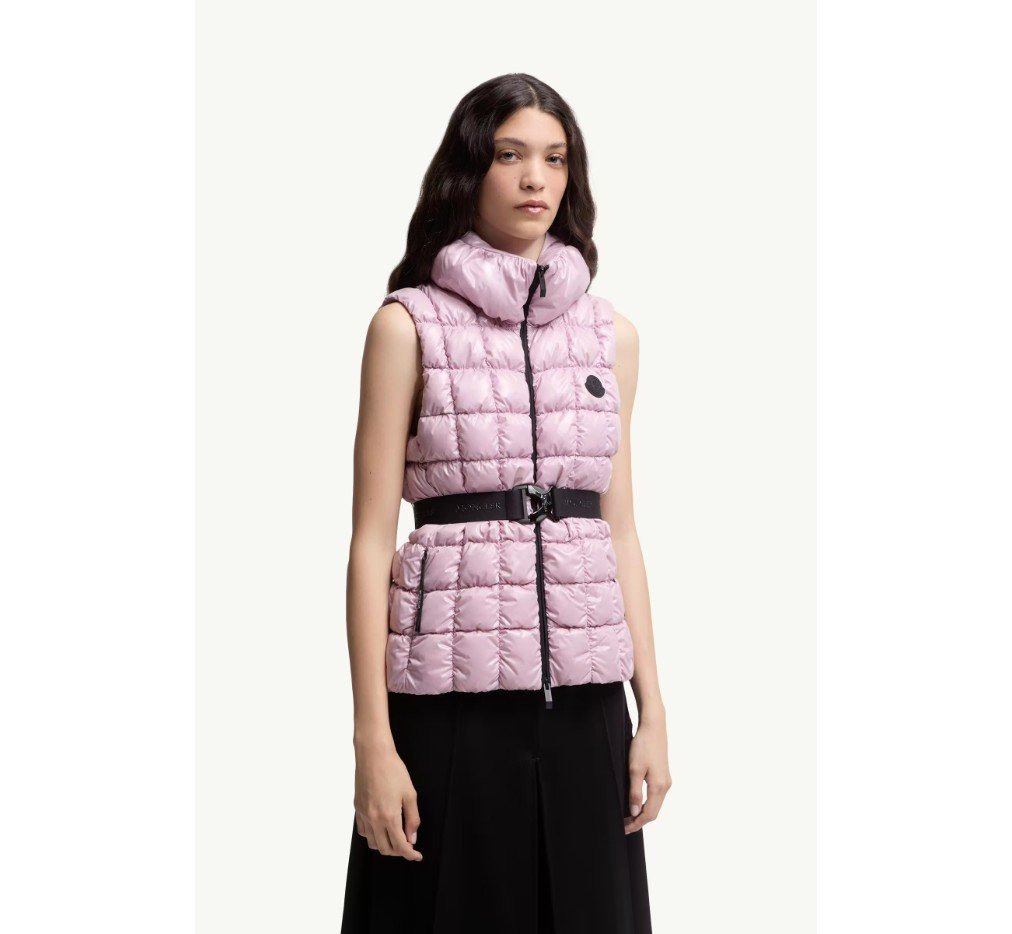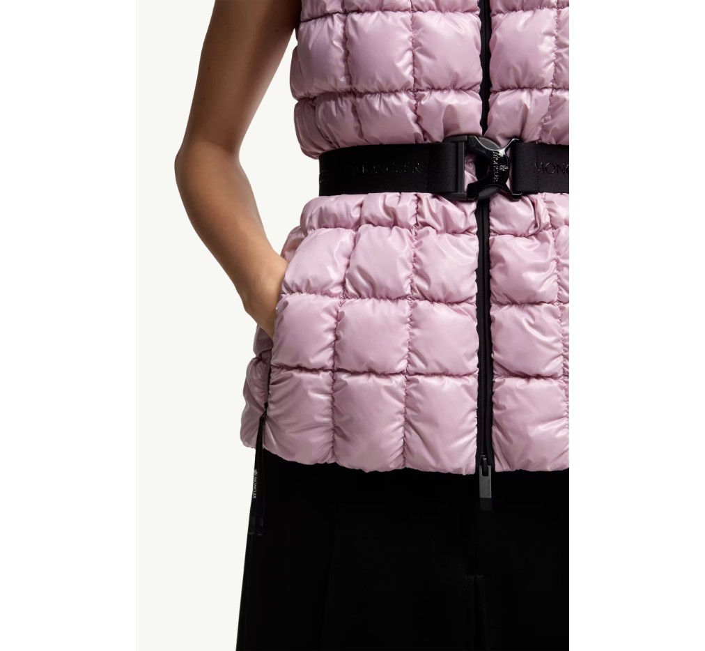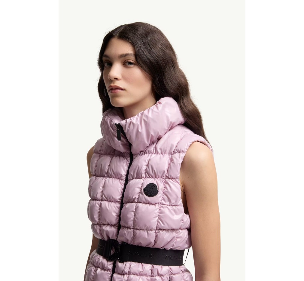 시각적으로 매우 인상적인 에밀리옹 다운 조끼는 사각형 패턴의 그래픽 퀼팅으로 독특한 매력을 더합니다. 나일론 라케 소재로 제작된 이 패딩 조끼는 허리 부분의 신축성 있는 벨트가 플레어 실루엣을 더욱 돋보이게 합니다.