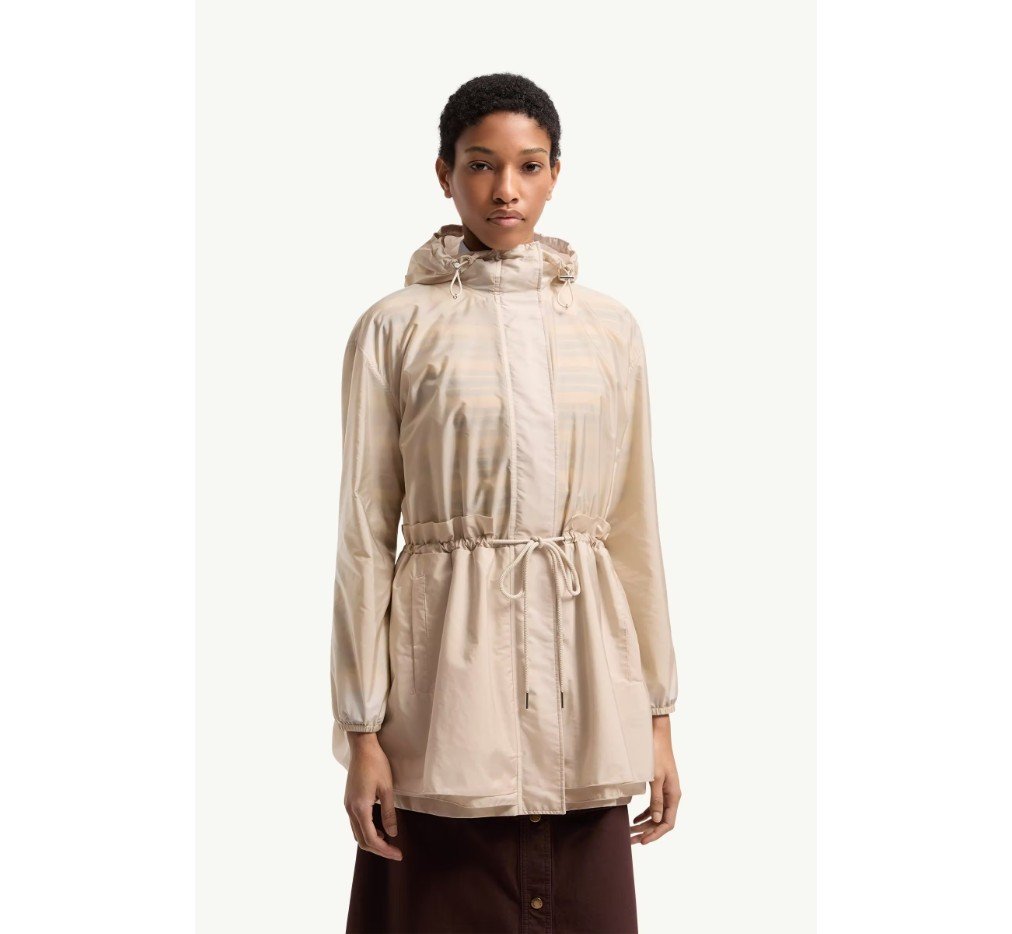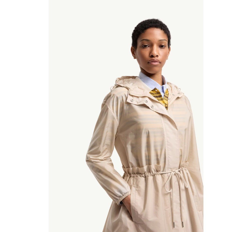 기능성 원단을 전면에 내세운 웨토 재킷은 나일론 소재로 제작되었습니다. 웨토만의 시그니처 원단인 나일론은 은은한 광택과 발수 기능이 뛰어납니다. 실용적인 데일리 디자인에 여성스러운 디테일을 더한 이 재킷은 후드 실루엣에 섬세한 주름과 러플 장식이 조화를 이룹니다.