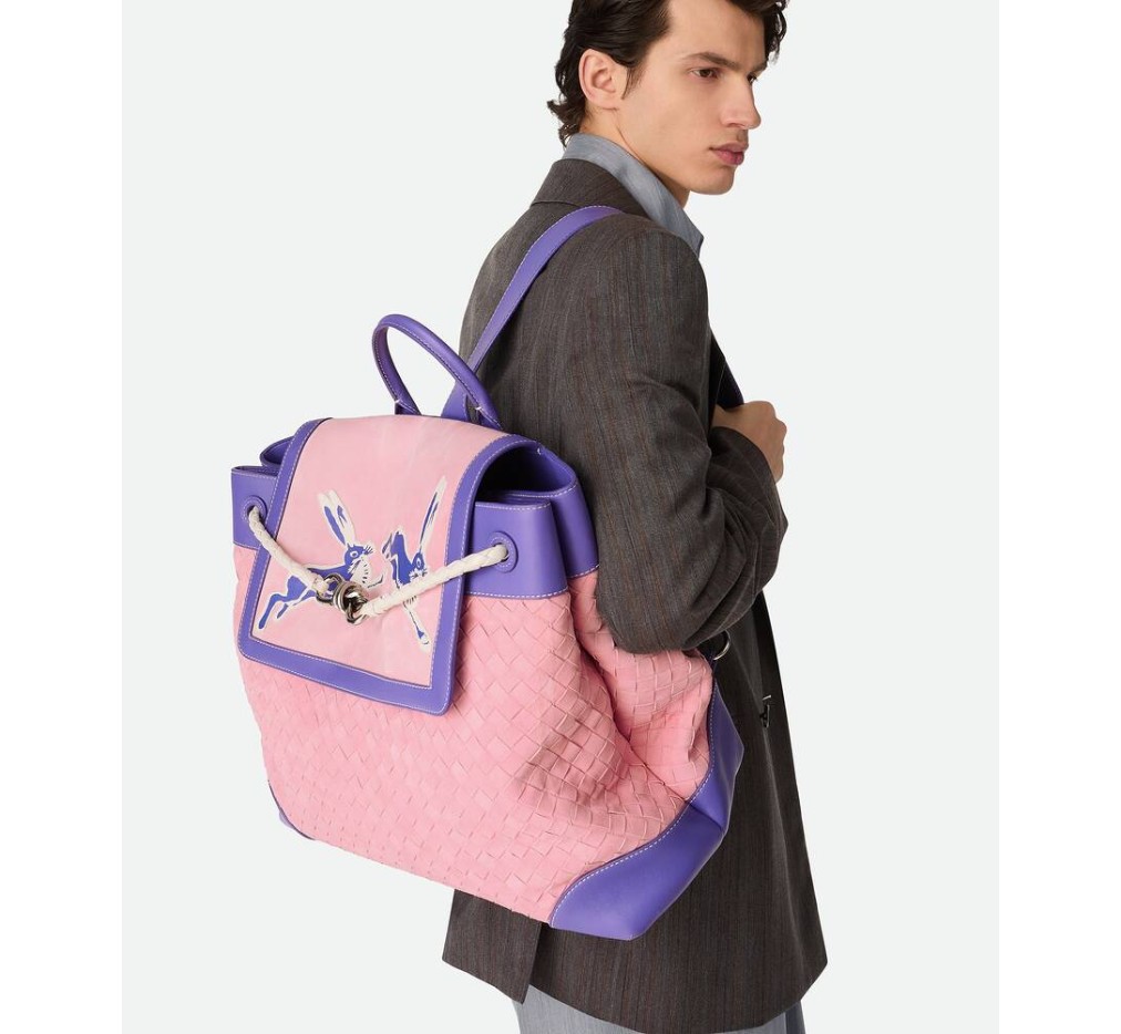 – 가죽 장식과 점프 토끼 패치가 인쇄된 인트레치아토 스웨이드 소재의 대형 백팩