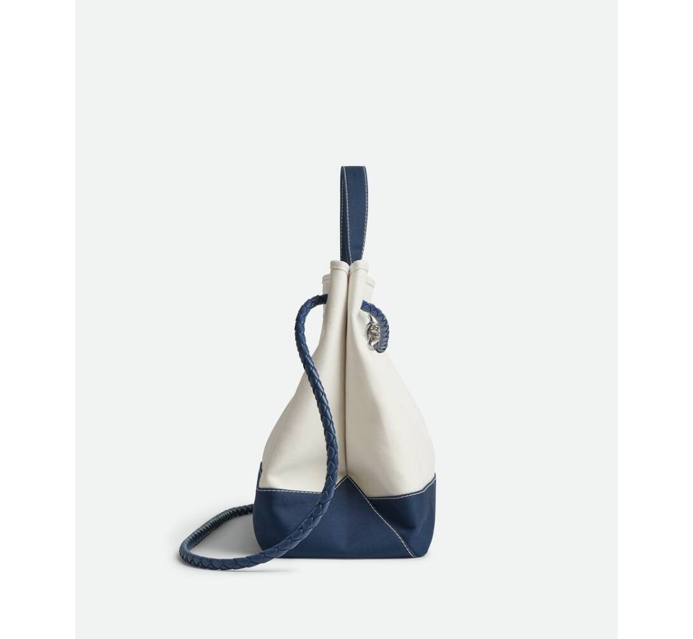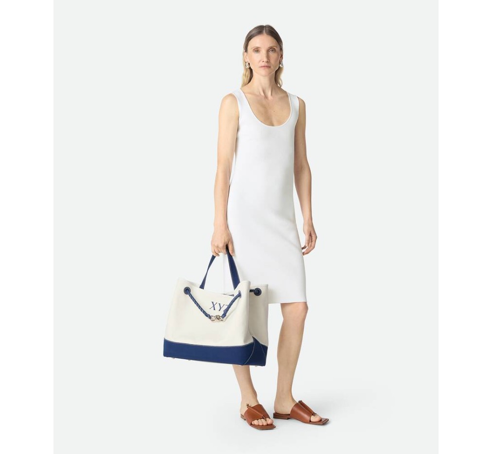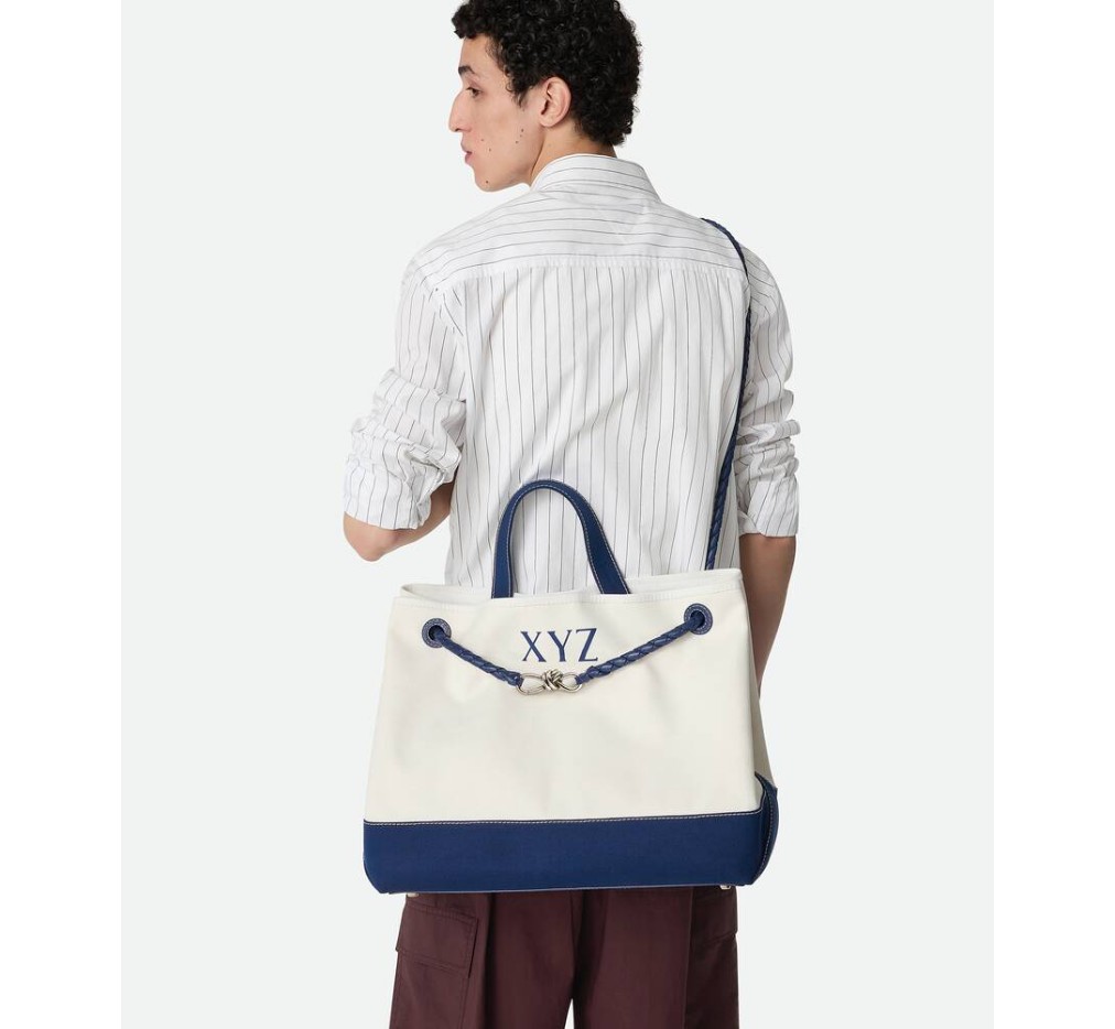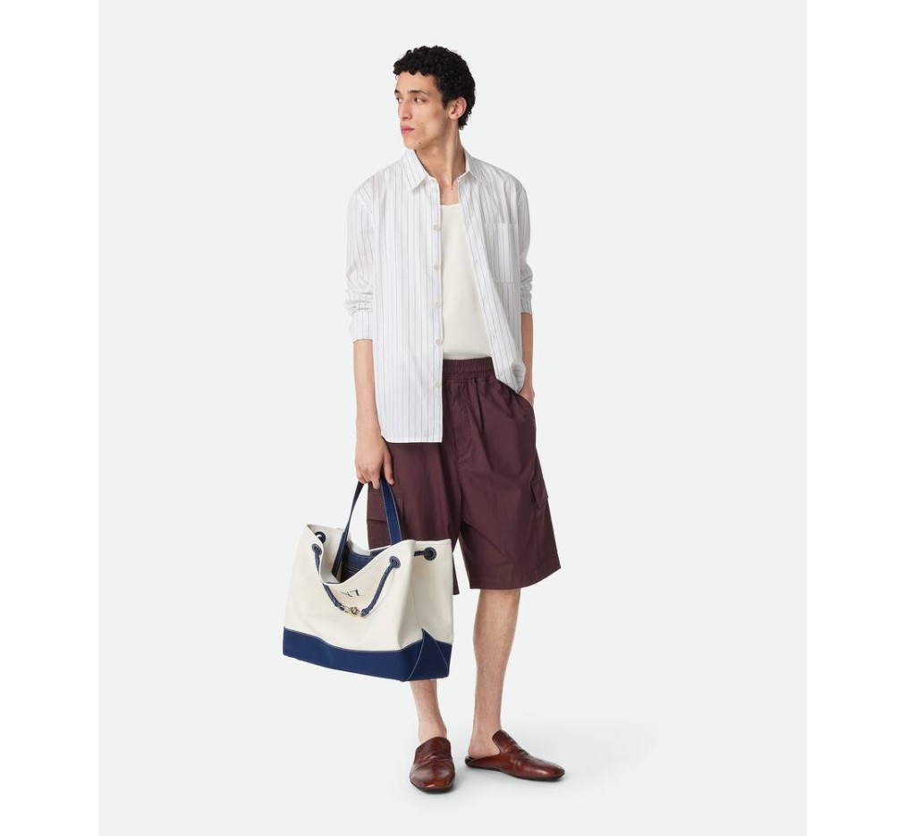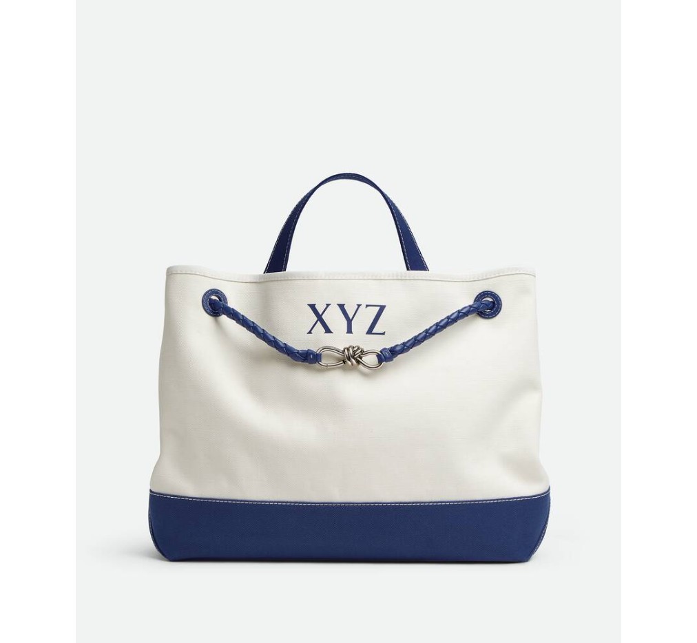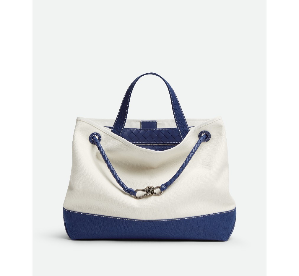 시그니처 매듭 디테일과 가죽 슬라이딩 크로스바디 스트랩이 특징인 바이컬러 캔버스 탑 핸들 백입니다.