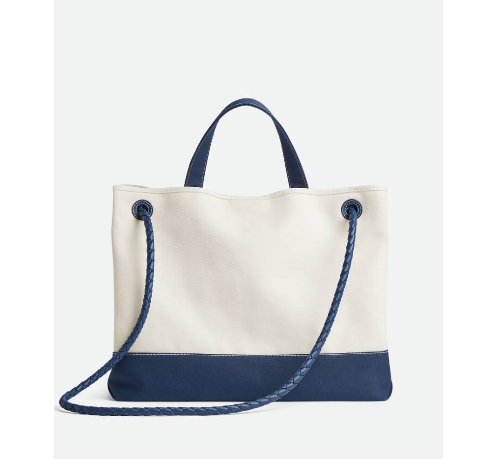 – 가죽 슬라이딩 크로스바디 스트랩이 달린 대형 캔버스 바이컬러 탑 핸들 백