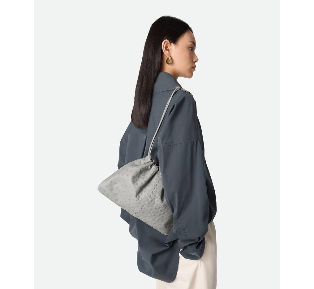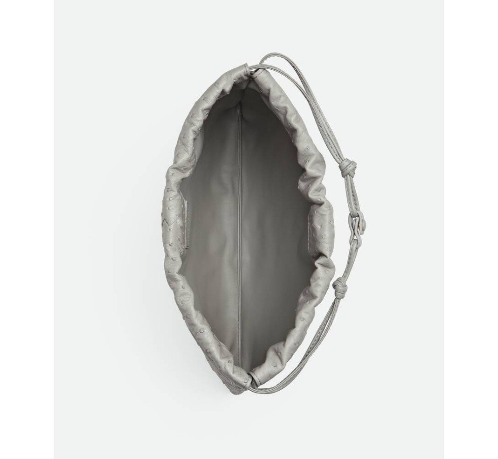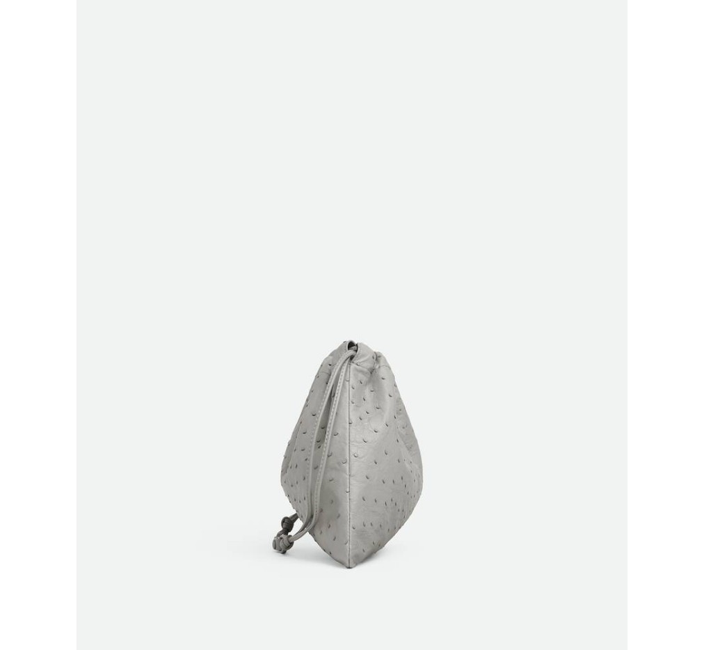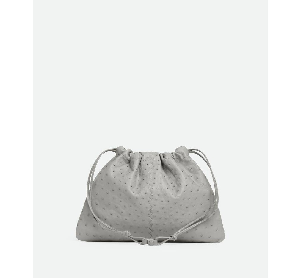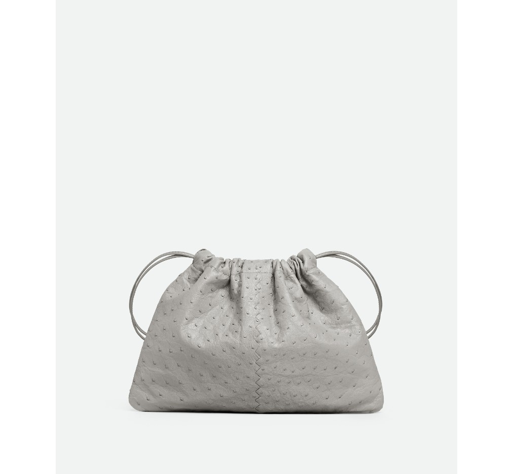 어깨에 메고 다닐 수 있도록 끈으로 여닫을 수 있는 고리가 달린 오스트리치 가죽 더스트백.– 오스트리치 가죽 파우치