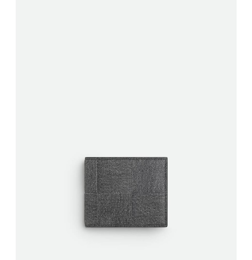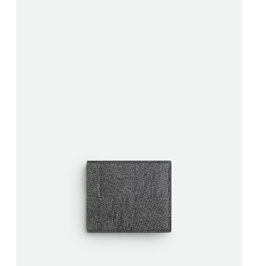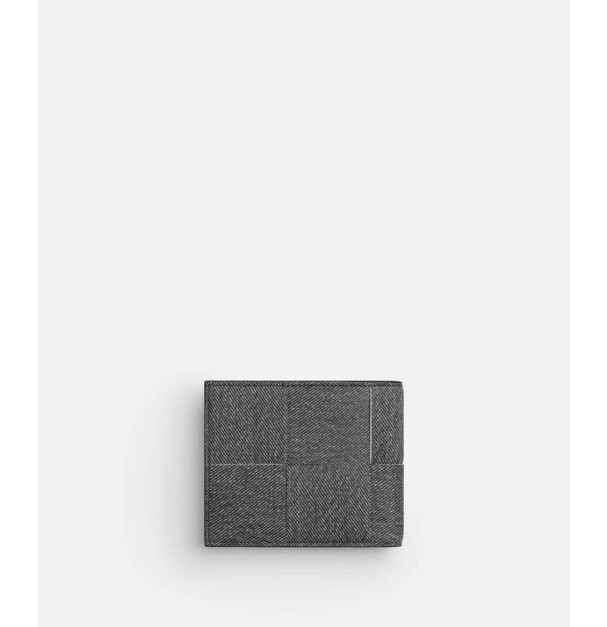 인트레치오 나부크 가죽으로 만든 접이식 지갑으로, 데님 효과가 프린트되어 있으며 동전 지갑이 있습니다.