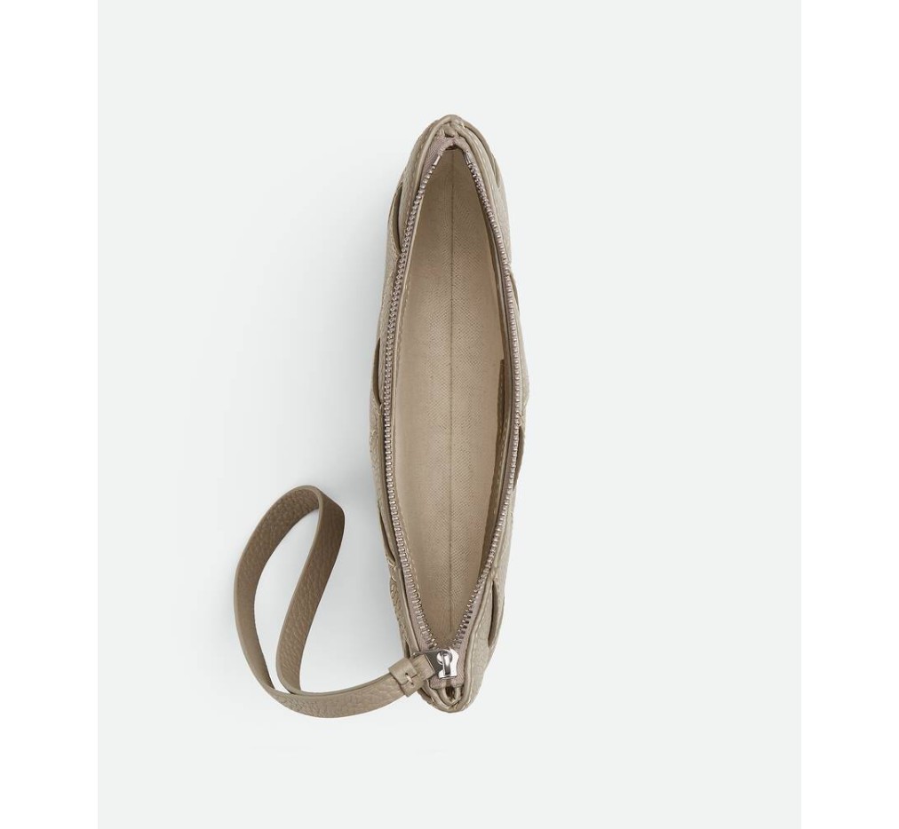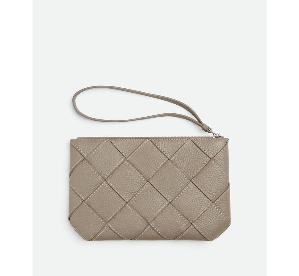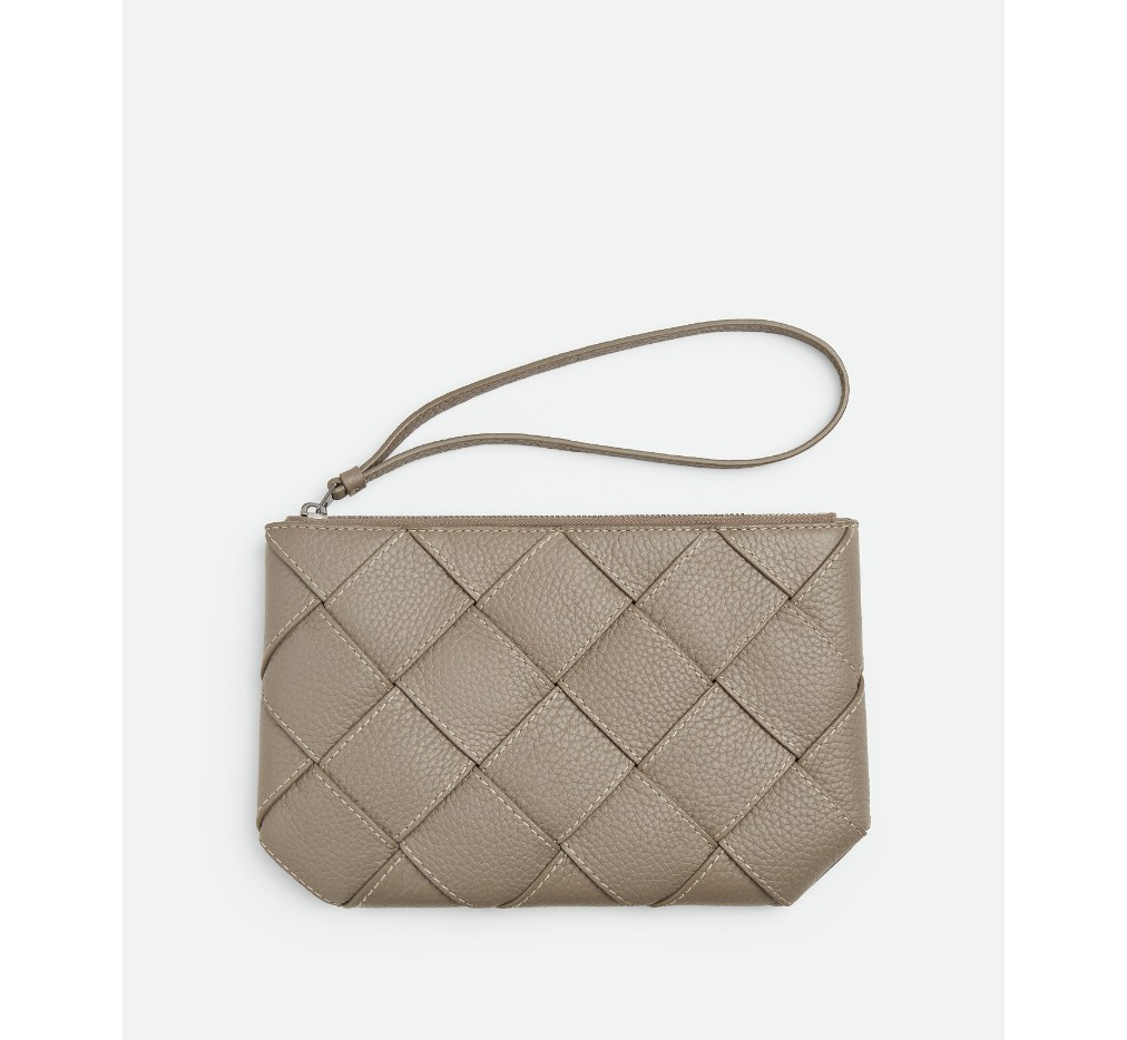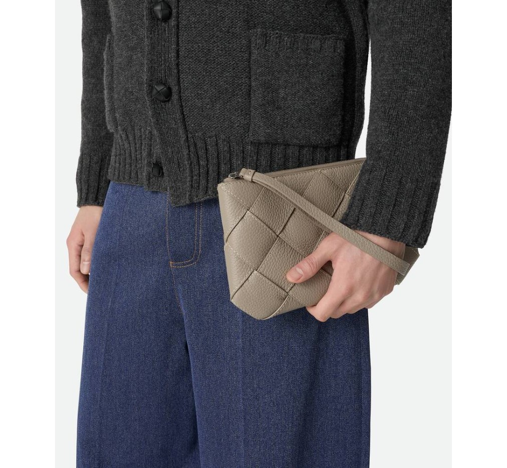 – 대조적인 가장자리 스티칭이 있는 그레인 인트레치오 가죽 소재의 중간 크기 손목 파우치