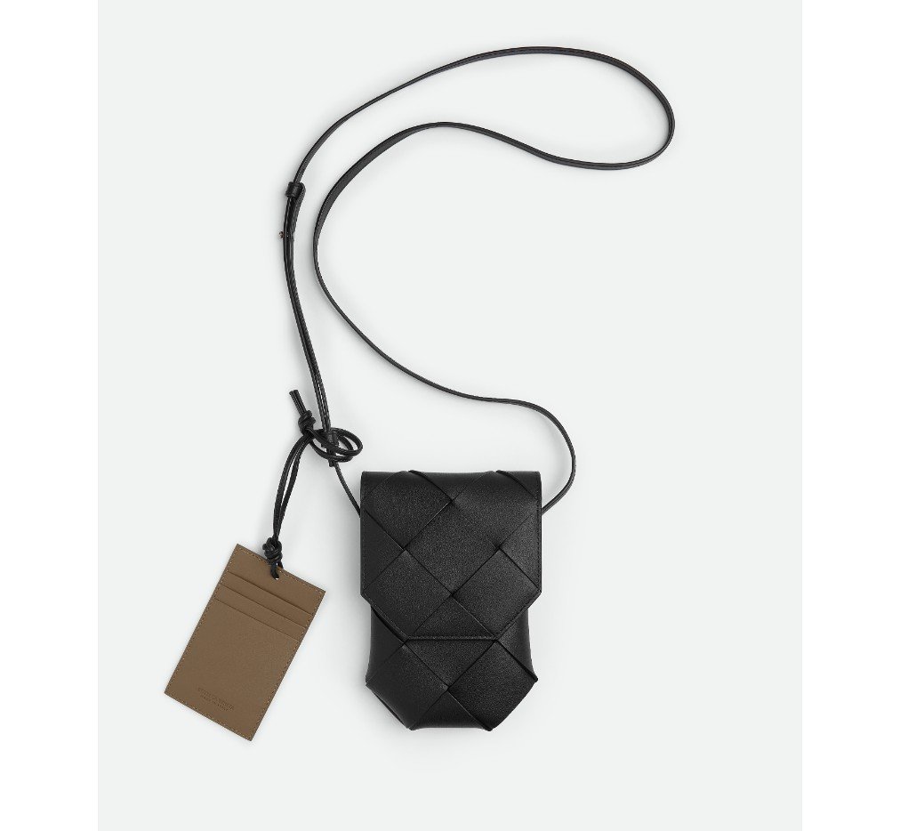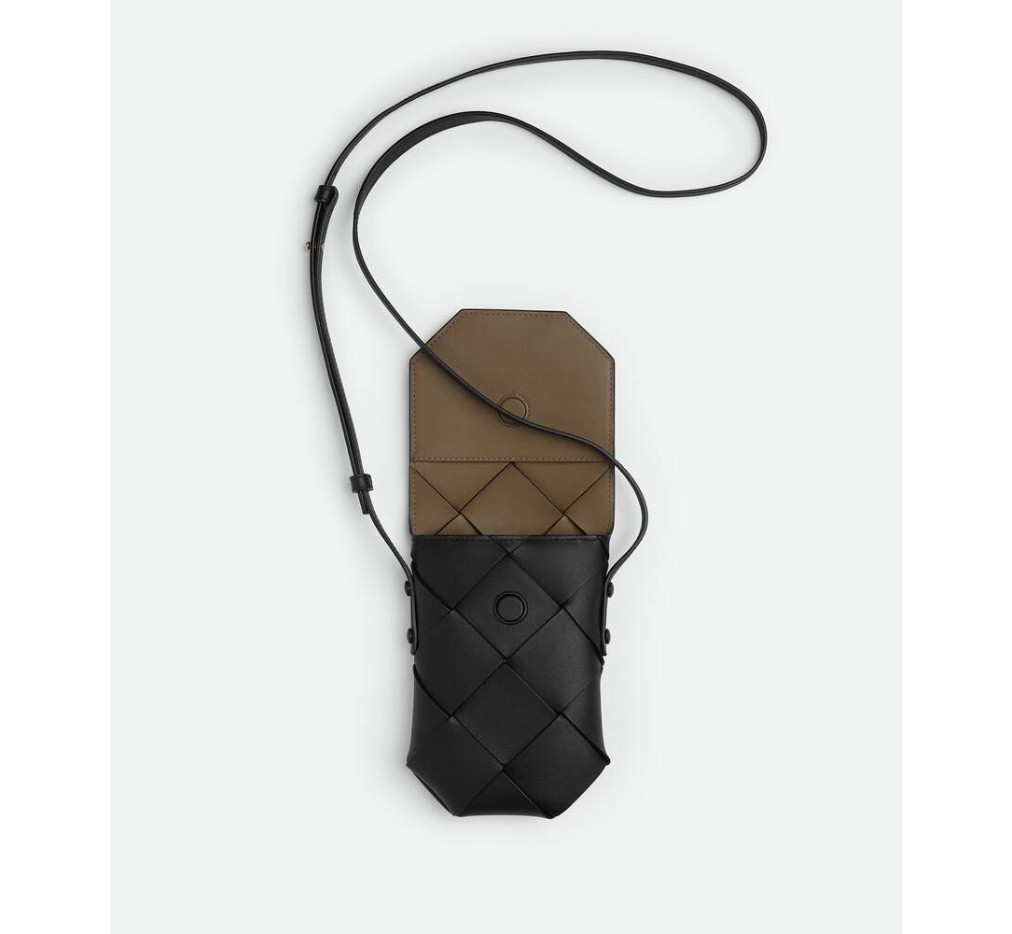 대조적인 내부 디자인의 송아지 가죽 휴대폰 파우치.
