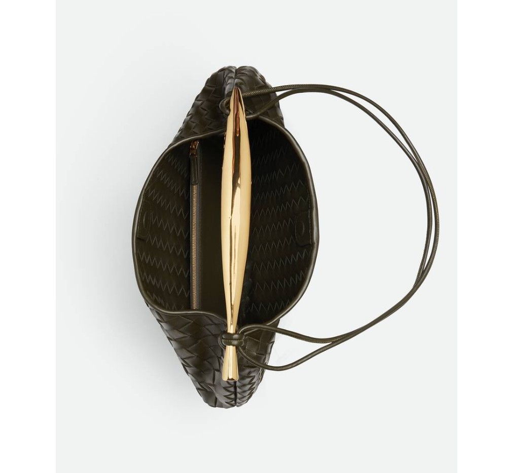 양가죽 소재의 인트레치아토 장인정신이 돋보이는 숄더백으로, 조각품 같은 금속 탑 핸들과 숄더 스트랩이 특징입니다.이 가방은 공예 인증서에 적합합니다.