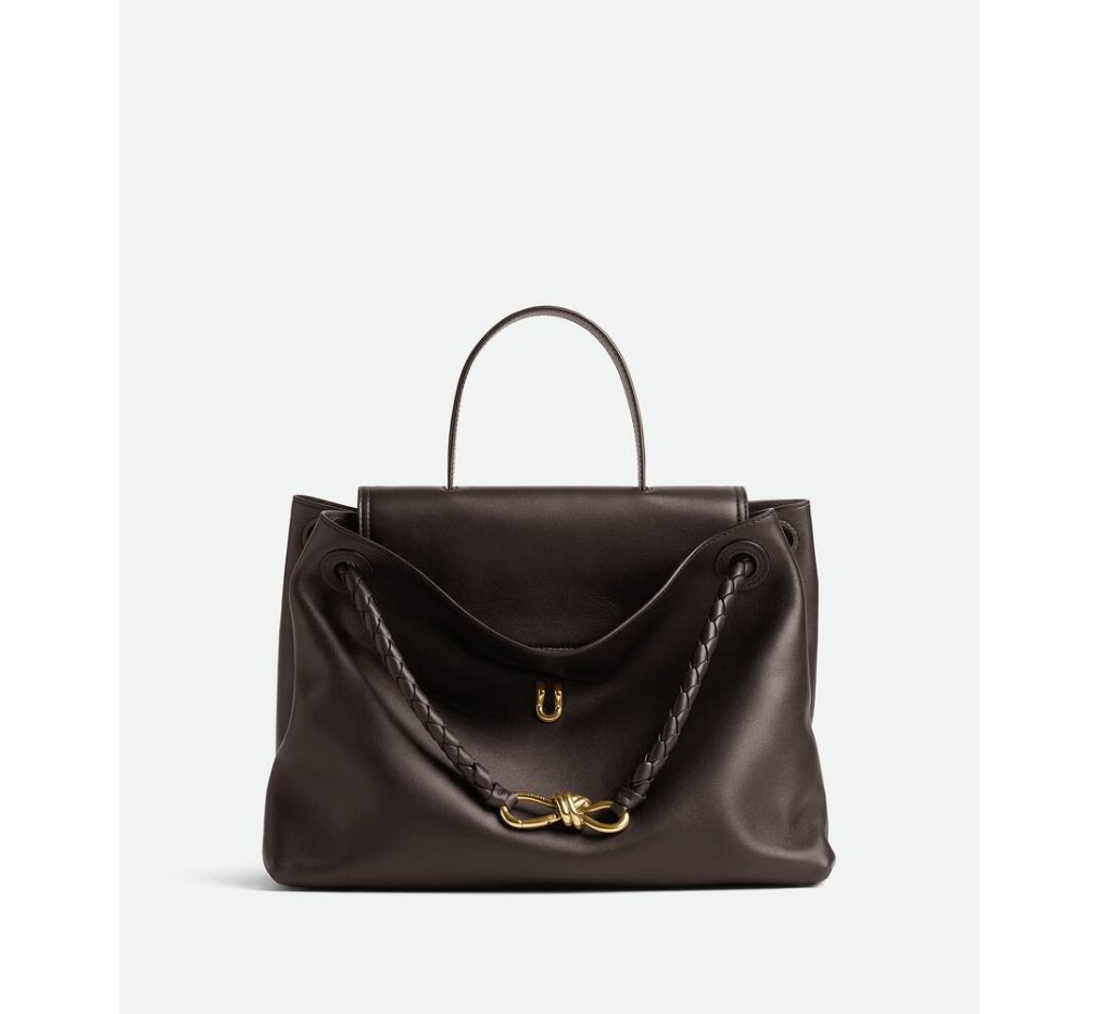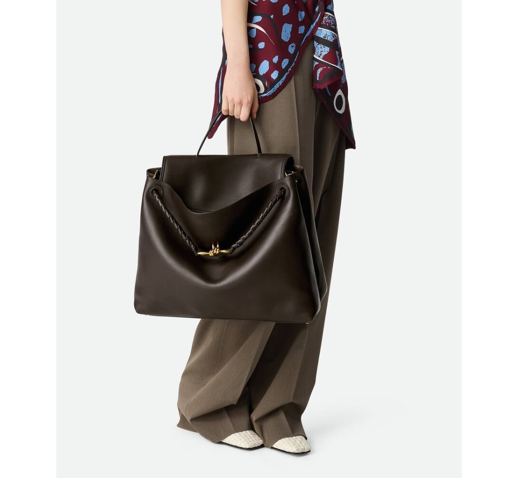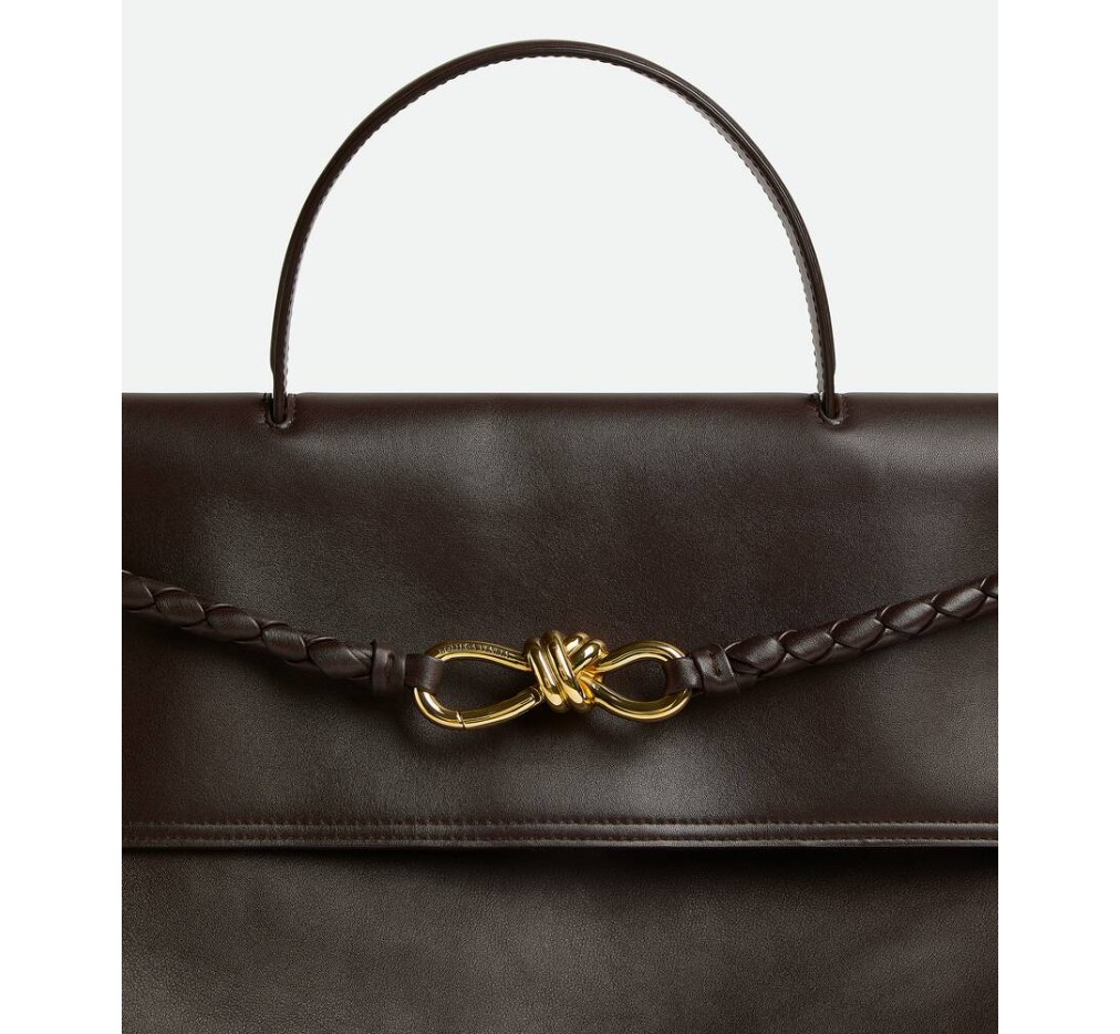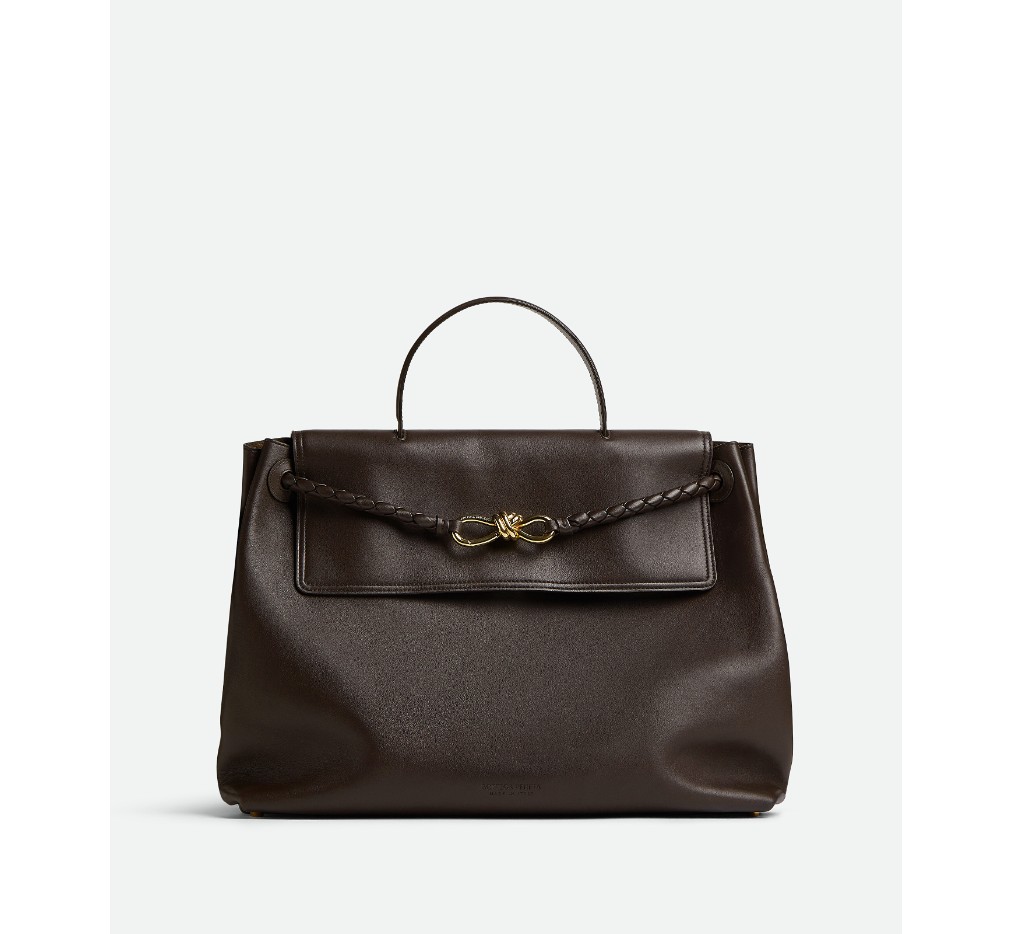 부드러운 송아지 가죽 소재의 탑 핸들 백으로, 양방향 플랩과 시그니처 매듭 디테일이 특징입니다. 숨겨진 후크 잠금 장치가 있어 플랩을 앞쪽에서 닫거나 내부 인트레치아토 포켓에 연결할 수 있습니다.– 라지 실키 송아지 가죽 탑 핸들 백 (투웨이 플랩)
