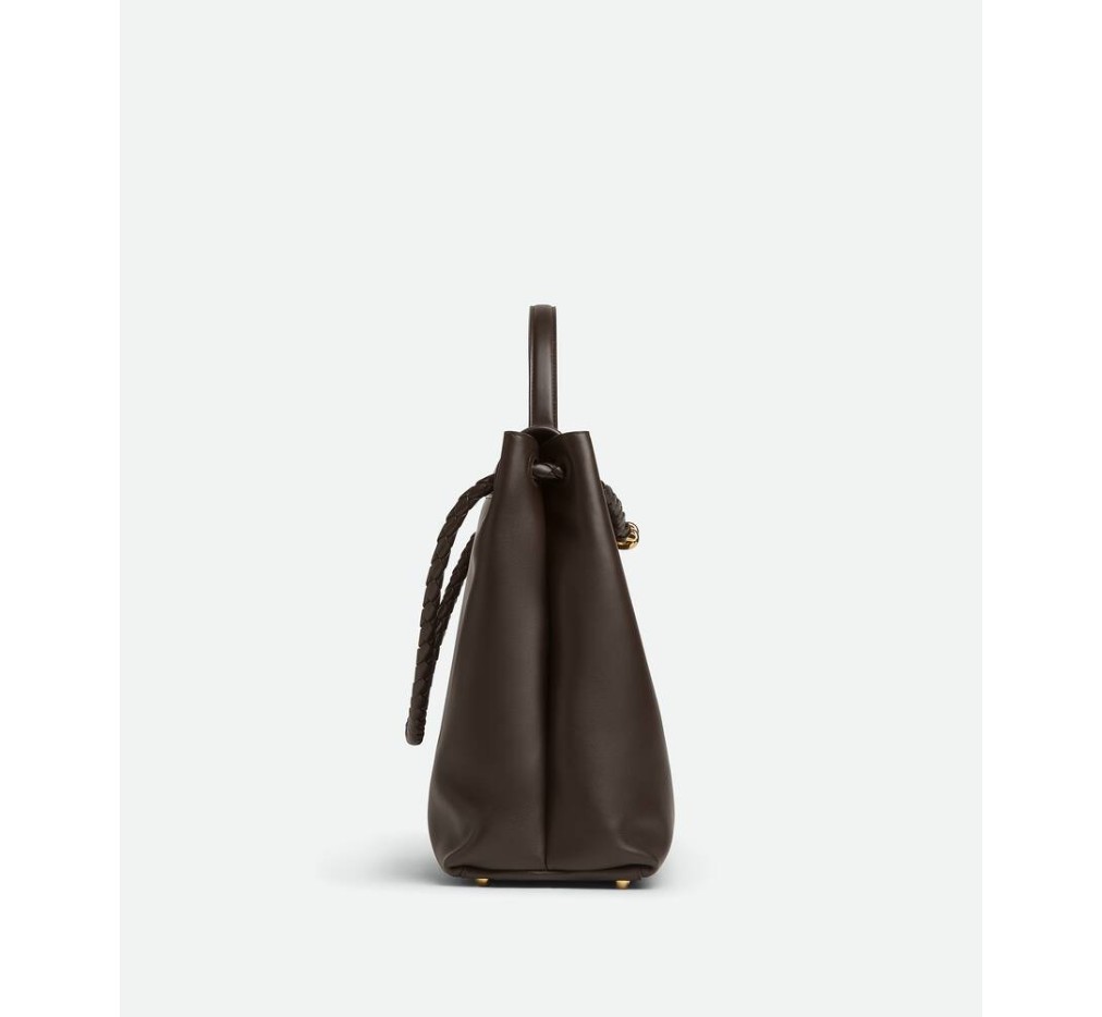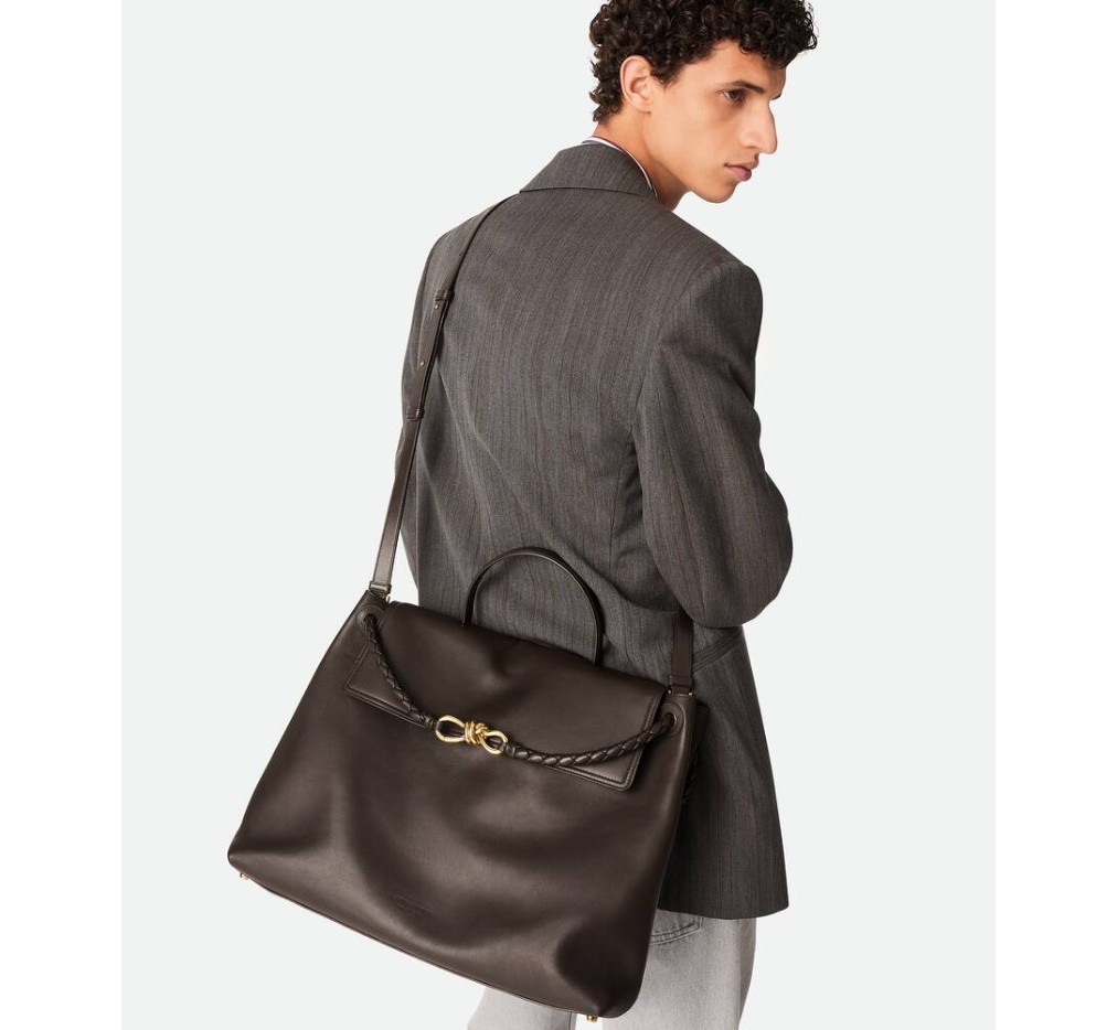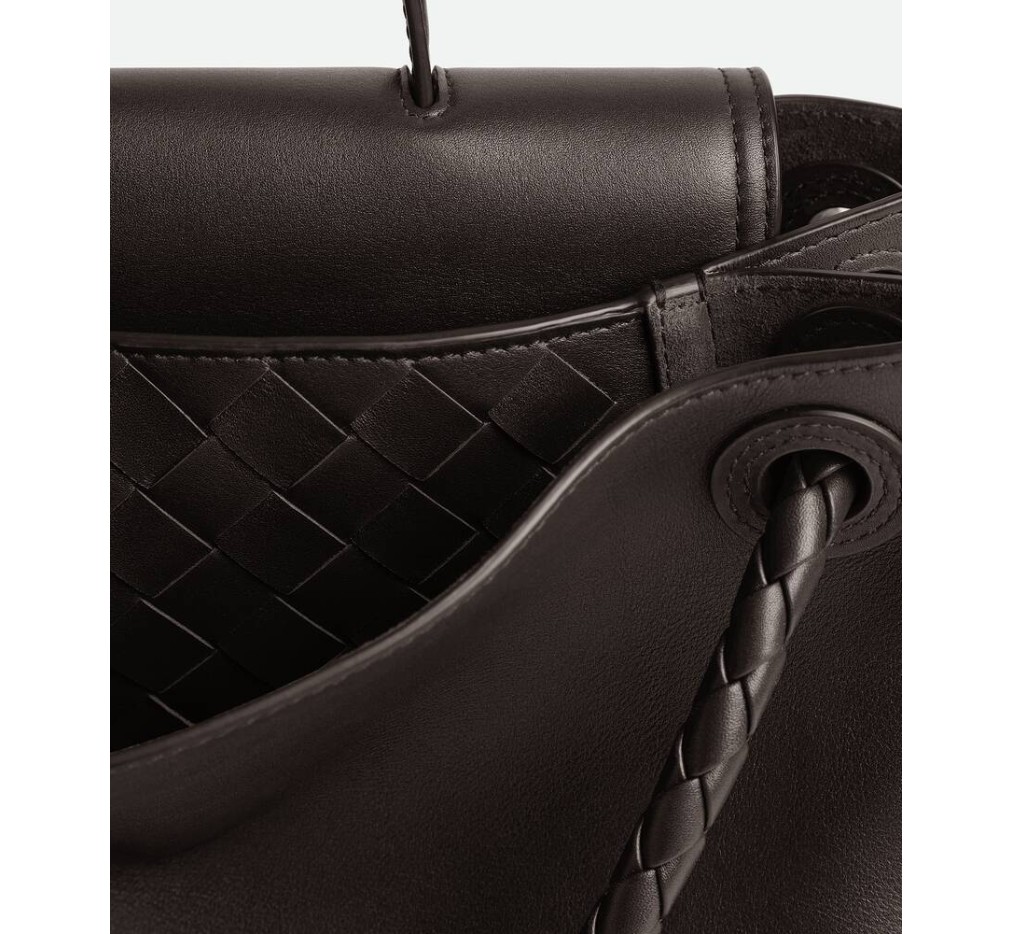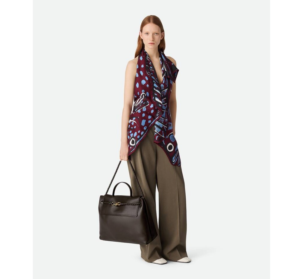 부드러운 송아지 가죽 소재의 탑 핸들 백으로, 양방향 플랩과 시그니처 매듭 디테일이 특징입니다. 숨겨진 후크 잠금 장치가 있어 플랩을 앞쪽에서 닫거나 내부 인트레치아토 포켓에 연결할 수 있습니다.– 라지 실키 송아지 가죽 탑 핸들 백 (투웨이 플랩)