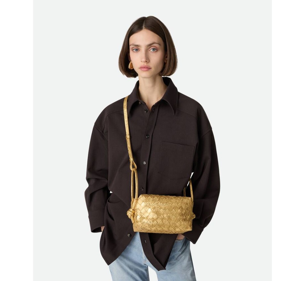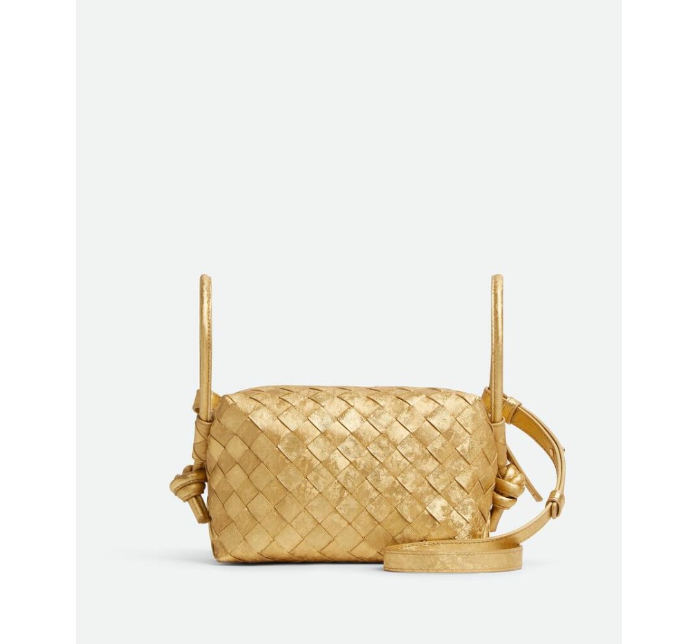 새틴 마감 처리된 인트레치아토 라미네이트 가죽 소재의 크로스바디 백으로, 더블 핸들과 분리형 스트랩이 특징입니다.