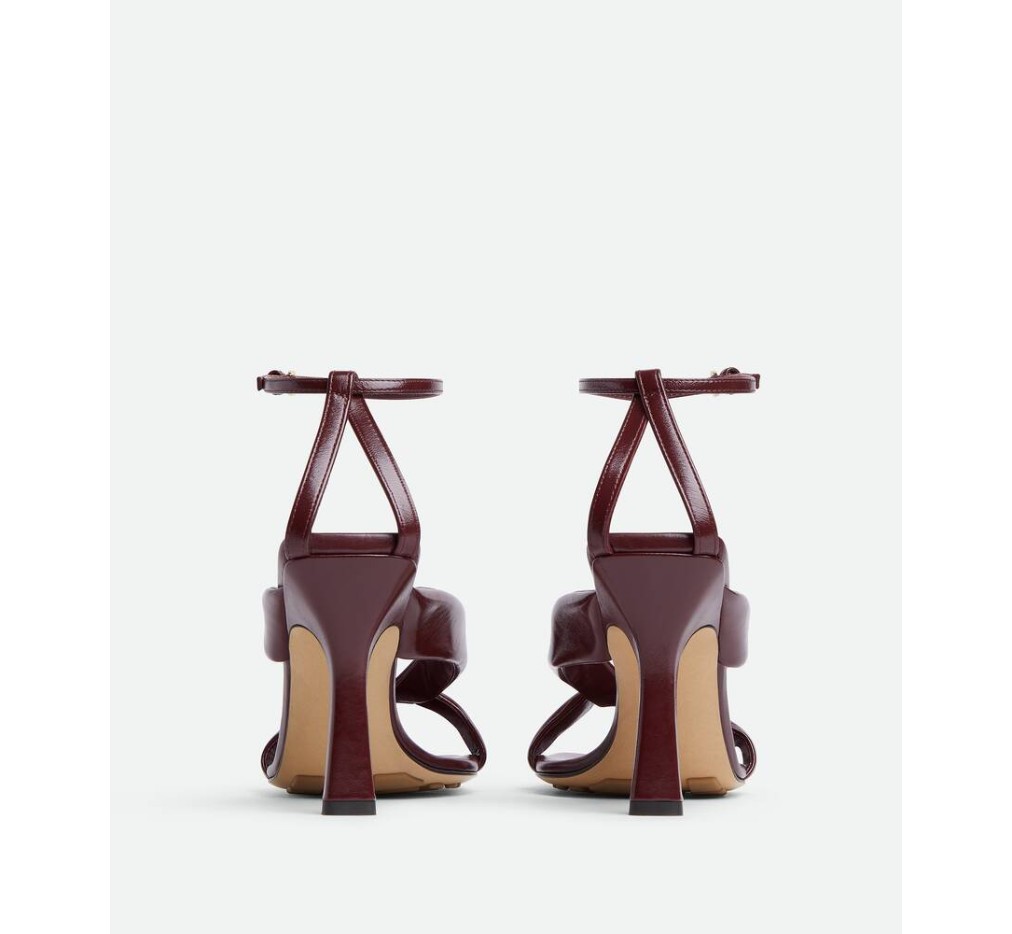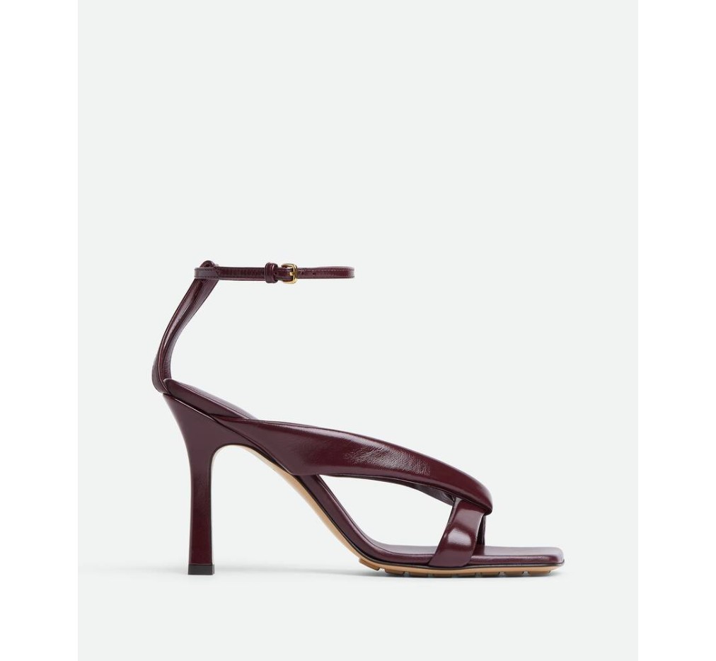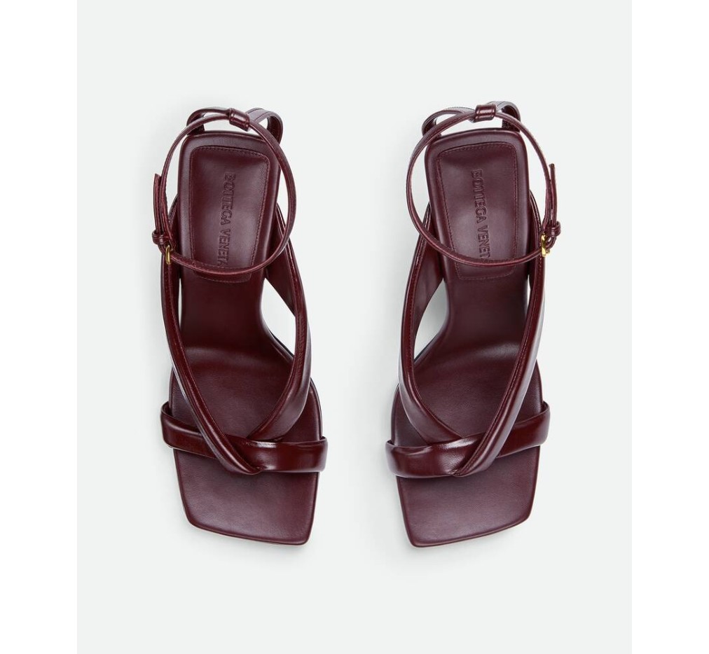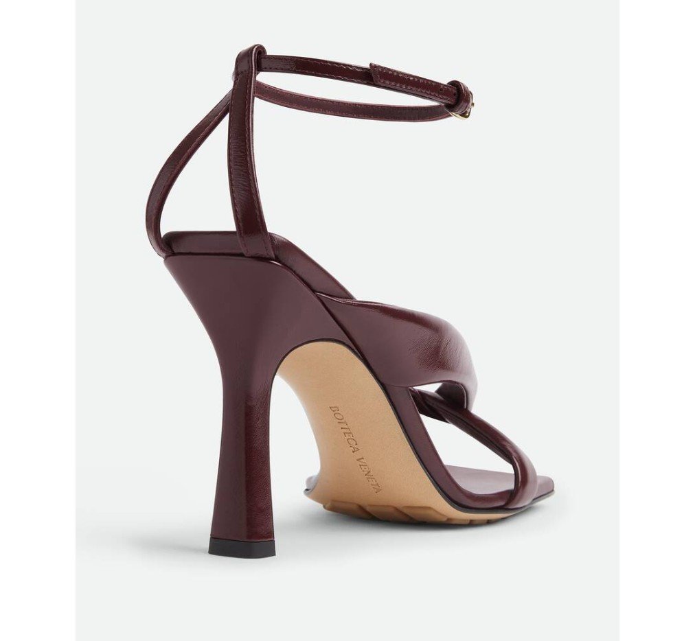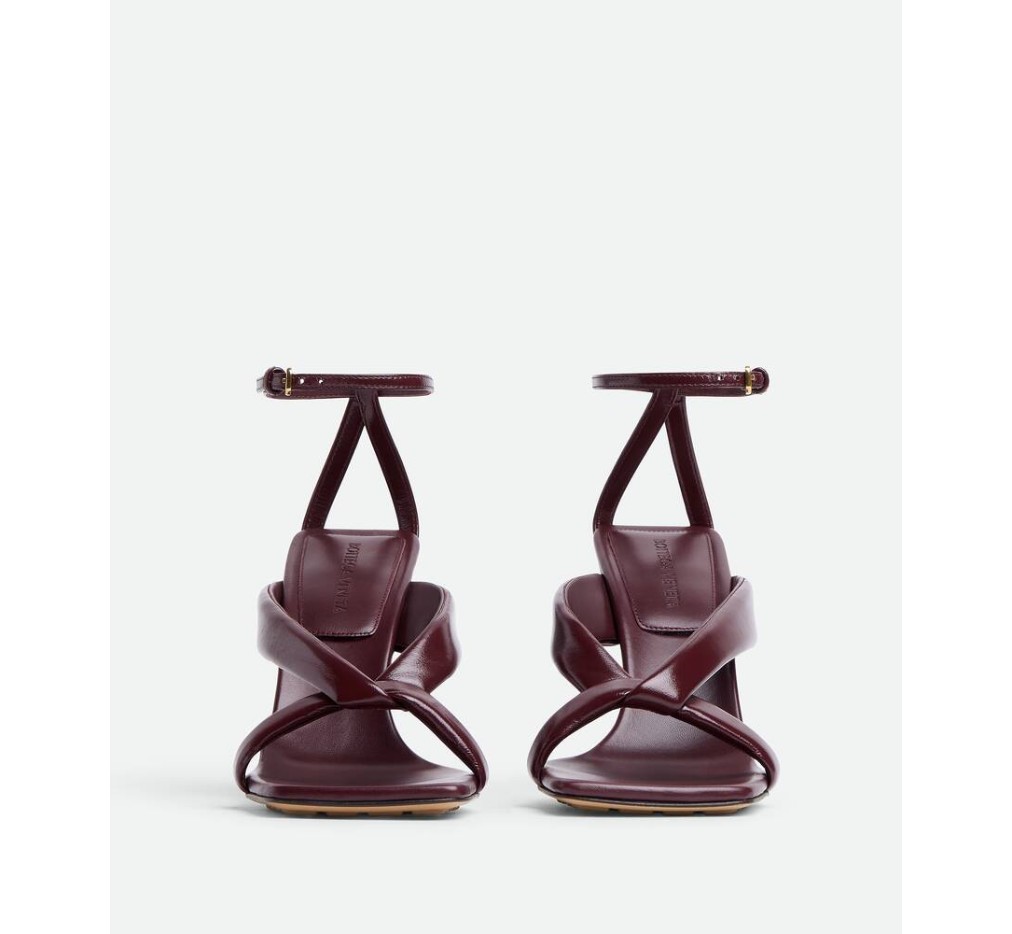 반짝이는 송아지 가죽으로 만든 앵클 스트랩 샌들로, 패딩 처리된 튜브형 스트랩과 꼬인 디자인이 특징입니다.