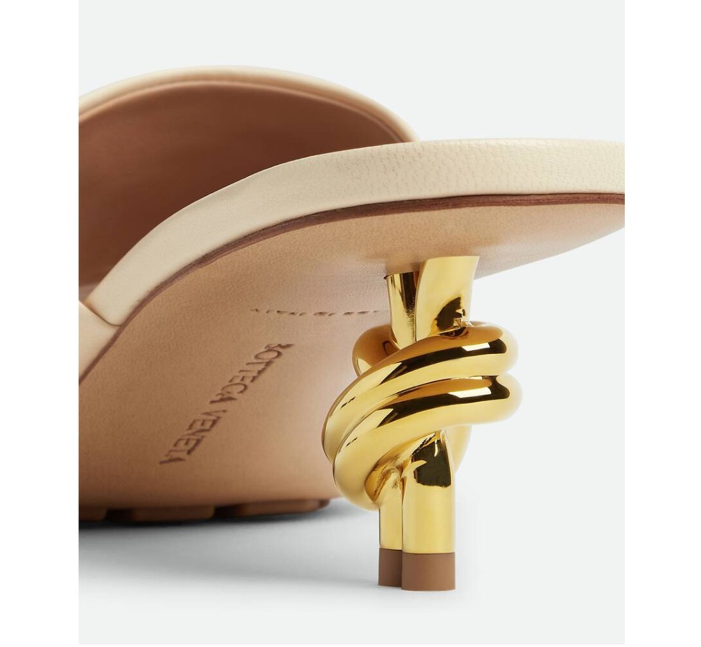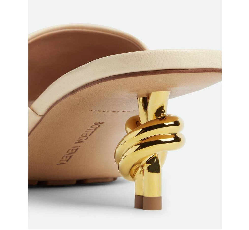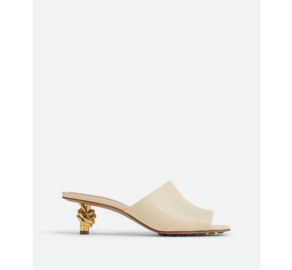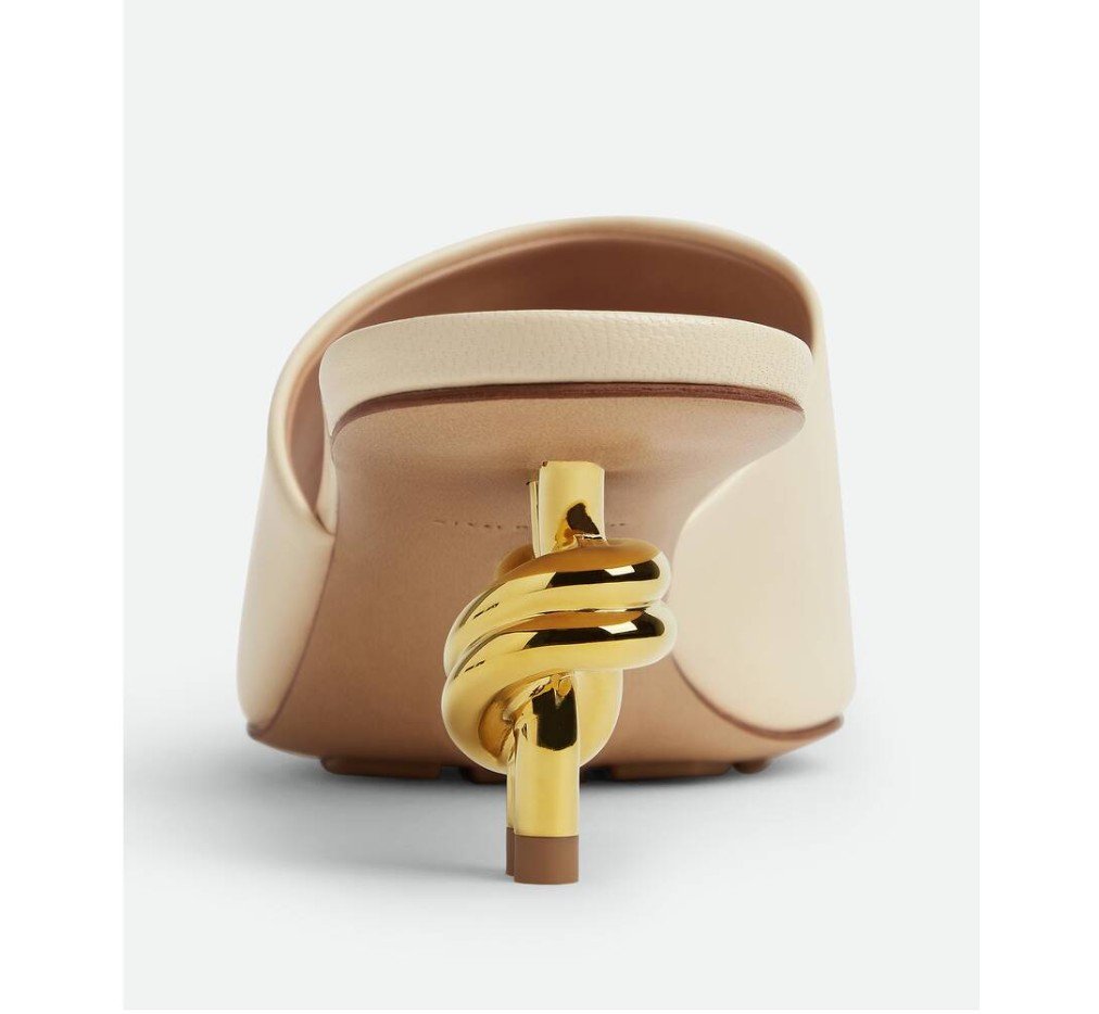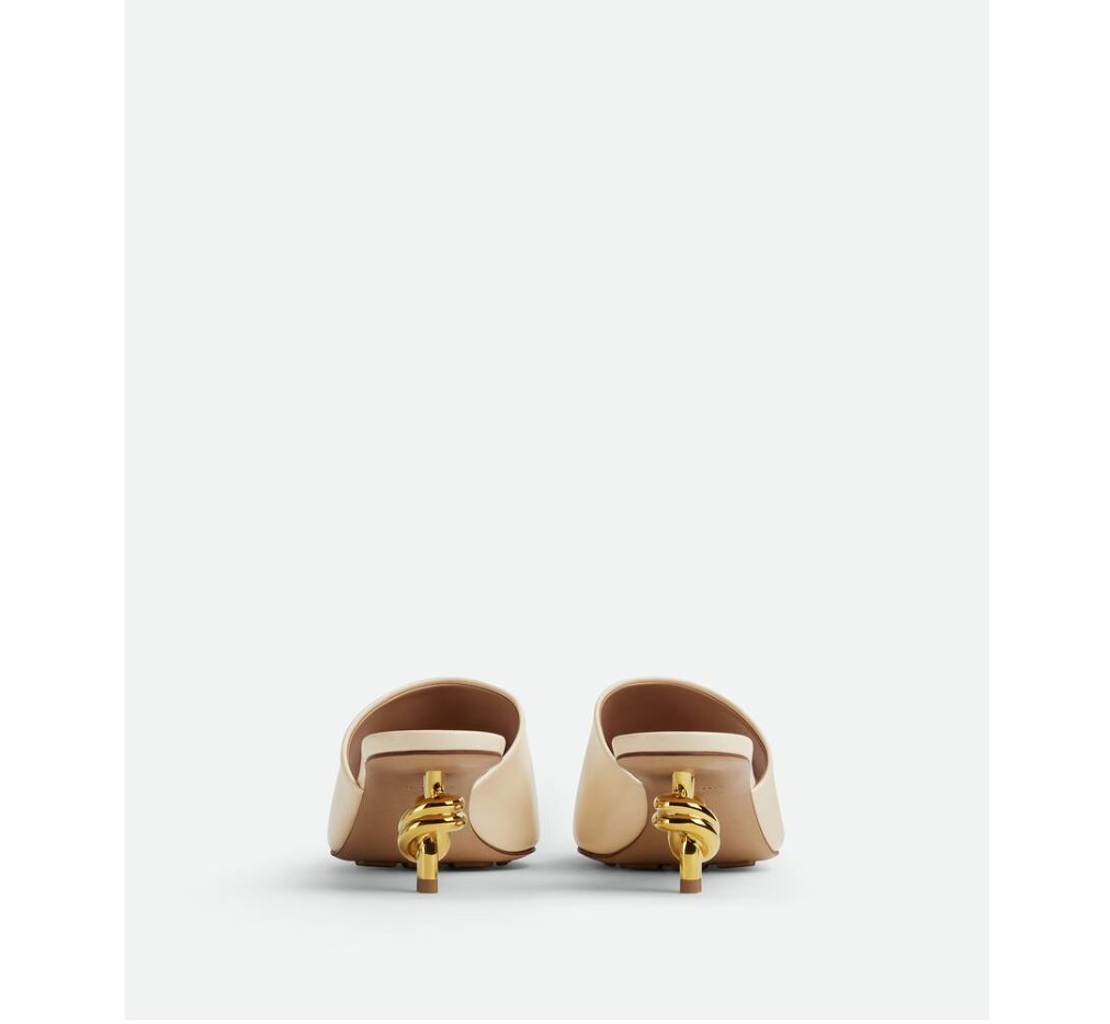 골드 마감 메탈 매듭 힐이 돋보이는 뮬. 부드러운 양가죽 소재로 제작되었습니다.