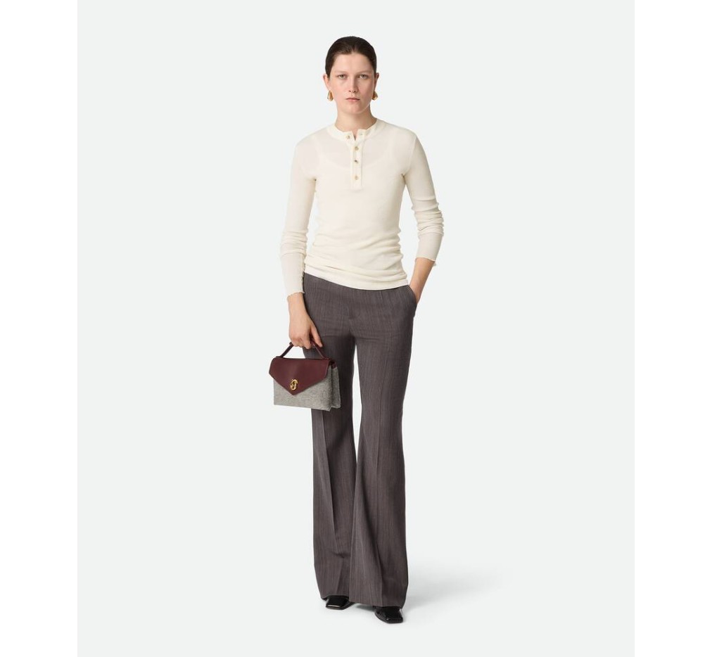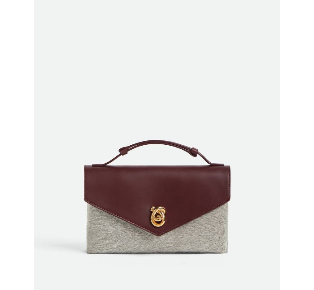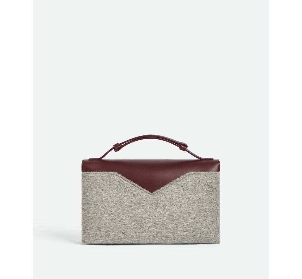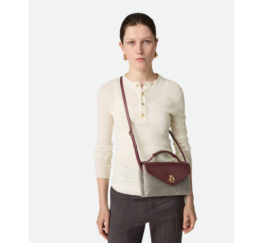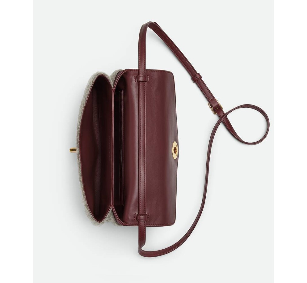 조절 가능한 상단 핸들과 조각품 같은 매듭 잠금 장치가 달린 펠트와 송아지 가죽 소재의 크로스바디 백입니다.