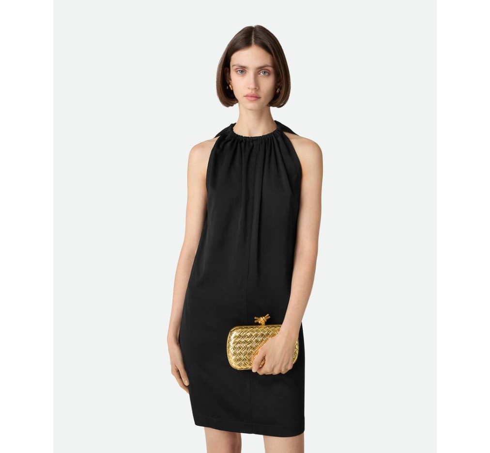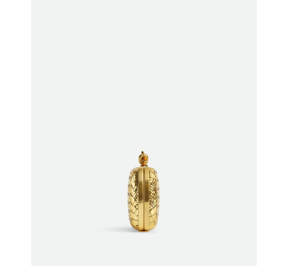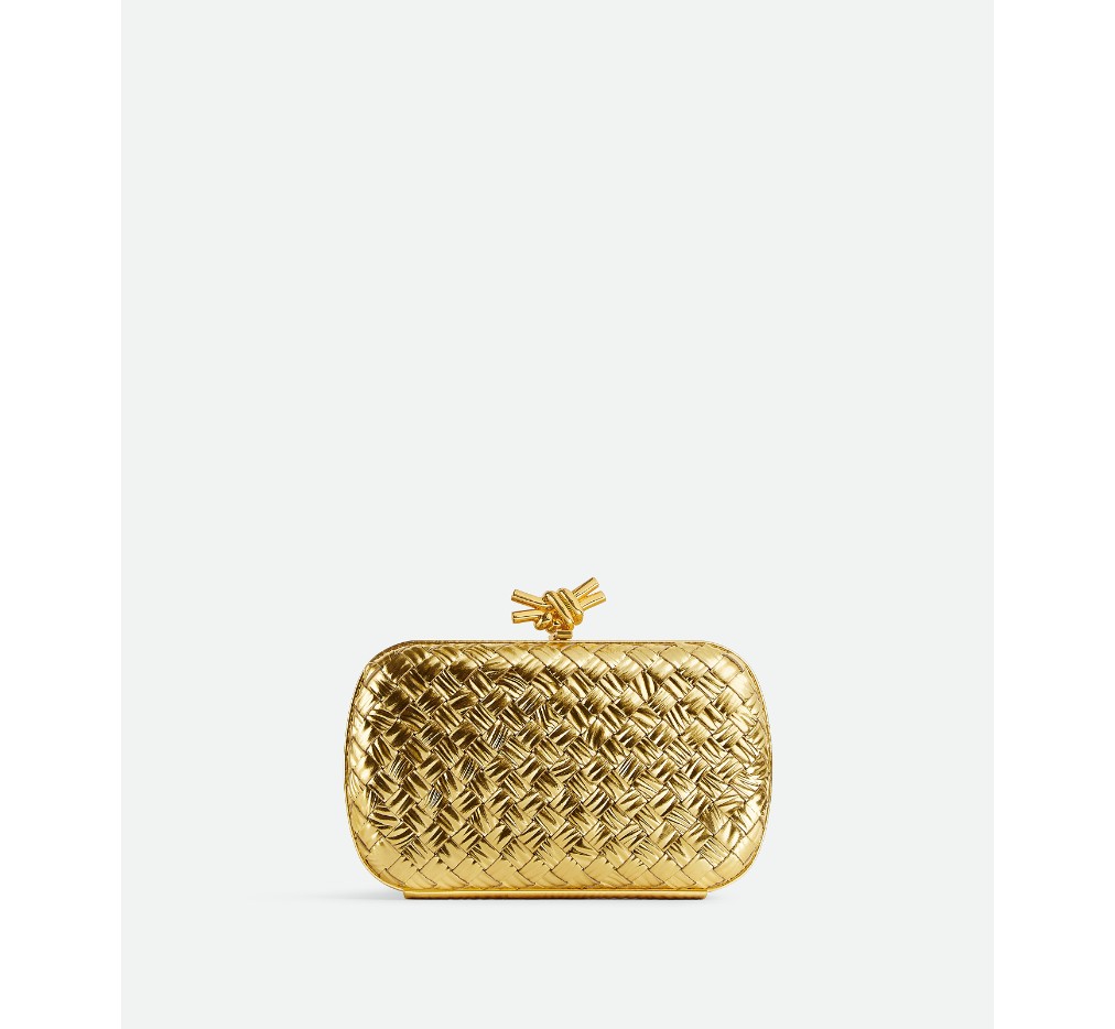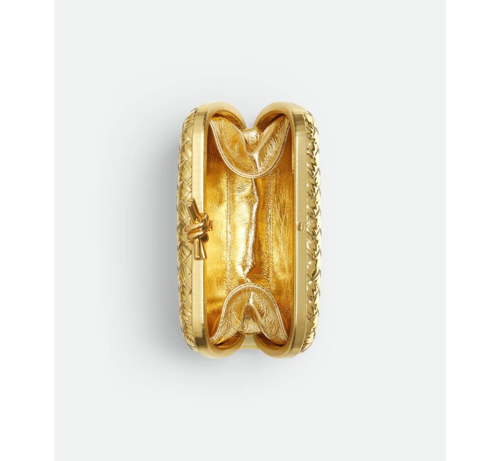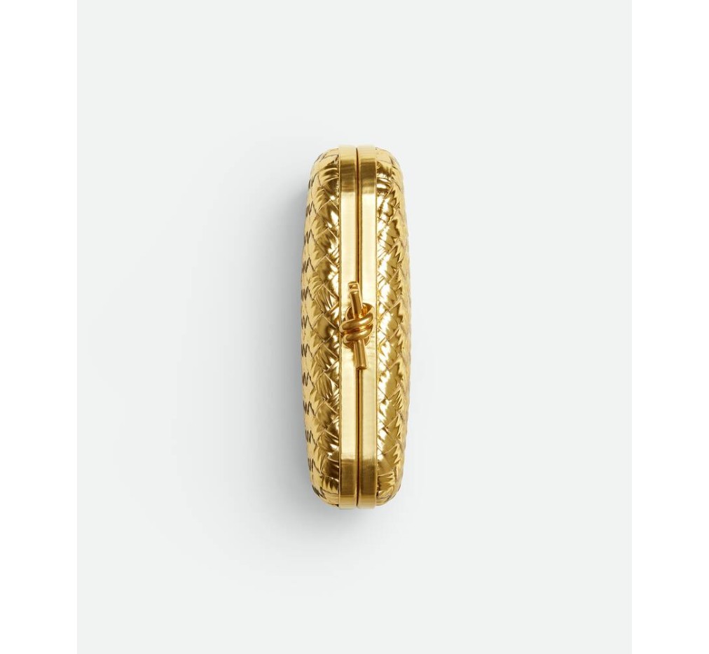 패딩 처리된 인트레치아토 목재 엠보싱 라미네이트 가죽으로 만든 미노디에르 클러치로, 시그니처 매듭 잠금 장치가 특징입니다.