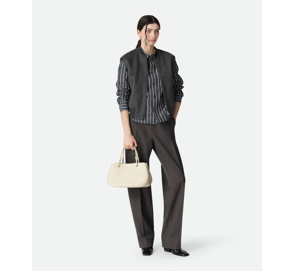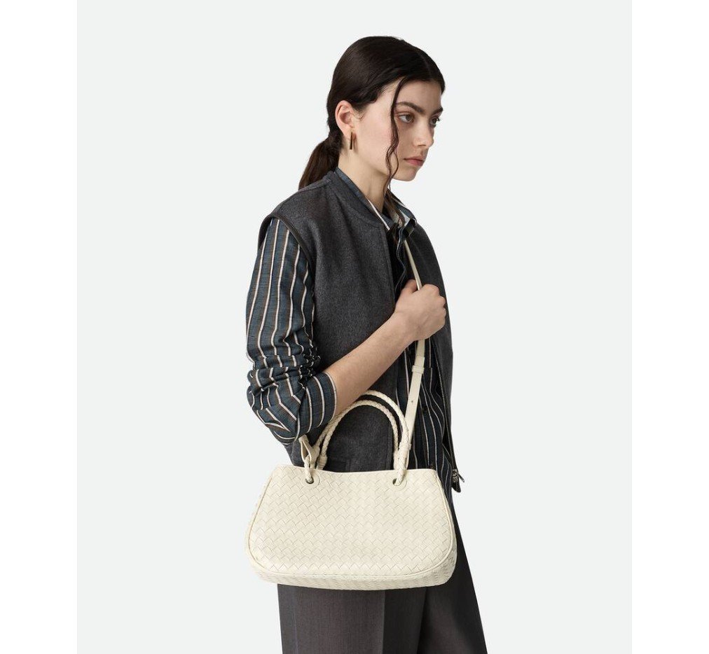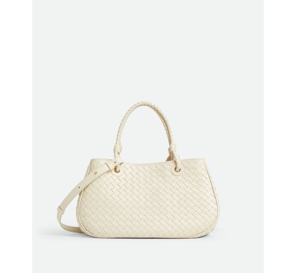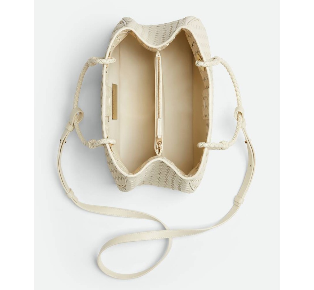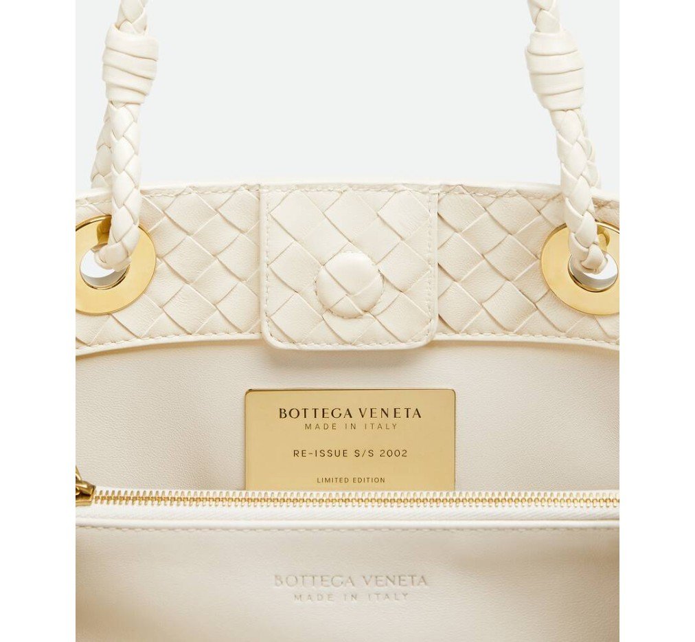 인트레치아토 피콜로 기법을 사용하여 부드러운 가죽으로 재현한 보관된 보테가 베네타 디자인입니다.