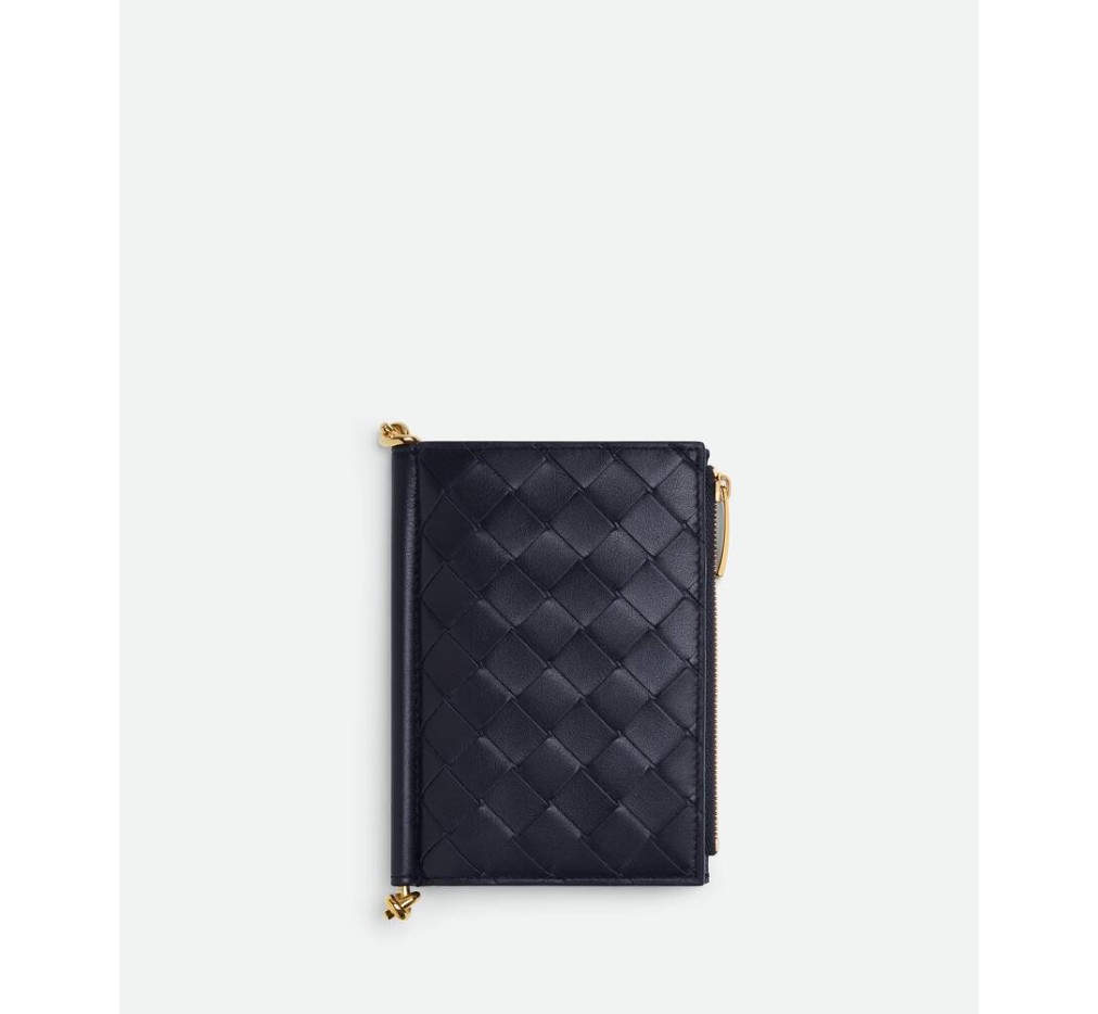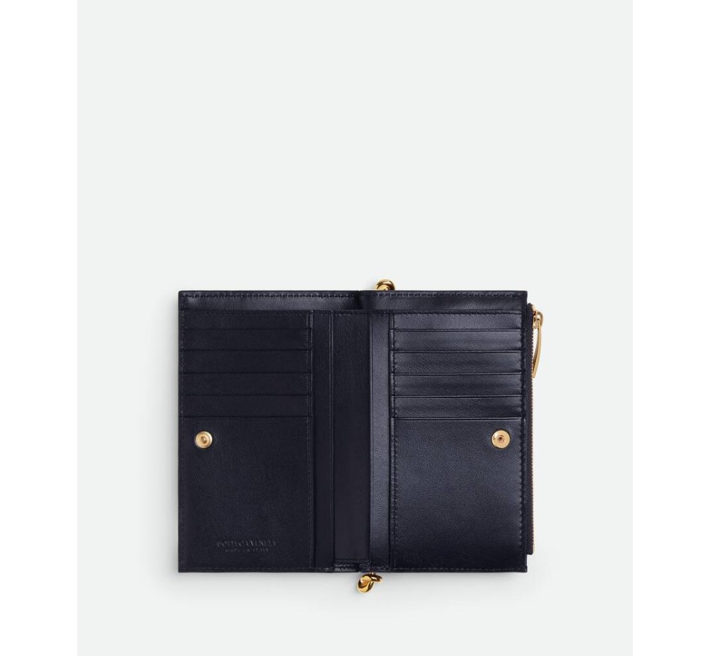 인트레치아토 송아지 가죽 소재의 중형 접이식 지갑으로, 시그니처 매듭 디테일이 특징입니다.