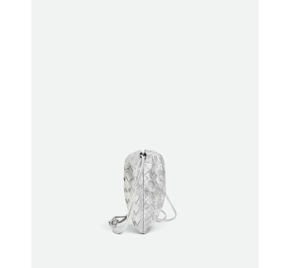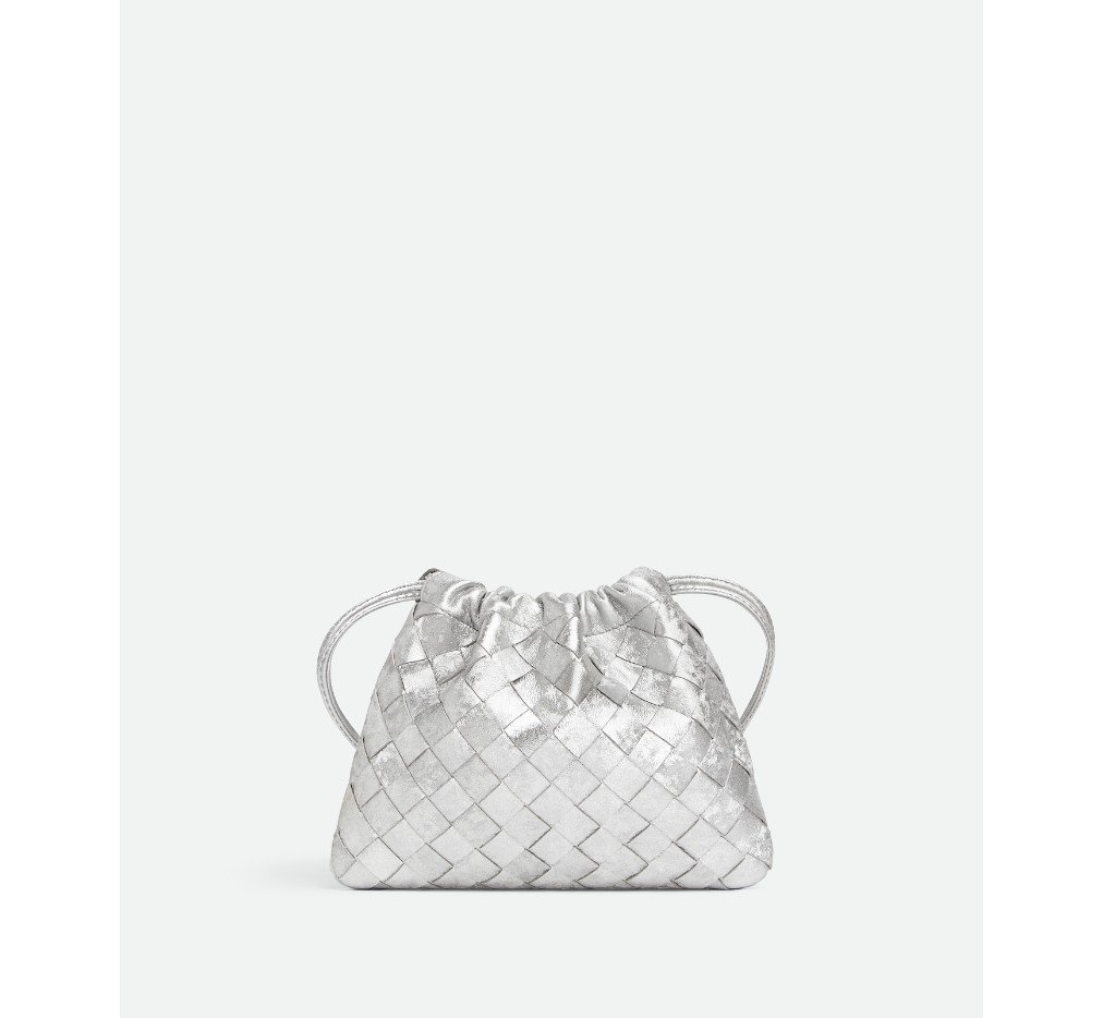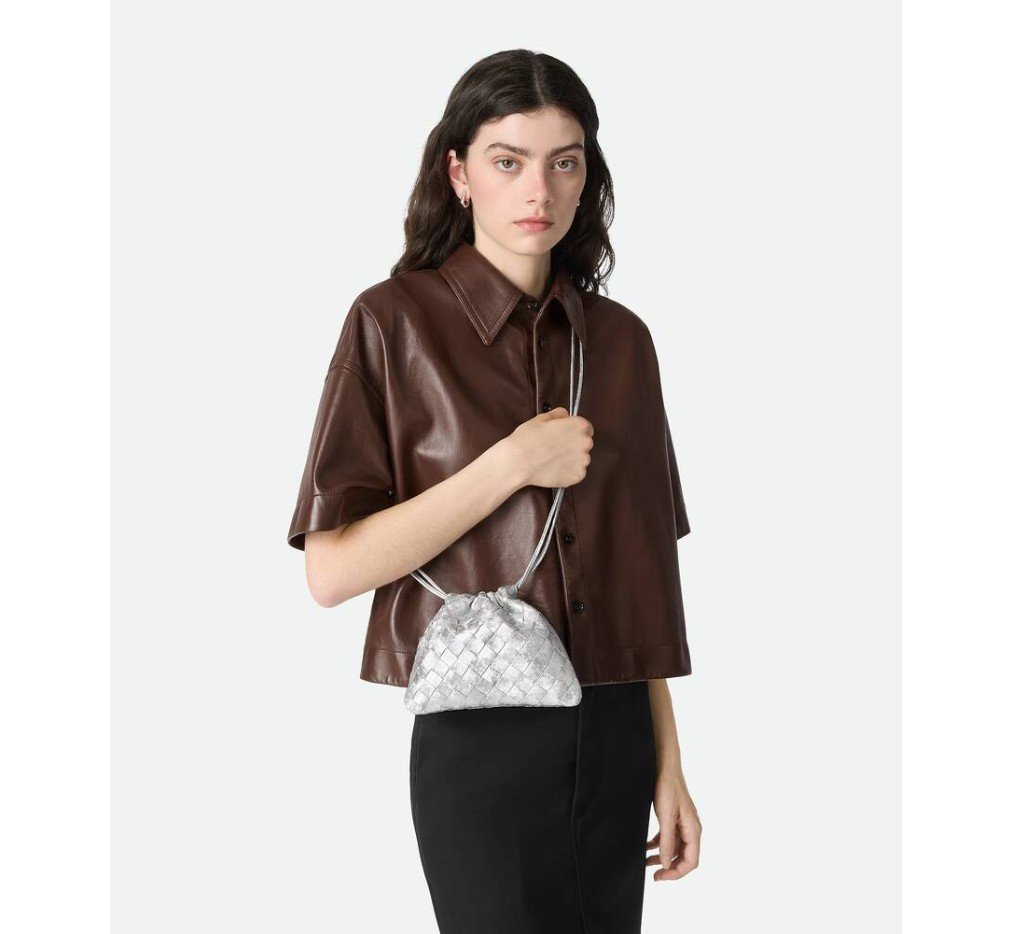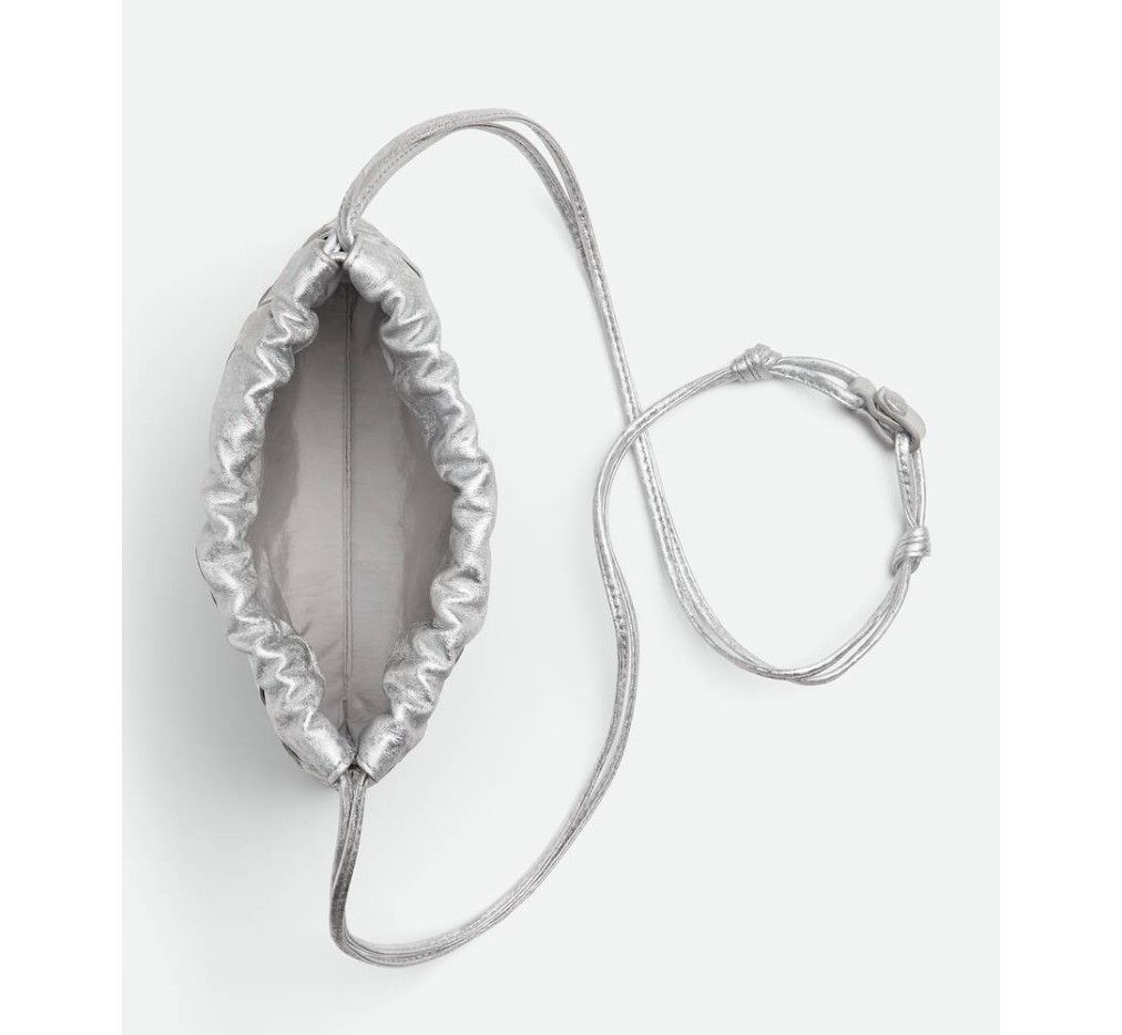 새틴 마감의 인트레치오 라미네이팅 가죽 소재의 스몰 더스트백. 끈으로 여닫는 방식과 크로스바디로 휴대할 수 있는 루프 부착 기능이 특징입니다.– 인트레치아토 라미나 새틴 가죽 파우치