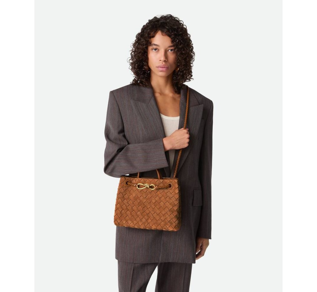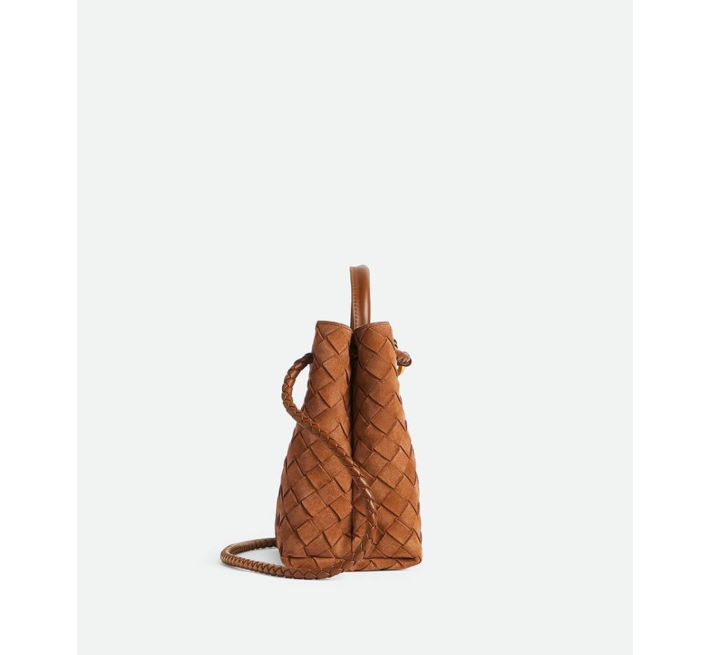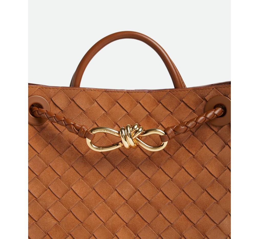 시그니처 매듭 디테일과 슬라이딩 크로스바디 스트랩이 특징인 인트레치아토 스웨이드 탑 핸들 백.– 스몰 인트레치아토 스웨이드 탑 핸들 백 (슬라이딩 크로스바디 스트랩 포함)