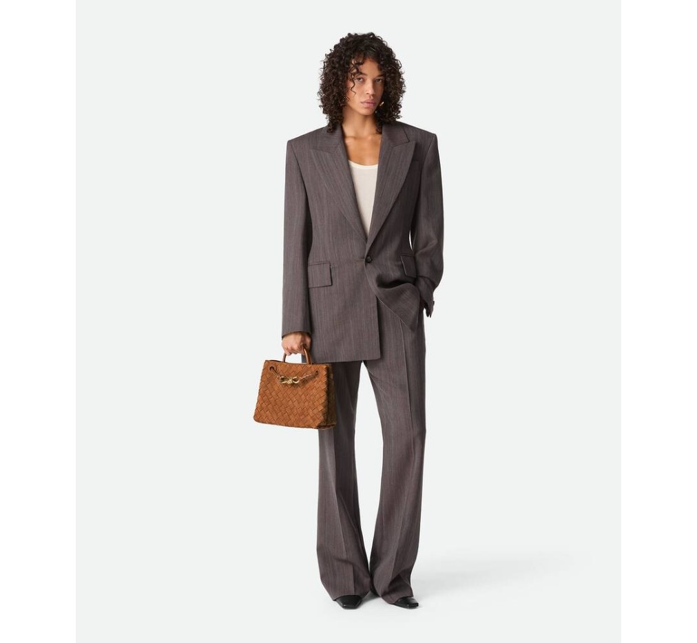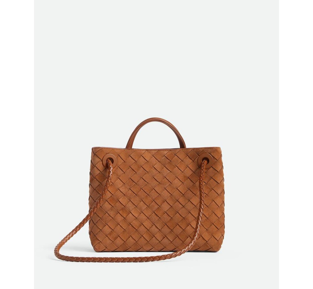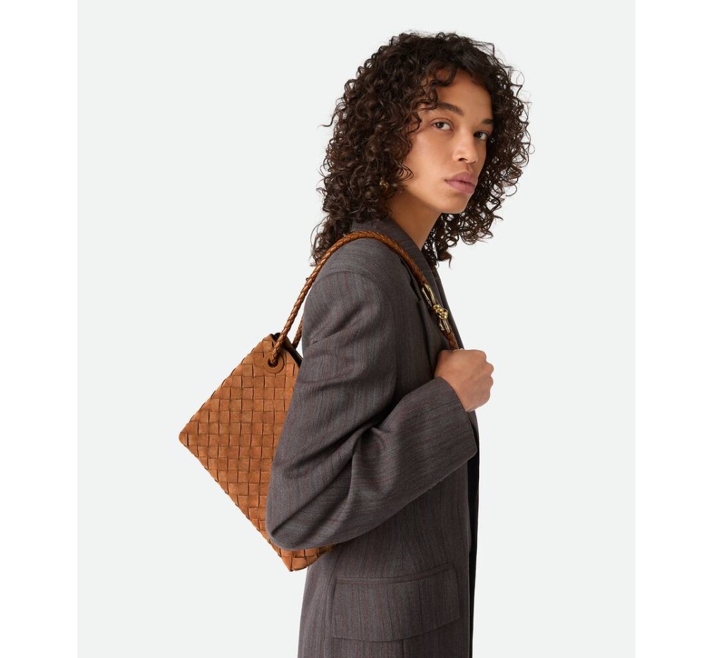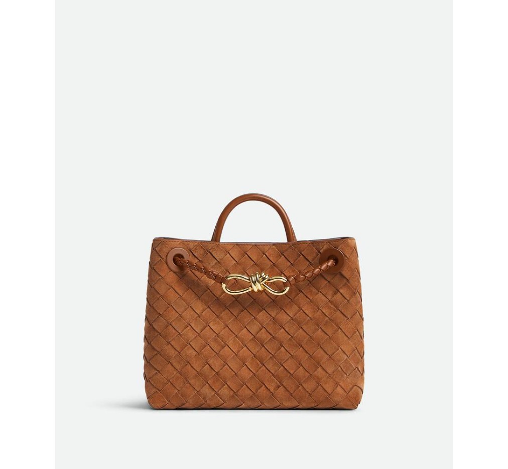 시그니처 매듭 디테일과 슬라이딩 크로스바디 스트랩이 특징인 인트레치아토 스웨이드 탑 핸들 백.– 스몰 인트레치아토 스웨이드 탑 핸들 백 (슬라이딩 크로스바디 스트랩 포함)