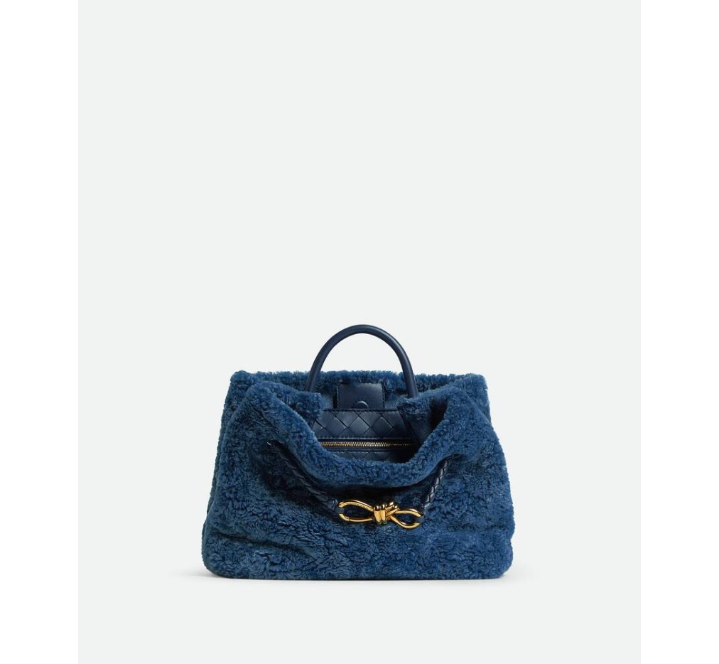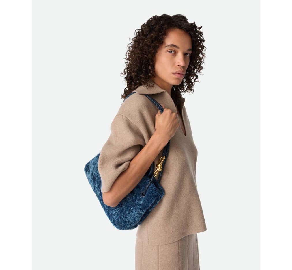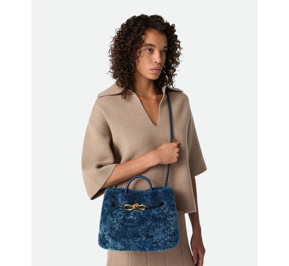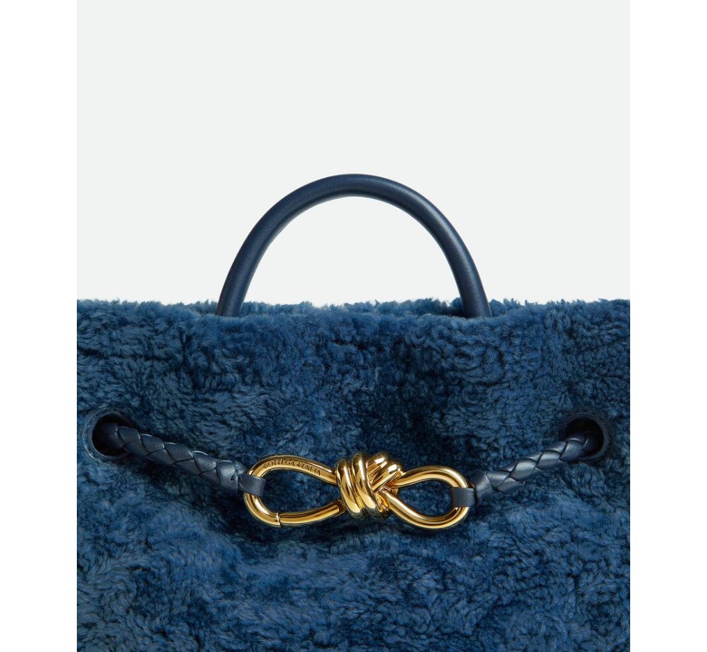 데님 효과가 가미된 메리노 시어링 탑 핸들 백. 시그니처 매듭 디테일과 슬라이딩 크로스바디 스트랩이 특징입니다.– 스몰 메리노 시어링 탑 핸들백 (슬라이딩 크로스바디 스트랩 포함)